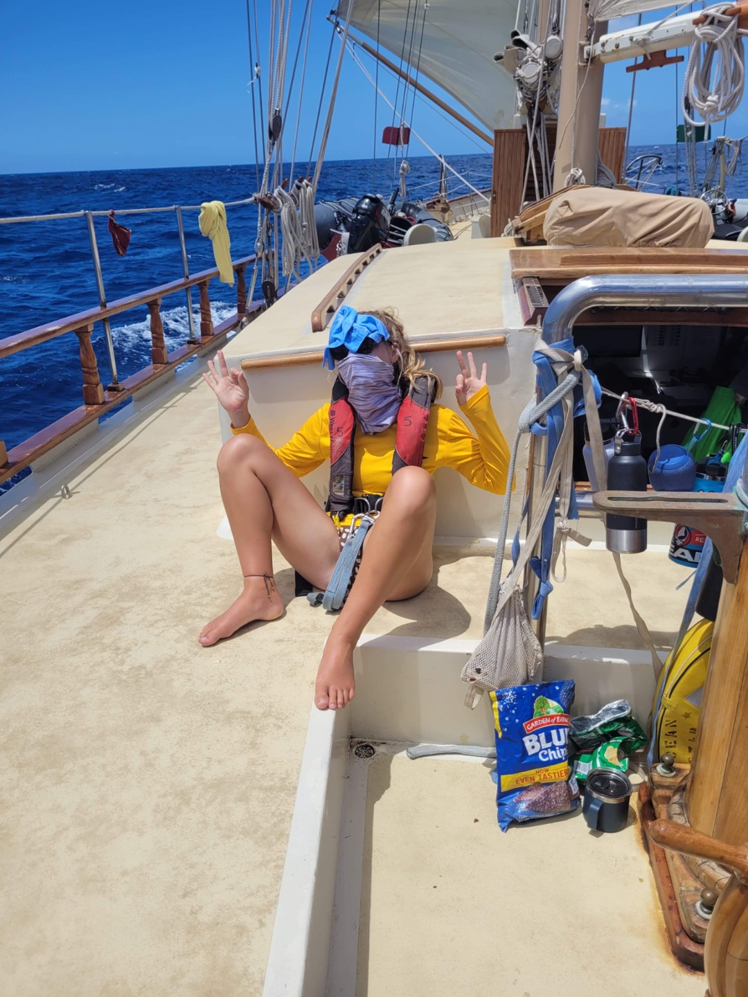As we’re getting clean up going, we see whales! We believe it to be a baby and mother whale. It was such a nice moment – a rare occasion on O Star – when we heard arguing! Everyone turns to find Sarah and Sunny in a full-on fistfight. Just full-on punches to the face, stomach. One to the throat, just duking it out over a Sunny stealing Sarah’s sprite and Sarah tripping Sunny. The fight slows down as they both wear out, and then Sunny straightens up and sighs and apologizes. Sarah, a bit wary, nods and accepts and goes in for a hug, but Sunny then pushes out her arms, forcing Sarah back and causing her to trip on a D-ring which sends Sarah overboard. Sunny looks up at everyone, shrugs, pull down her sunglasses, and skips away – as Sarah fights for her life in the ocean.