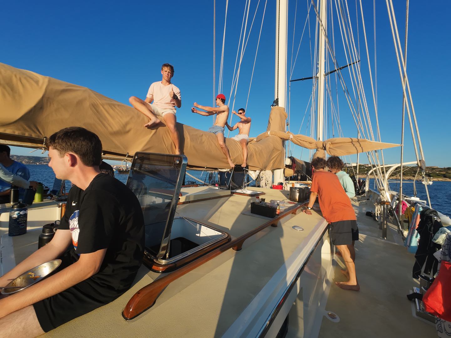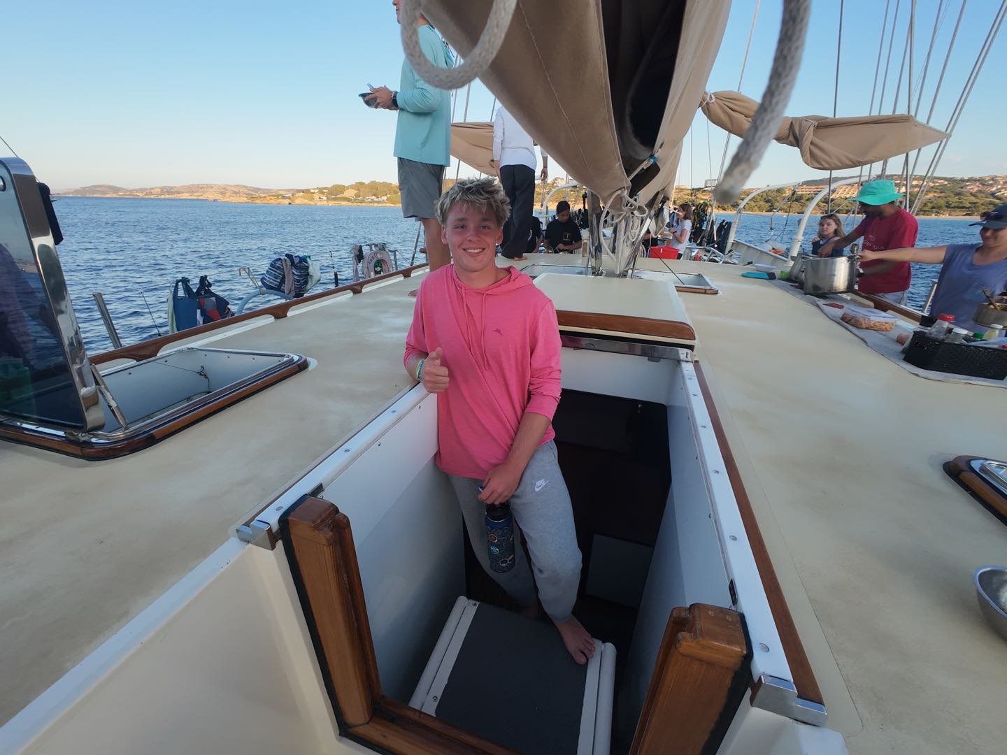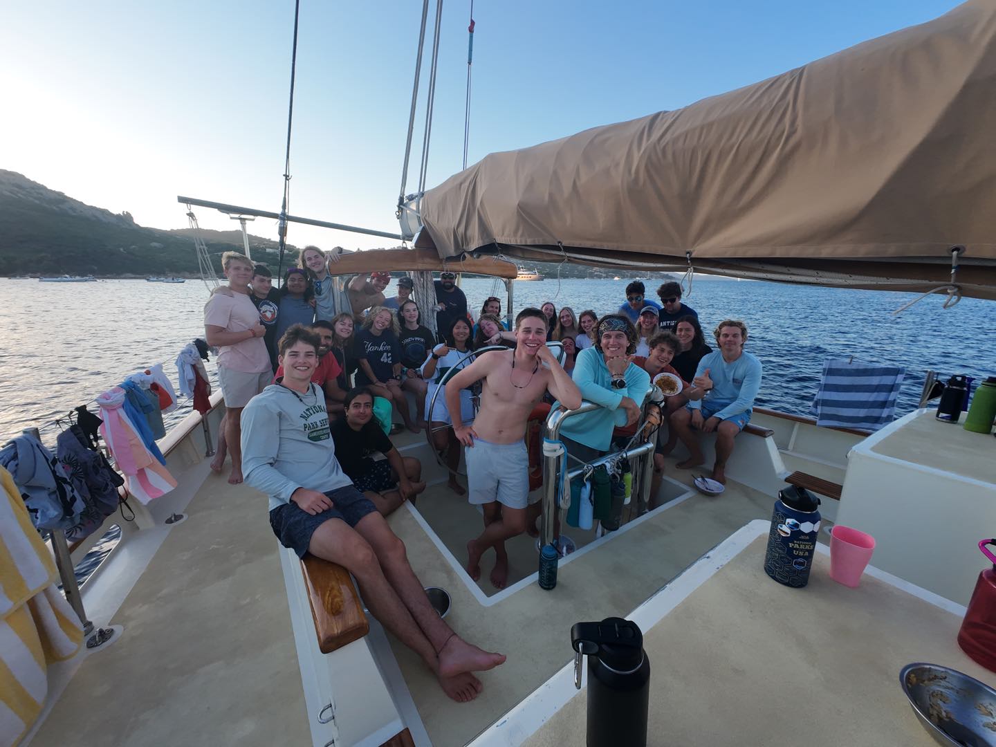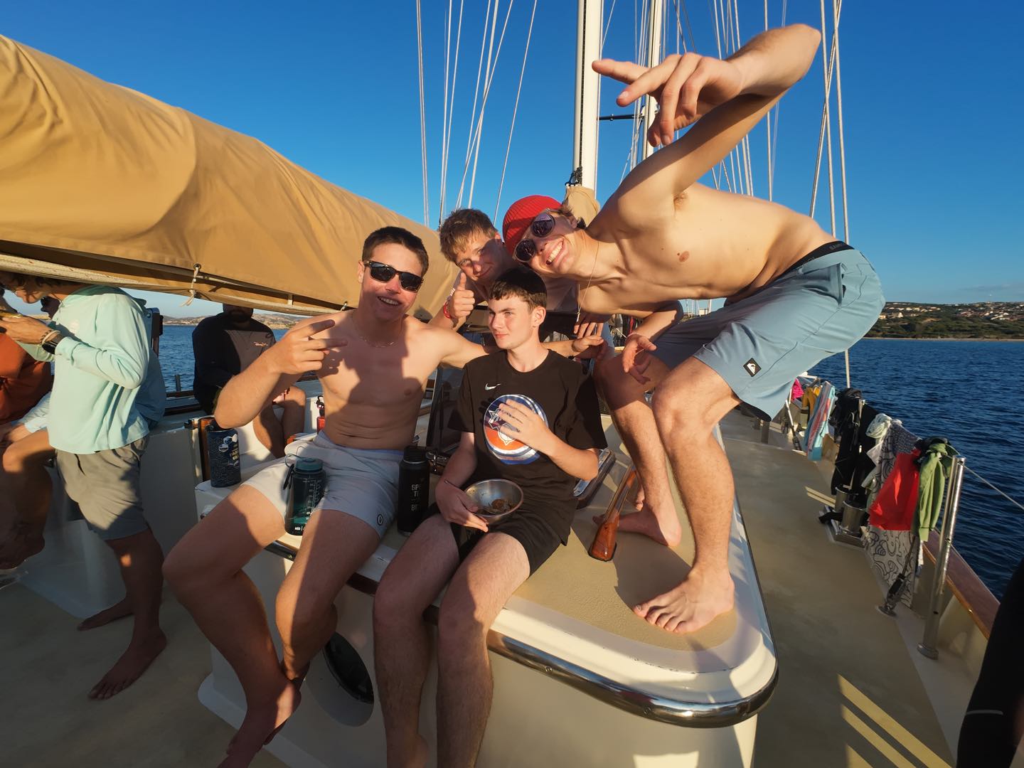 Meanwhile my group and I took some quizes on recreational dive planners.. which was not easy. Then lunch came around, and everybody was back from their dive, and my group was all finished with the lesson. We eat lunch, and now iit’smy ggroup’sturn to tackle the open water dives off the boat, and the certified divers do a dive for advanced. In my group, it was me, Luca, Samantha, Chloe, and our amazing teacher, Nacho, so shout out to Nacho for being the best teacher and making our dives so much fun. We did some skills underwater and explored a bit. My favorite part had to have been when Nacho points out something in the seagrass on the ocean floor and Luca goes to grab it, thinking it was a piece of trash, but in reality it was a starfish (that was a big no-no). Also, another great part of the dive was messing with Luca, which he did not like at all. We eventually finish up with our two dives, and now I am exhausted. We wash off all of our gear and put it away, I take an amazing ocean shower, and then get straight into comfy clothes and go take a nap out on the net at the bow of the boat with Teo, Luca, Teegan, and Alexa.It was amazing. Then we had intro to oceanography, which was great because Nacho is teaching the class. After we head to dinner and enjoy a great meal made by Shane, with Bryson and Teo being his sous chef. We clean up and head to the intro to seamanship, which is taught by Shane. Nighttime comes around, and everyone gets their phone back, and I’m sure everyone is going to be calling and texting their parents and friends. I am super tired now and super thankful I do not have anchor watch tonight because I am exhausted, and tonight is the first night it might rain. Everyone get their foul-weather gear ready!!!