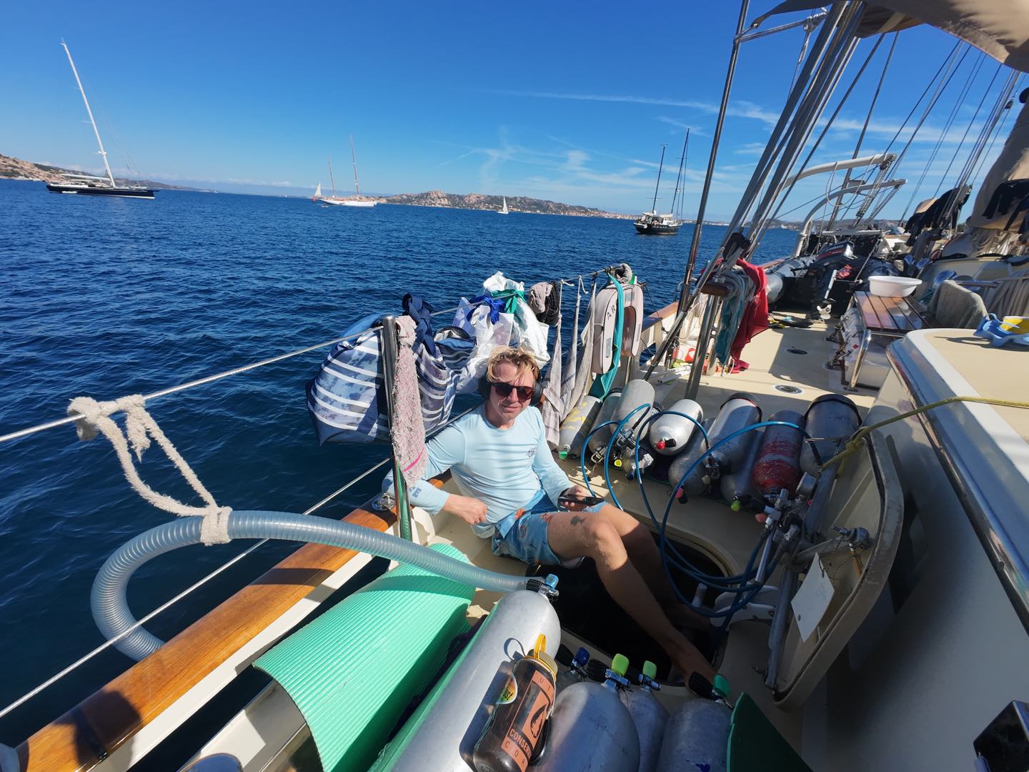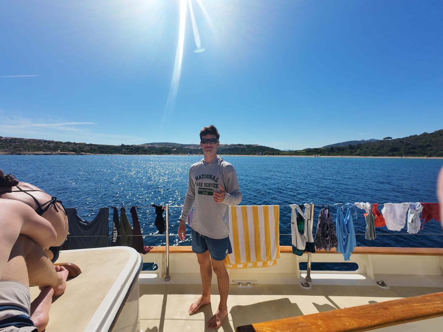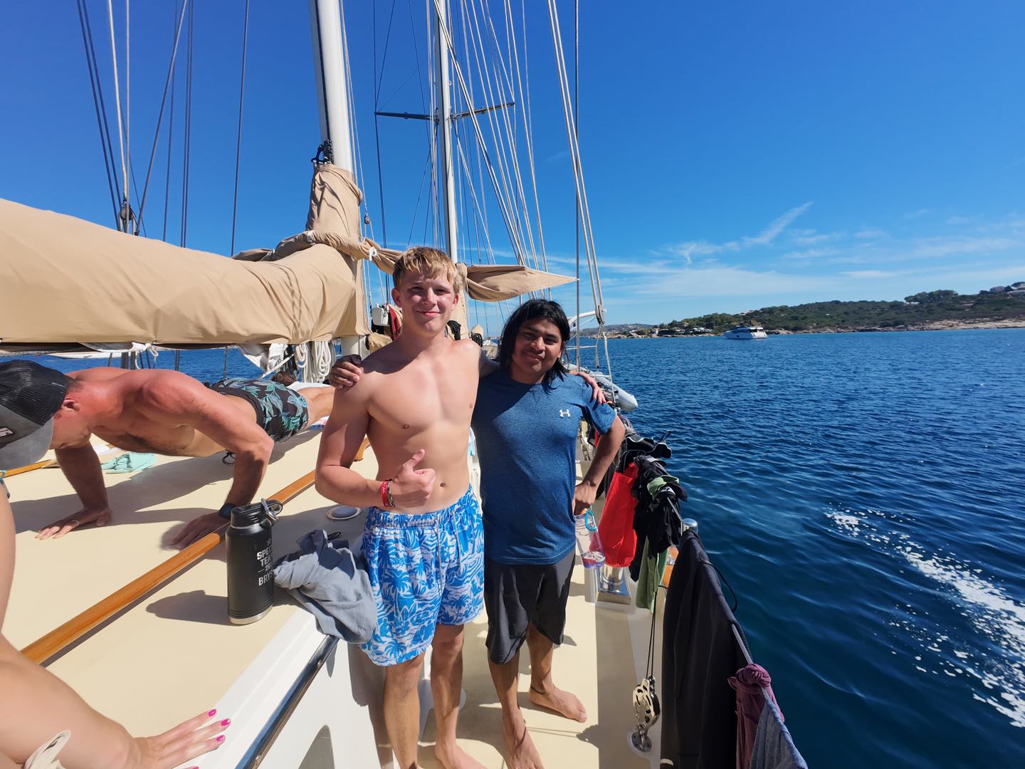 Meanwhile my group and I took some quizes on recreational dive planners.. which was not easy. Then lunch came around, and everybody was back from their dive, and my group was all finished with the lesson. We eat lunch, and now iit’smy ggroup’sturn to tackle the open water dives off the boat, and the certified divers do a dive for advanced. In my group, it was me, Luca, Samantha, Chloe, and our amazing teacher, Nacho, so shout out to Nacho for being the best teacher and making our dives so much fun. We did some skills underwater and explored a bit. My favorite part had to have been when Nacho points out something in the seagrass on the ocean floor and Luca goes to grab it, thinking it was a piece of trash, but in reality it was a starfish (that was a big no-no). Also, another great part of the dive was messing with Luca, which he did not like at all. We eventually finish up with our two dives, and now I am exhausted. We wash off all of our gear and put it away, I take an amazing ocean shower, and then get straight into comfy clothes and go take a nap out on the net at the bow of the boat with Teo, Luca, Teegan, and Alexa.It was amazing. Then we had intro to oceanography, which was great because Nacho is teaching the class. After we head to dinner and enjoy a great meal made by Shane, with Bryson and Teo being his sous chef. We clean up and head to the intro to seamanship, which is taught by Shane. Nighttime comes around, and everyone gets their phone back, and I’m sure everyone is going to be calling and texting their parents and friends. I am super tired now and super thankful I do not have anchor watch tonight because I am exhausted, and tonight is the first night it might rain. Everyone get their foul-weather gear ready!!!