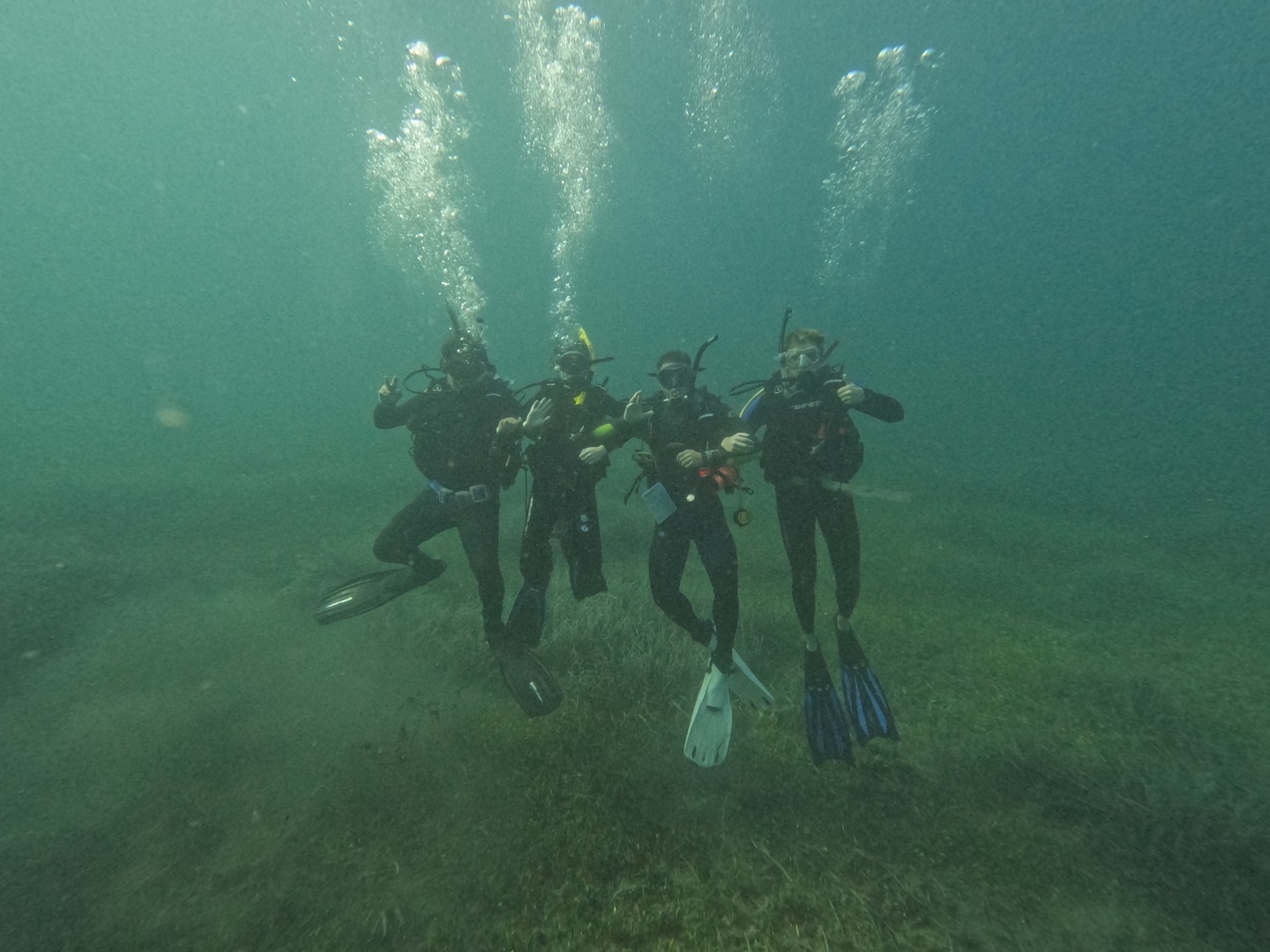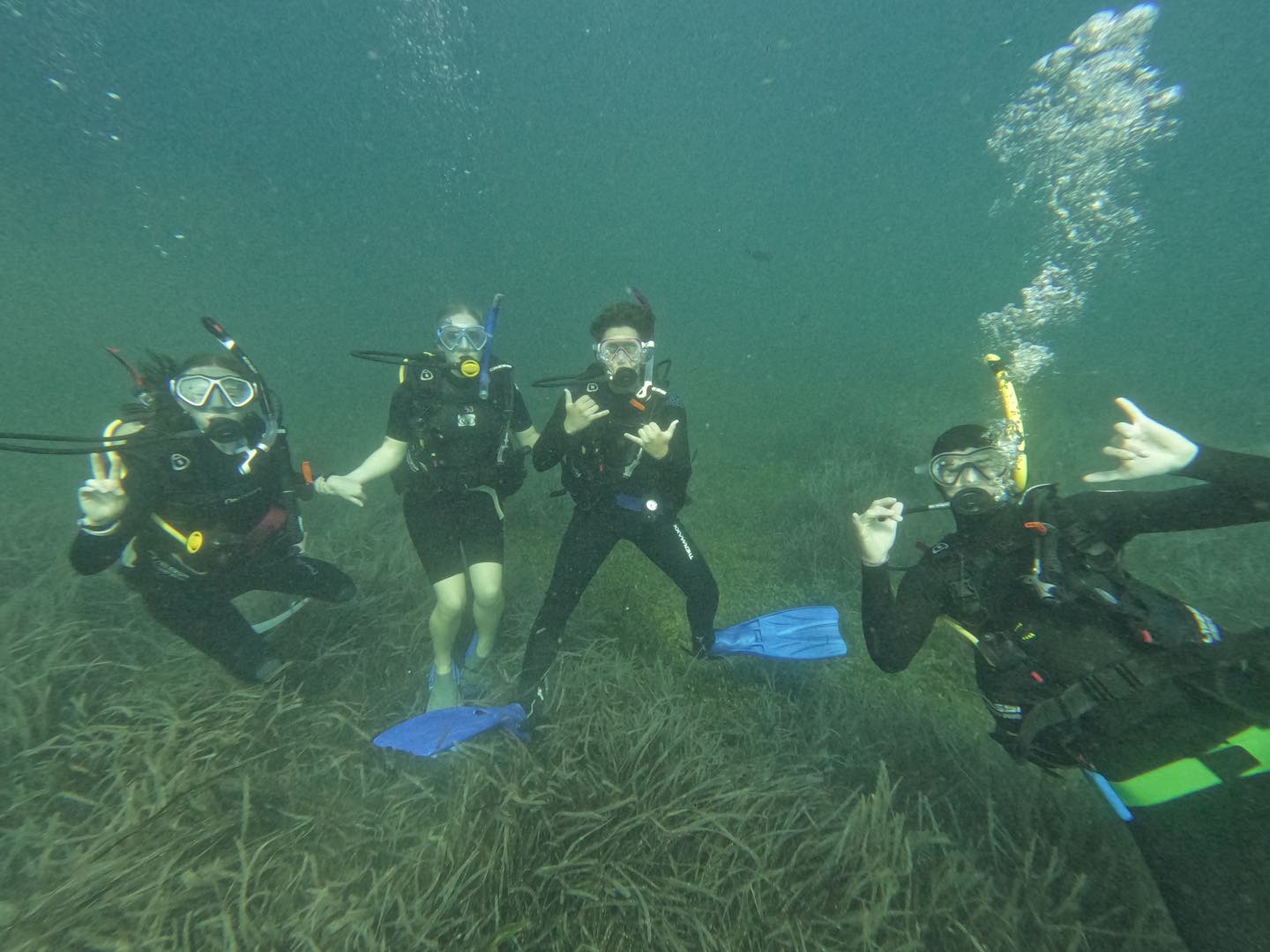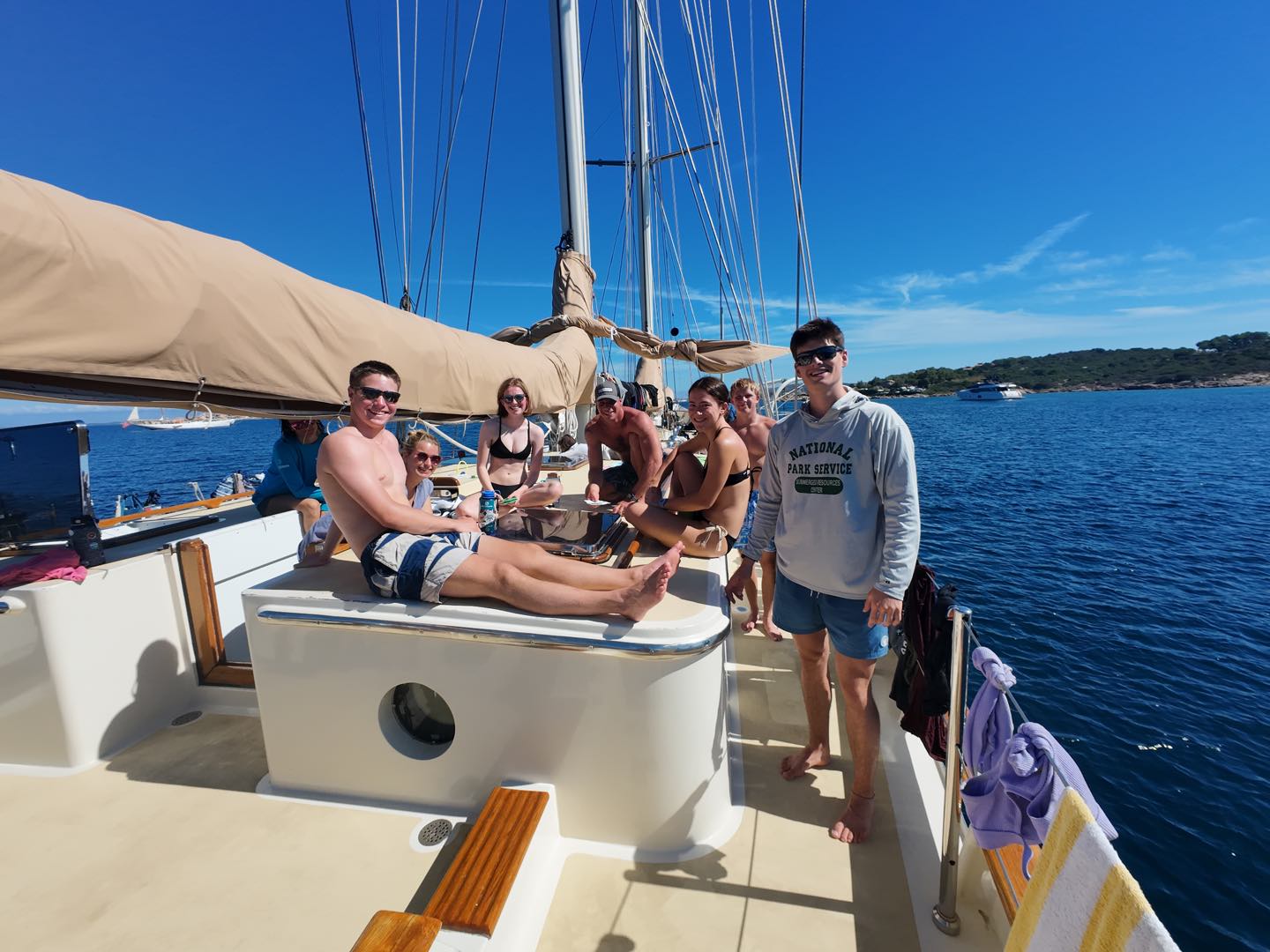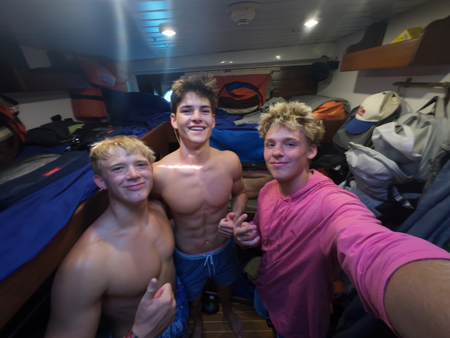 Meanwhile my group and I took some quizes on recreational dive planners.. which was not easy. Then lunch came around, and everybody was back from their dive, and my group was all finished with the lesson. We eat lunch, and now iit’smy ggroup’sturn to tackle the open water dives off the boat, and the certified divers do a dive for advanced. In my group, it was me, Luca, Samantha, Chloe, and our amazing teacher, Nacho, so shout out to Nacho for being the best teacher and making our dives so much fun. We did some skills underwater and explored a bit. My favorite part had to have been when Nacho points out something in the seagrass on the ocean floor and Luca goes to grab it, thinking it was a piece of trash, but in reality it was a starfish (that was a big no-no). Also, another great part of the dive was messing with Luca, which he did not like at all. We eventually finish up with our two dives, and now I am exhausted. We wash off all of our gear and put it away, I take an amazing ocean shower, and then get straight into comfy clothes and go take a nap out on the net at the bow of the boat with Teo, Luca, Teegan, and Alexa.It was amazing. Then we had intro to oceanography, which was great because Nacho is teaching the class. After we head to dinner and enjoy a great meal made by Shane, with Bryson and Teo being his sous chef. We clean up and head to the intro to seamanship, which is taught by Shane. Nighttime comes around, and everyone gets their phone back, and I’m sure everyone is going to be calling and texting their parents and friends. I am super tired now and super thankful I do not have anchor watch tonight because I am exhausted, and tonight is the first night it might rain. Everyone get their foul-weather gear ready!!!