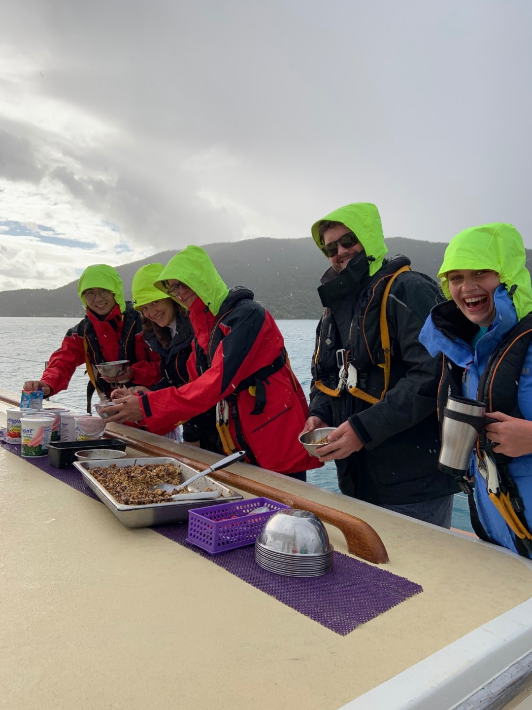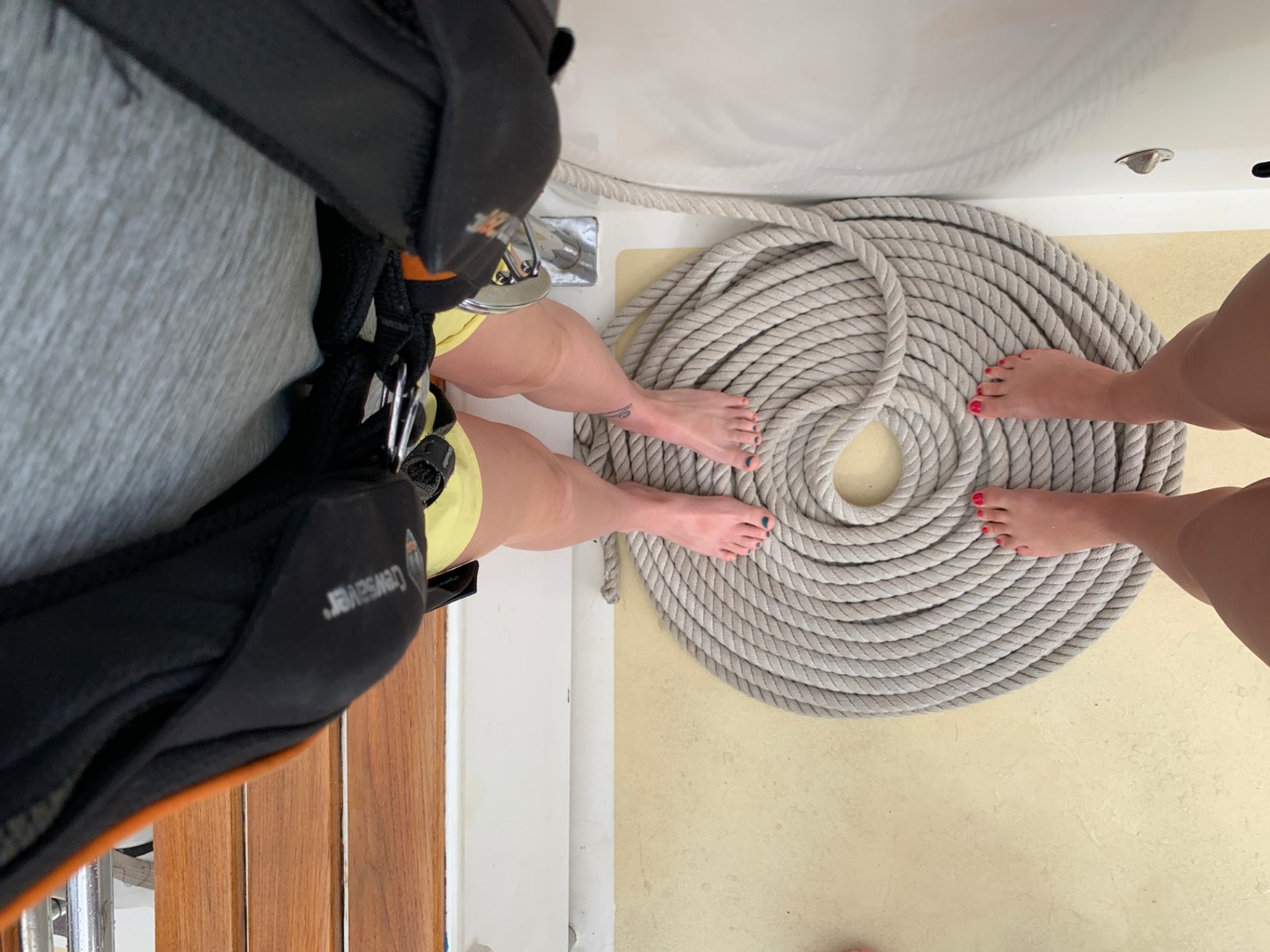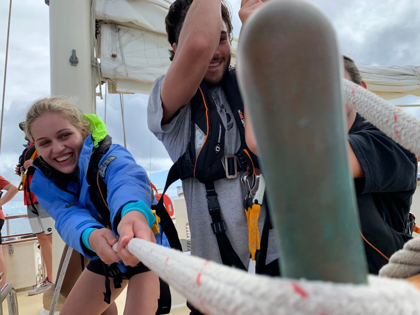 Pictured: Image (by Ivan) of the lunar eclipse/blood moon overnight; students geared up in foulies for breakfast; our view of an early morning rainbow; Bianca and Sophie enjoying some sailing; Sophie and Alex hoisting the main staysail; the group topping the boom for the main staysail; some boys practicing “sweating,” the technique used to raise heavy sails by hand; a beautiful French coil for one of the sheets.