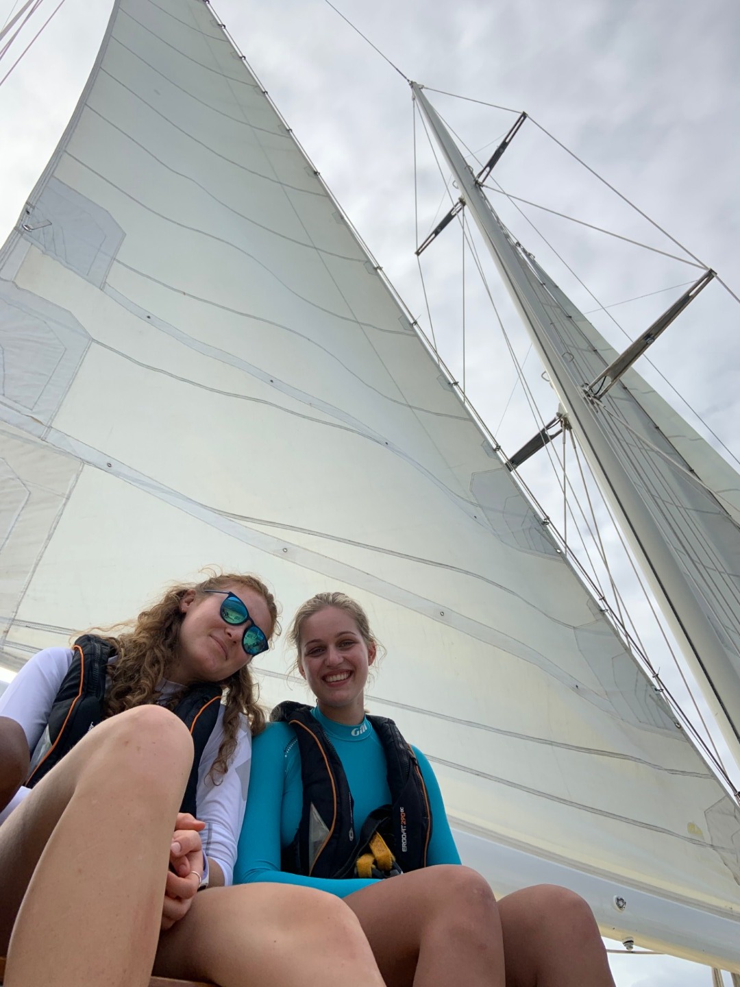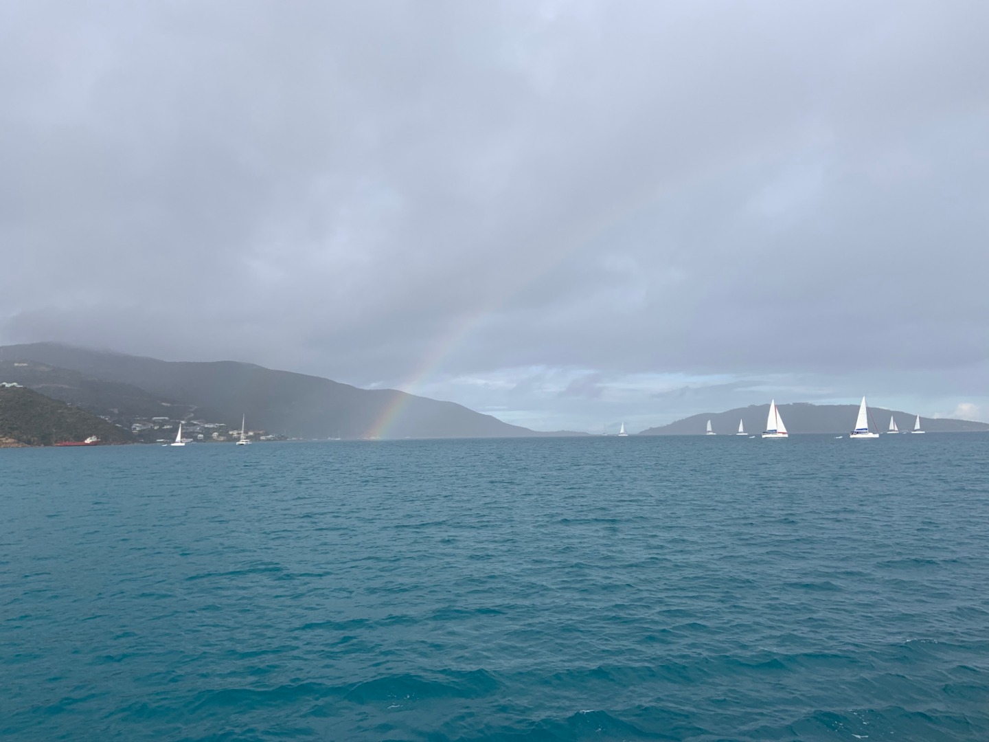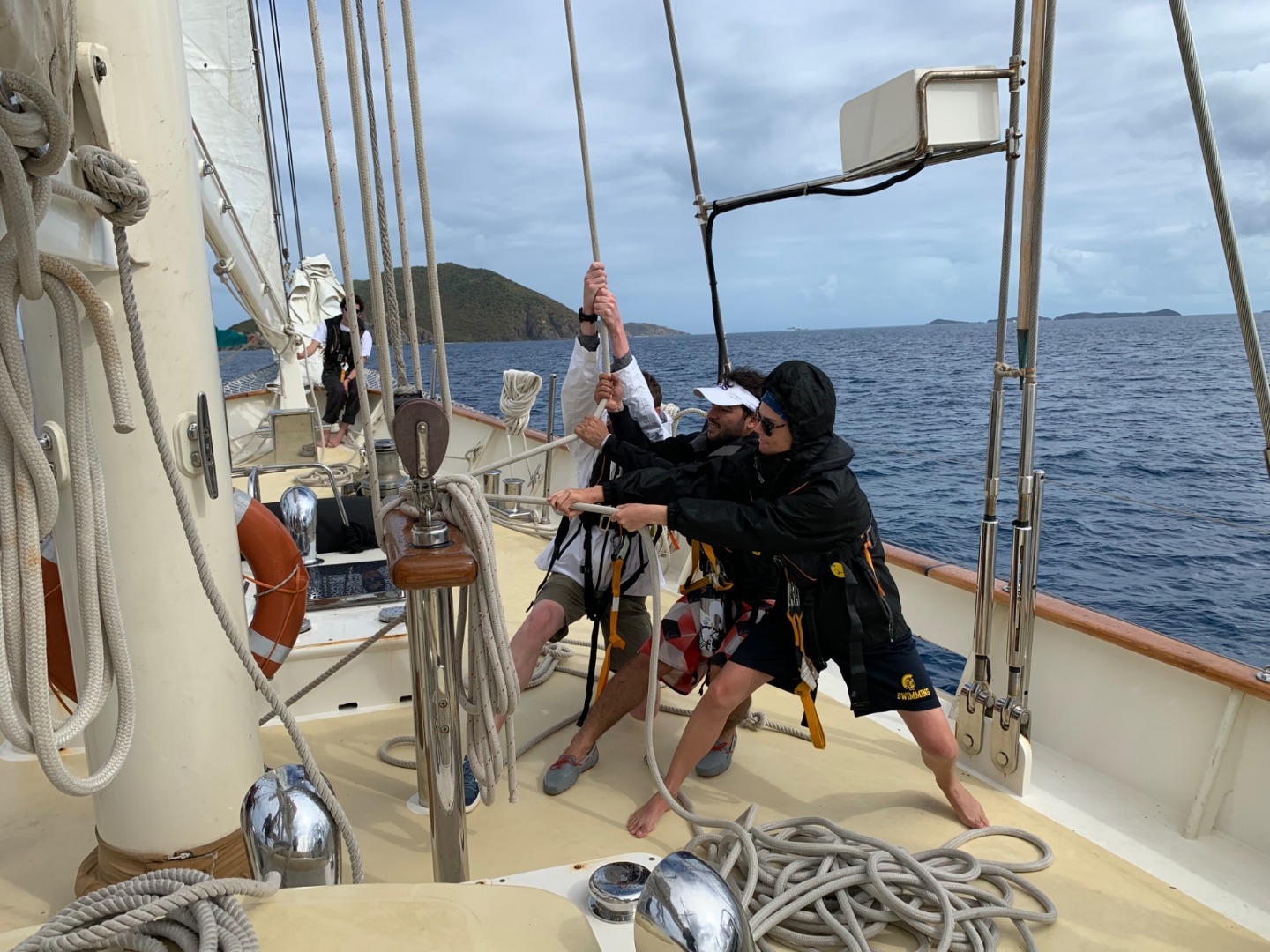 Monday morning started early for some Argo students who observed the total lunar eclipse and blood moon at 1 am. Shortly after falling back asleep, we were awoken at 6:30 am to prep Argo for a short sail to Peter Island. Among the seemingly endless checklist that needed to be completed before Argo could leave Gorda Sound, students diligently raised dinghies, dogged hatches, lashed benches down, stowed dive gear, secured sails, and lifted anchors. Shortly after Argo was underway, she ran into a small rainstorm just in time for breakfast. Students and staff raced down the companionways to toss on our foul weather gear. Once suited up, a delicious breakfast of flapjacks and yogurt was had in the drizzle. Following the cleanup, we began our first sail training class and learned some of the ropework behind raising sails. We raised half of Argo’s sails, including the main staysail, forestaysail, and jib. Afterward, we were allowed a short amount of free time before hearing a frantic “man overboard!” called out. We quickly realized, after rushing to the cockpit and nervously searching the smooth waters for a person, that it was only a drill. After successfully completing our first drill, we arrived at Peter Island and enjoyed falafel wraps for lunch. Then, open water divers headed out to Great Harbor to complete the last of our qualifying dives. With the help of our instructors and divemasters, we practiced manually inflating BCDs, removing and replacing masks, and navigating using our compasses in deep water. We also observed colorful coral, trunkfish, lobsters, brittle starfish, and countless other marine life. At the same time, the already qualified students learned all about tall-ships from Meg, watched a documentary, and played the game spoons. Before dinner, students either showered, swam laps, or studied. After stuffing down chicken wings for dinner, students and staff explained their daily appreciation and top bucket list items during our squeeze. The open water folk ended the day with a few final quizzes while the remaining crew went off to bed.