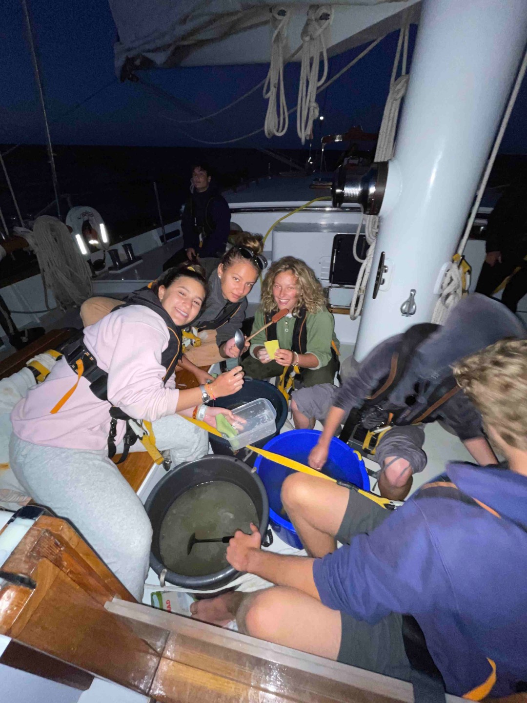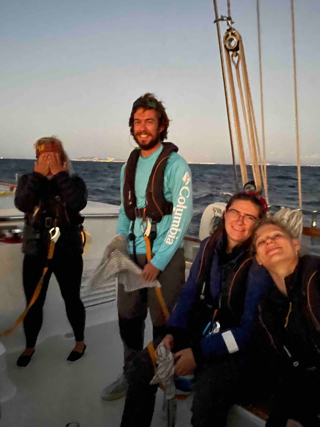 Today we bid goodbye to Gibraltar and embarked on what is set to be our longest passage yet! Getting off the dock was an all-hands-on-deck kind of situation, and as always, we were left in awe by Freddie’s boat handling skills. Once out in the harbor, we made our way through the maze of container ships. The wind has been strong all day which allowed us to raise 4/6 sails and finally get underway without the help of the motor. Thanks to our plethora of seasickness meds, nobody has gotten seasick, so fingers crossed that that continues.