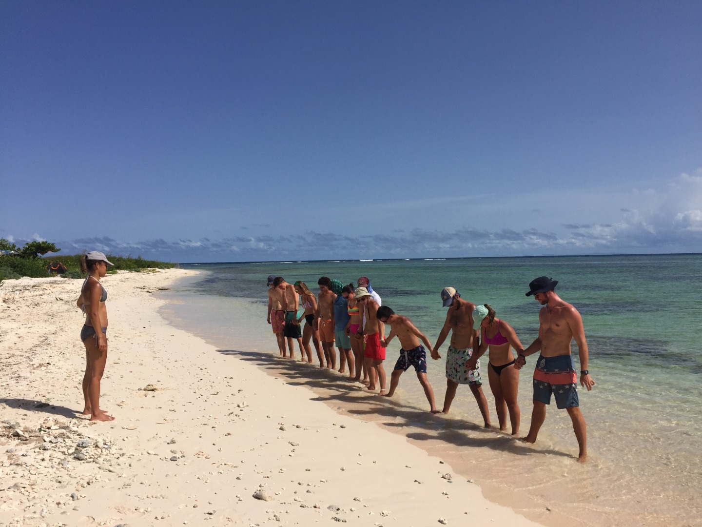 By the time lunch and clean-up were finished, everyone was pretty keen to head to the beach for some games and exploration. We jumped in the dinghies and were ferried ashore. We were told we would have to jump out into waist-deep water and walk in, and everyone was prepared to get a little wet. And then we hopped into chest-deep water, haha. Once we made it ashore, we began our team-building game, “Magnetic Feet,” which involves the whole group standing in a line and connecting their feet to the person next to them as if they were stuck like magnets. They then had to maneuver the whole group to a goal-line together without the feet leaving each other. They performed beautifully as a team, demonstrating excellent cohesion and cooperation. Once they completed their challenge, the group spent the remainder of their time exploring the beach.