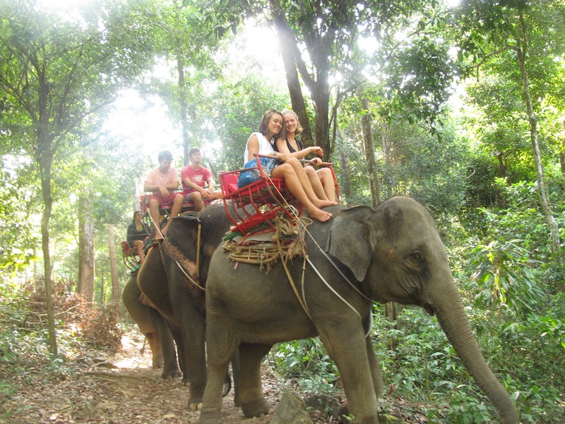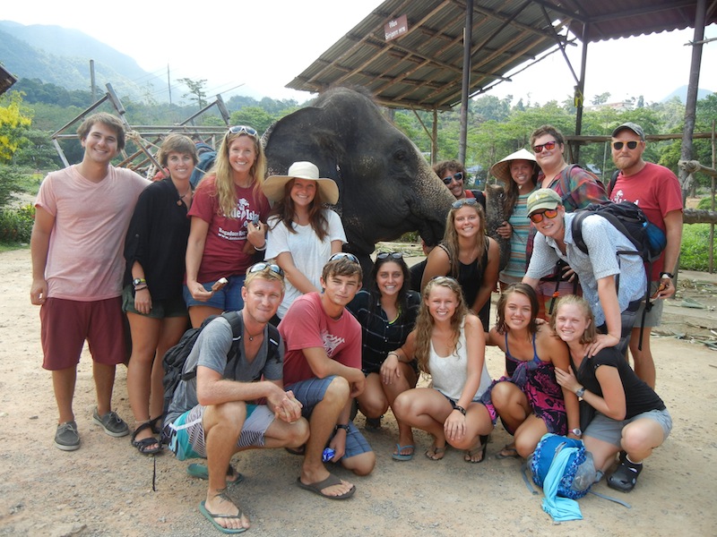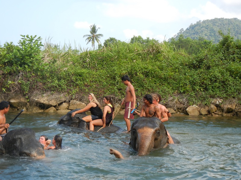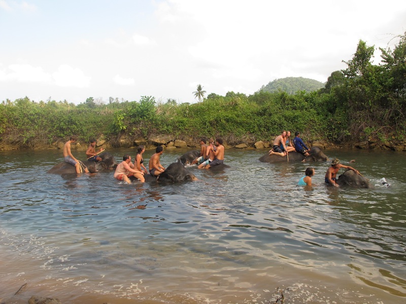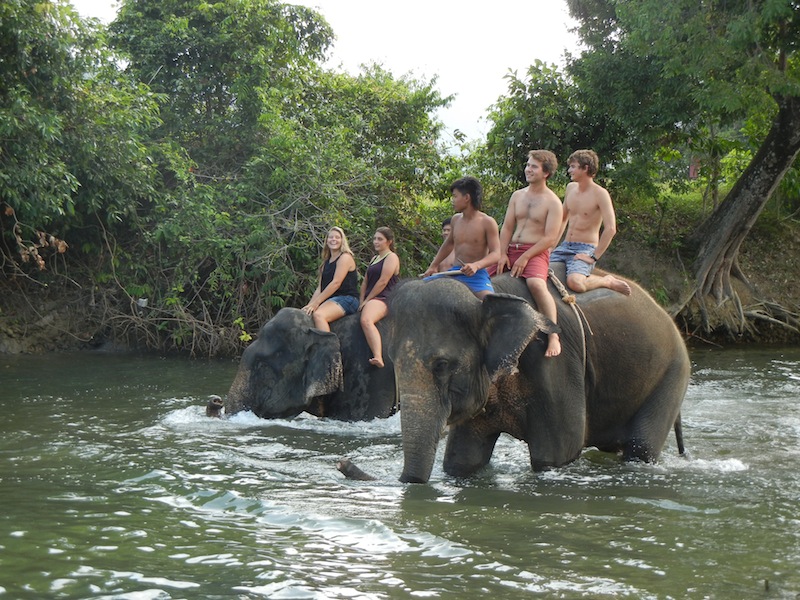 Today, we rode elephants. I repeat, we rode elephants. In the jungle, through a river, and then swam with them. Yup, it was a good day. Very little can top riding elephants, but swimming with them came close. We had an extra early morning today in order to get to the elephant trekking camp on time, but as soon as everyone saw the elephants, whatever grogginess anyone was experiencing completely vanished. It was three people per elephant, mahout included, and we were perched on carriage-esque seats atop the elephant’s back. I couldn’t help feeling a little bit like Mowgli from The Jungle Book mixed with a bit of Tarzan. That feeling only grew when our mahout got off of the elephant and let us ride bareback on the neck of the elephant throughout the Thai rainforest. If someone had been watching us riding these elephants, they would not have been able to tell the difference between us and the kid opening Santa’s presents on Christmas Day. The elephants brought the child out of every one of us, and this continued all the way to the point of elephant water fights. If you do not know, elephants can shoot water out of their trunks. If your mahout was really skilled and the elephants were willing, you could aim those water spouts perfectly at your captain. You are welcome, Kris. In other words, the day continued with many of us falling into the river as our elephants would go underwater and come back up laughing. The elephants definitely put a smile on everyone’s face for the rest of the day, and everyone was in a good mood, which made for some fun adventures along the pier of Koh Chang.