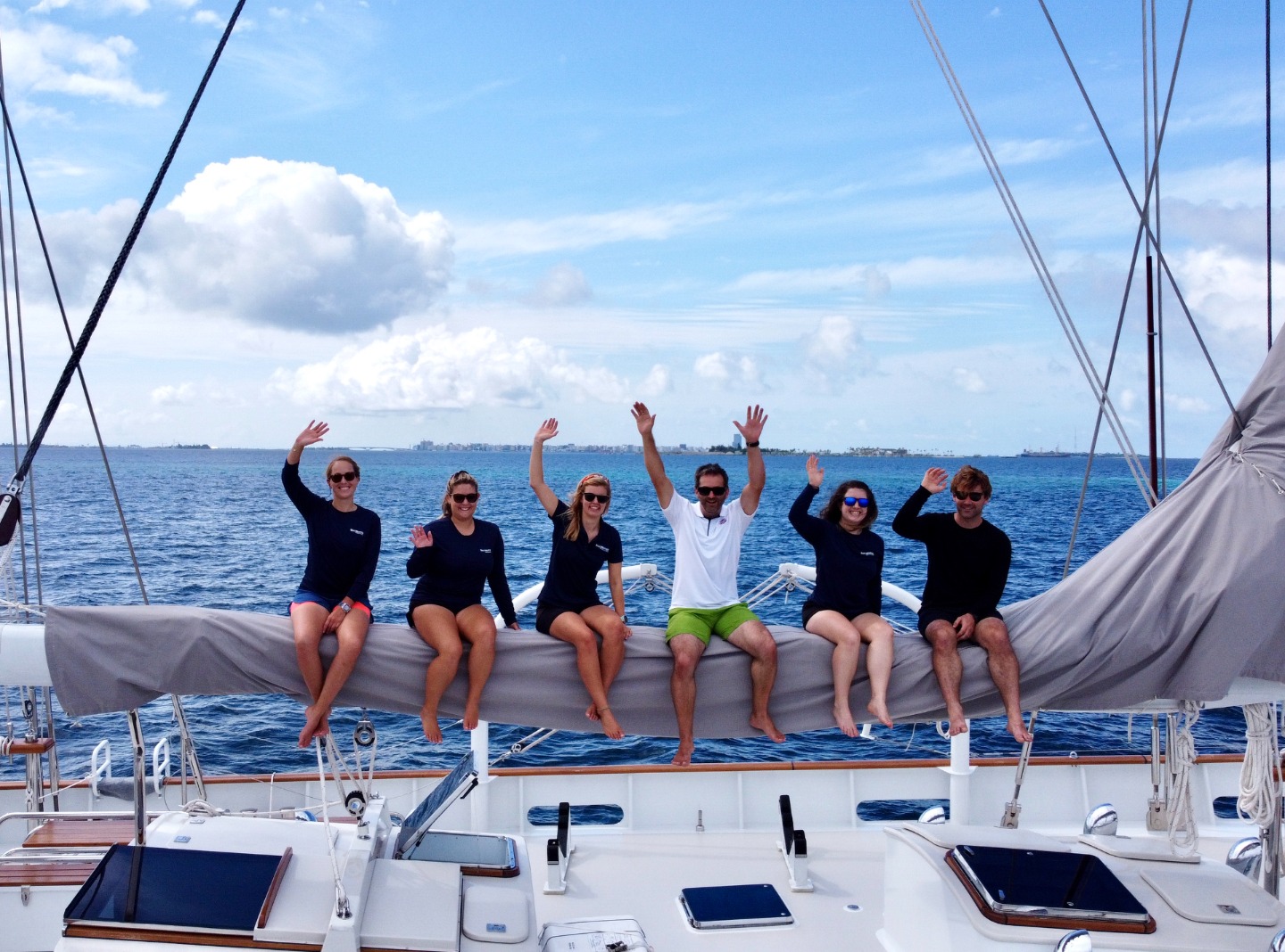 Before dinner, everyone successfully finished their swim test (two laps around Vela followed by a 10 minute float) in the tropical Maldivian waters whilst enjoying a chance to cool off. Finley and Cait had a blast while splashing everyone during swim time showing off some excellent jumping in skills. Valintena and Carly helped cook up a delicious tomato pasta dish for dinner that disappeared very quickly. Whilst on board, every crewmember has a number that is theirs for the duration of the trip to allow us to count off and make sure that we have everyone together. Mo, our first student skipper, quickly learnt how much of a challenge it can be getting everyone together – 112 ft may not sound like a large space to get lost in but trust us when we say that sometimes getting everyone together is like herding cats!!