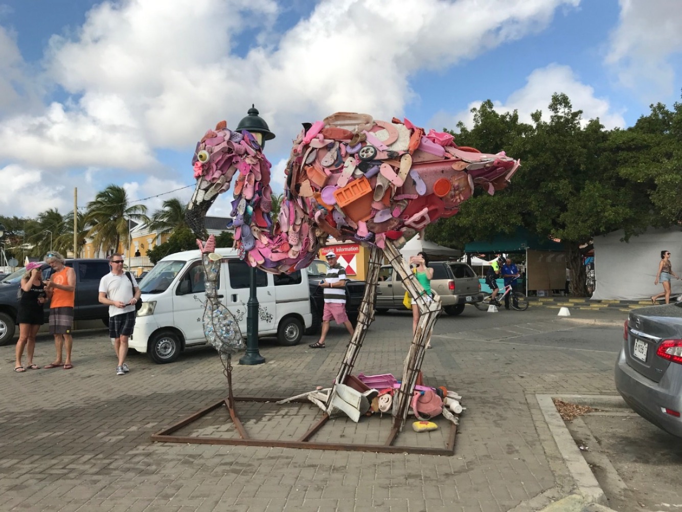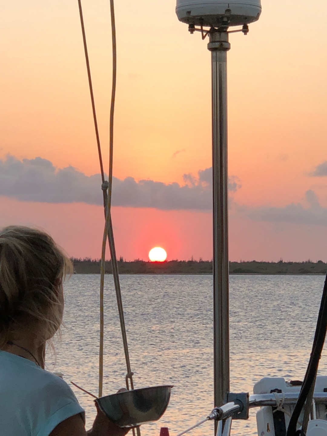 Pictured: View of Bonaire through our binoculars; the group readying fenders and dock lines in preparation for arriving at the dock; palm trees and blue skies; flamingo art make of marine plastic that we saw on our walk to customs; Jack working on repairing the seal on the gray water tank; the group gathered around the cockpit for dinner; two views of the sunset off our stern; and us digging into the brownies we had for dessert.