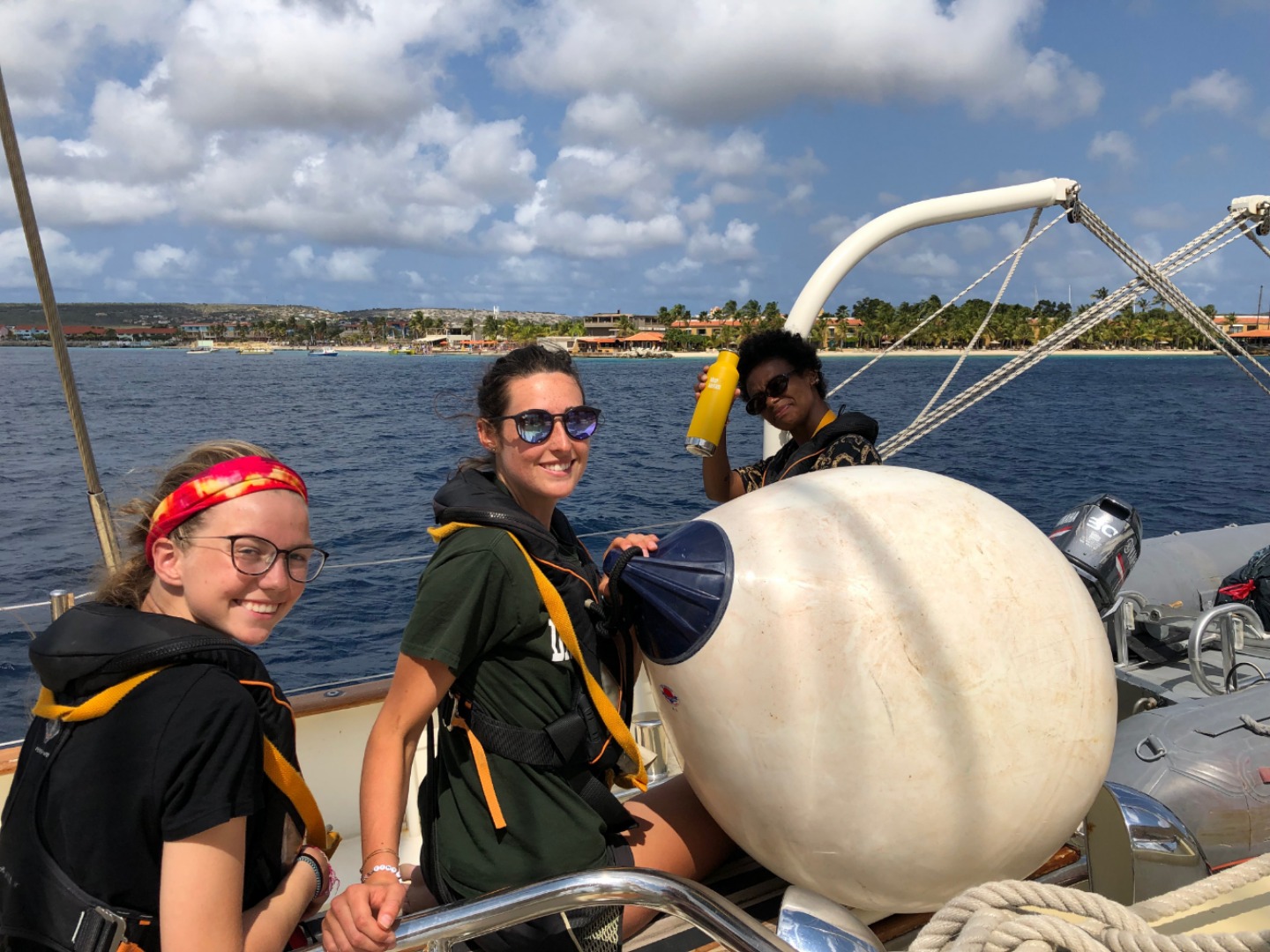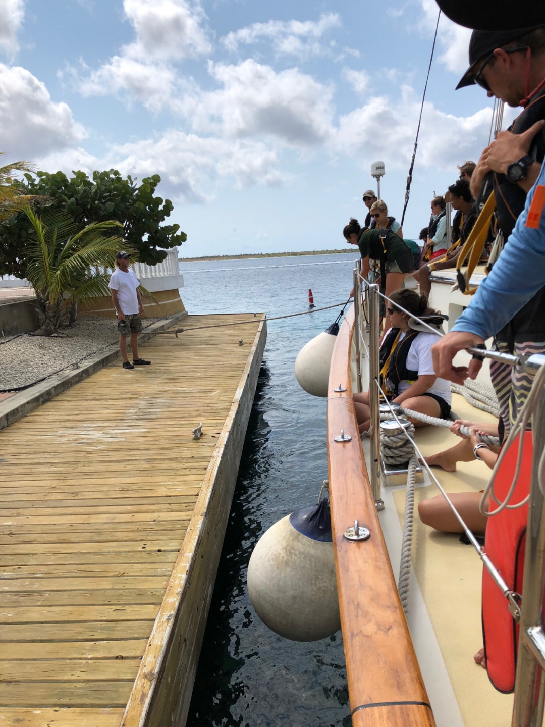 The first thing I did this morning was wake up to the sight of Bonaire on the distant horizon. Super excited, watch team 1, which consists of our team leaders, Amanda and Ian, and my fellow team members, Kai, Bianca, Ivan, Drake, and Jenna, was ready to be on duty for the last stretch of the passage. As we approached Bonaire, we spotted a group of dolphins swimming and leaping out of the water on the port side of the boat. That made our day!