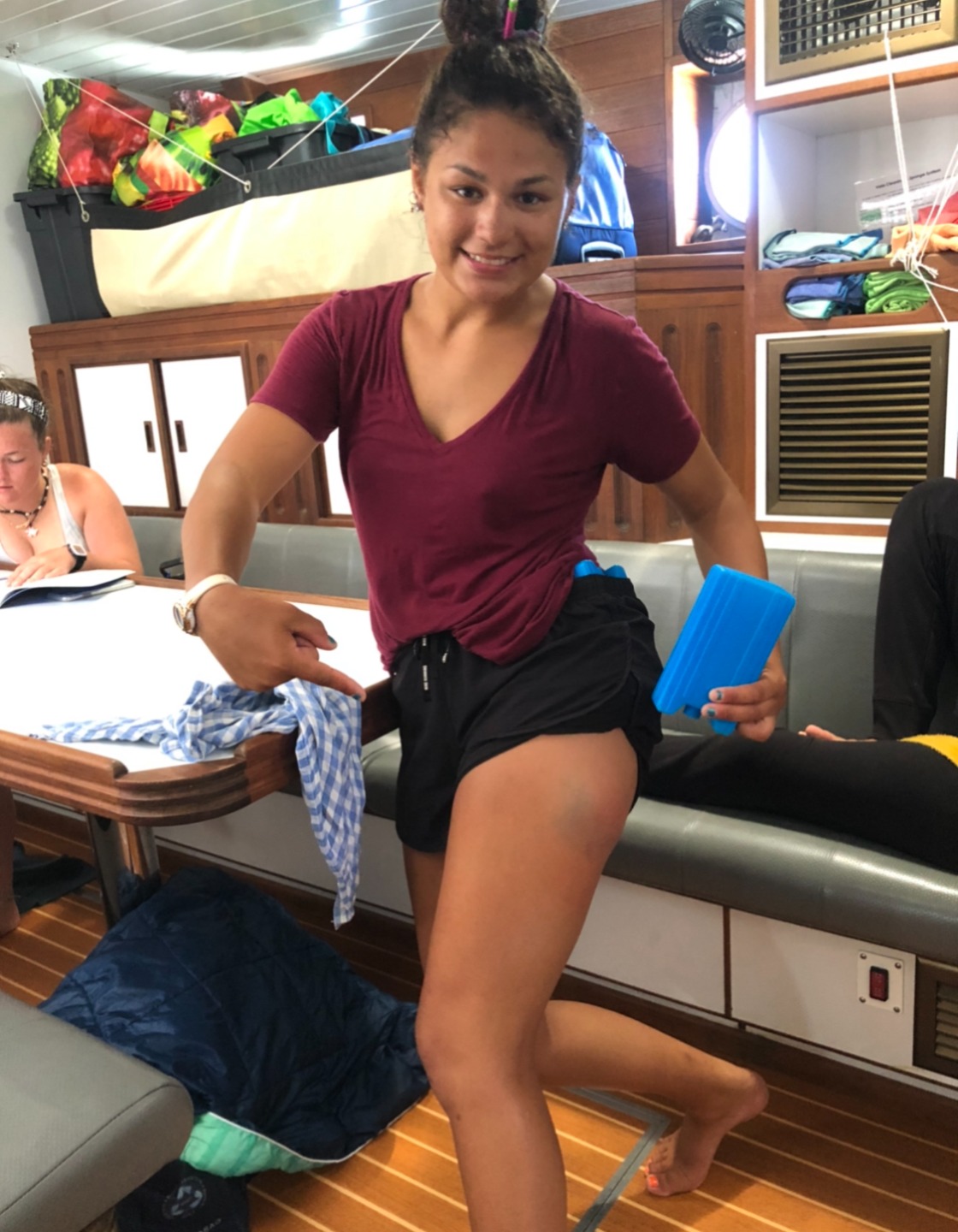 Allissa showing off her battle scars from falling off her bunk due to a lack of