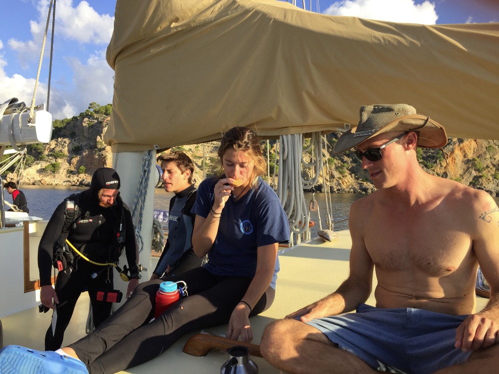 After having a tasty lunch, we began to put away all the dive gear and get ready to change our location of anchorage. Kevin had received information from the weather forecast that winds would shift to the south. To avoid dragging, he made the call to go to the north of the island of Mallorca to a town called Soller, just five hours away, for protection and a safe anchorage. We got to appreciate much of the beautiful Spanish island coastline before the sun went down. The only thing missing for today is our Marine Biology class. It has been yet another great day on Argo. I couldn’t ask for more.