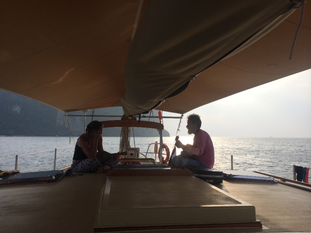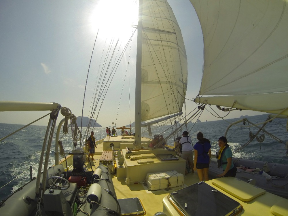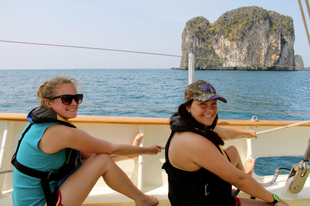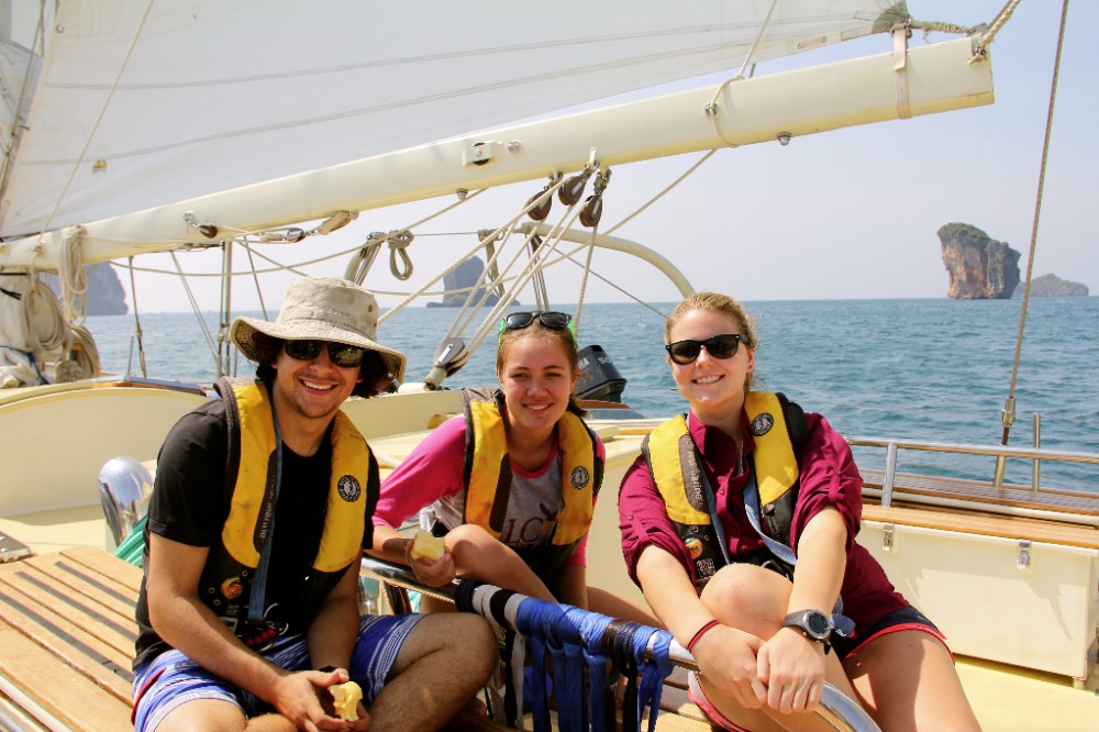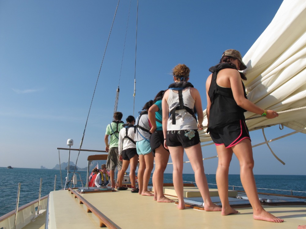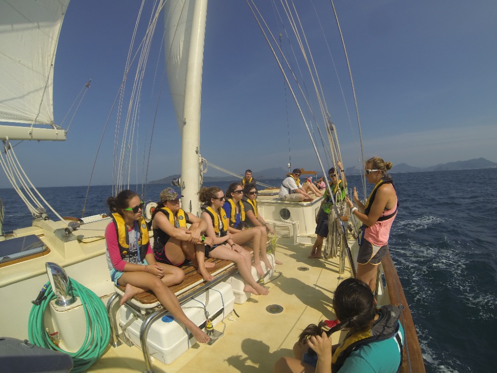 After a full day of sailing, we now all sport matching blisters, which your parents will be happy to hear will replace the need for matching tattoos. In addition to our growing callouses, we are developing upper body strength, some of us for the first time ever. After these coming 83 days, you will be the proud parents of tan, top-heavy sailors. Our marine biology instructor, Carolyn, led some daring girls in a Zumba lesson on deck for all of Phi Phi Don to enjoy. It was bloody brilliant.
