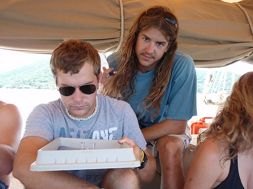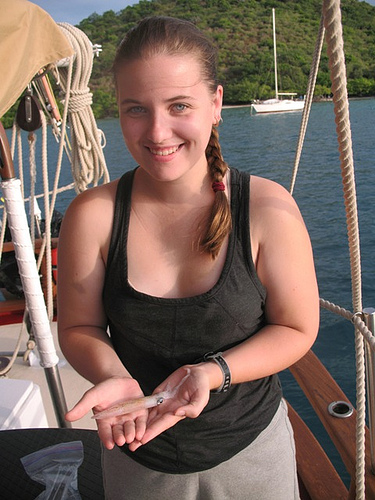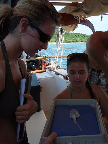 We woke up at 07:00, had breakfast then we had an oceanography class, going through the science gear on board to get some ideas for our research projects. This was followed by the dissection of a squid that had jumped on deck in the night! Then, we went to Byras Creek for a snorkel along the mangrove tree line to see the juvenile fish who use the trees for protection. We got back to Ocean Star and had lunch. In the afternoon, the PADI Open Water students learned how to use the PADI Recreational Dive Planner and took some quizzes. We then had an MTE class and then dinner at 18:00. It was hot and sunny all day, not a cloud in the sky, a perfect day in the BVI.