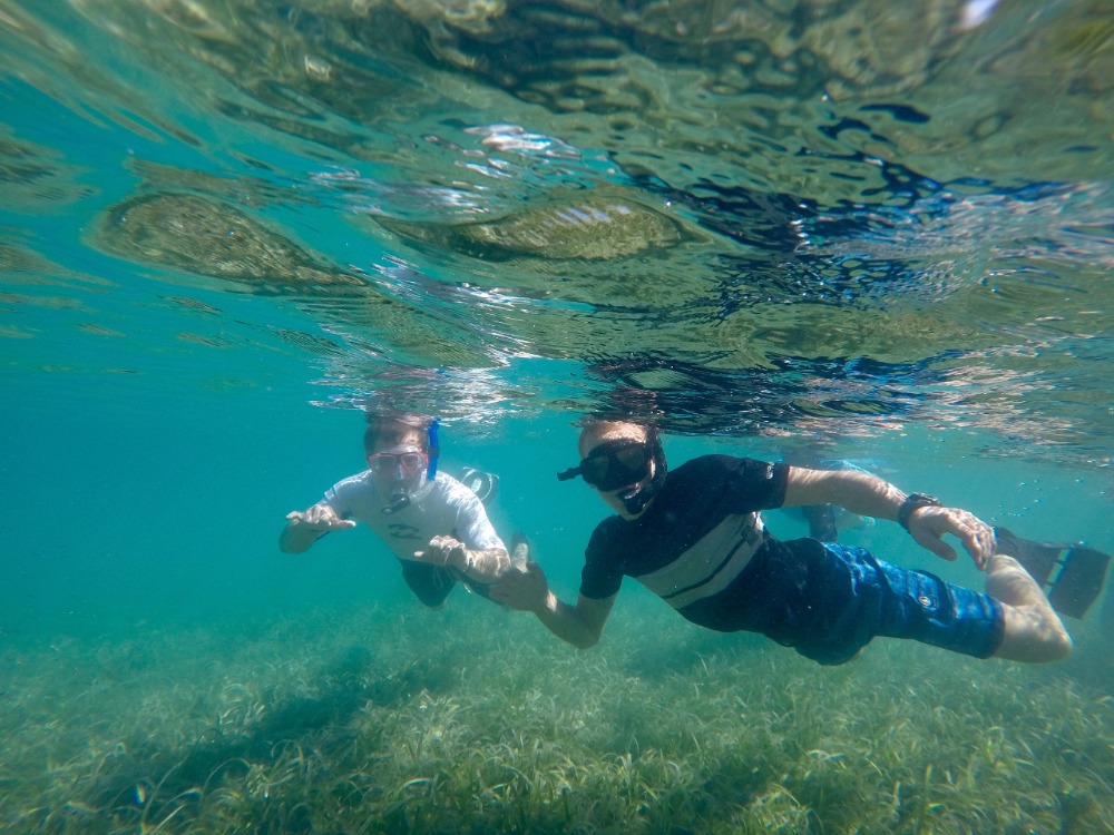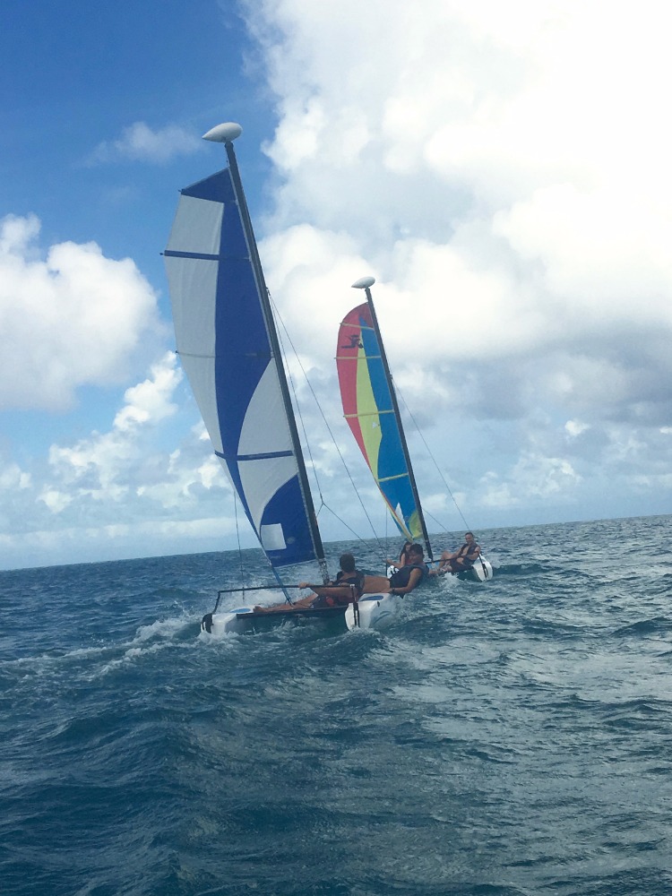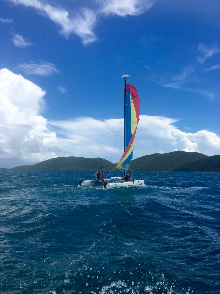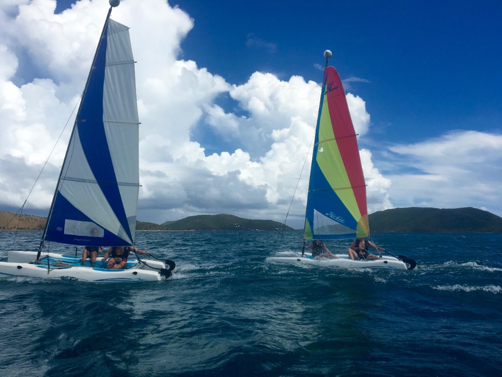 This morning began with a snorkel through the mangroves. Upon arrival, we were immediately greeted by a green sea turtle! The students saw many mangrove inhabitants, including baby barracuda and some upside-down jellyfish. After exploring the roots, the students headed back to Ocean Star, where the PADI open water students took their scuba exam. During the exam, students who were already certified helped move Ocean Star to her new anchoring spot in Leverick Bay. Grilled cheese sandwiches for lunch gave us the energy we needed for our action-packed afternoon of Hobie cat sailing. Students’ knowledge of their points of sail after yesterday’s lecture was put to the test as they set out into the bay. Several hours and a couple of races later, all faces were smiling from ear to ear. To round off a perfect day and to celebrate officially becoming PADI certified divers, students are preparing for their first night out ashore.