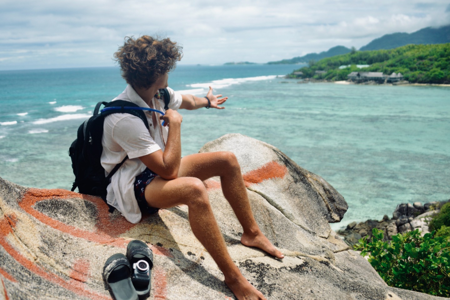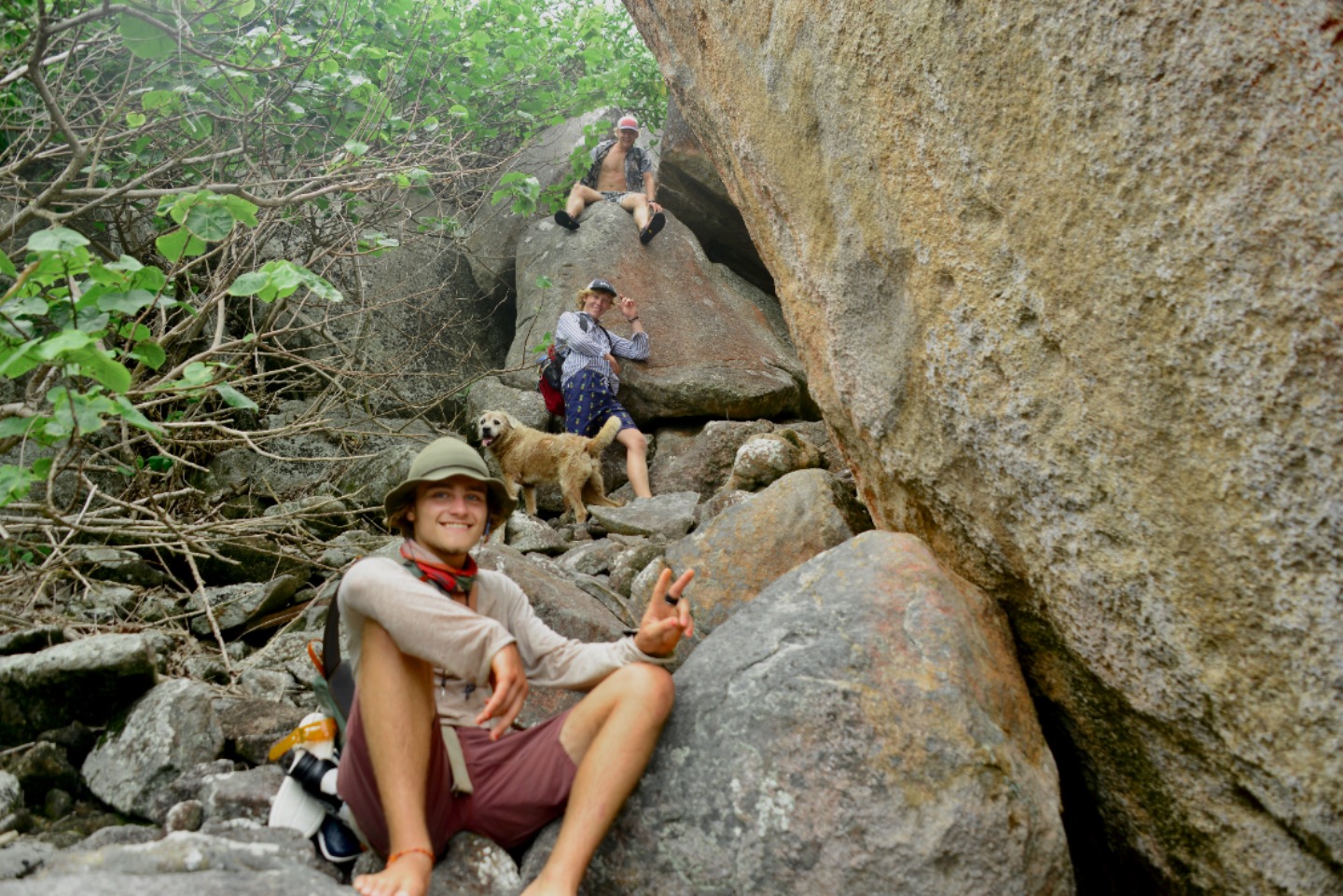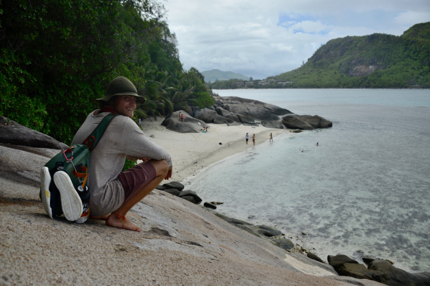 At this point, everyone split into small groups and set off to explore our first taste of real land since the trip began. I subconsciously decided to move from one group to another as I often do and was amazed at how beautiful the place was. Moyenne is about a 45-minute walk around its circumference. It can be walked barefoot (for the brave of heart and strong of foot), and best of all I didnt see any mosquitos. Sun shining, cool breeze blowing, ancient tortoises, and kind island caretakers. We swam in the clear ocean, drank coconut water fresh off the tree, made friends with Yallow, and scrambled all over the coastal rocks. It was a beautiful island.
