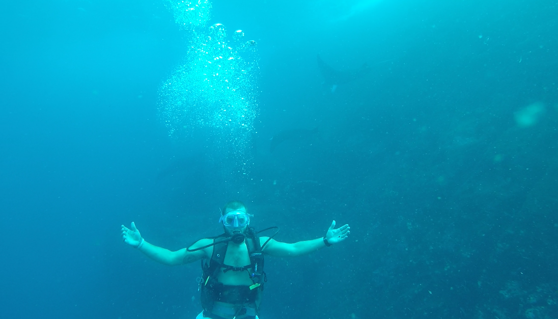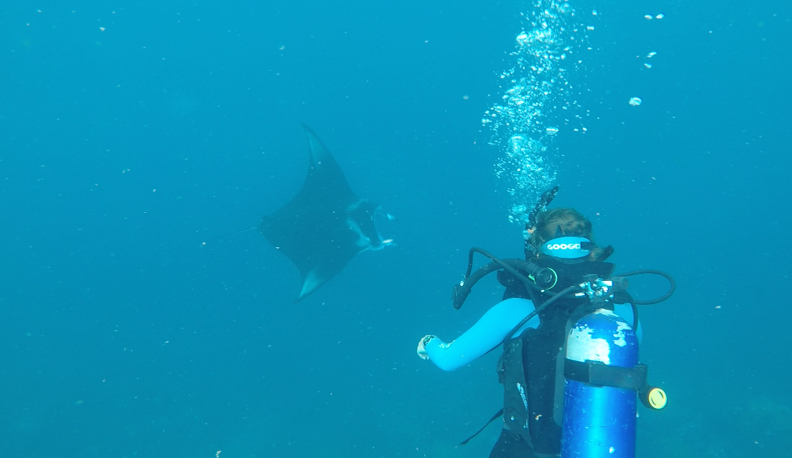 Today was a mixture of having some time ashore and scuba diving. Most of us used the time onshore to get things organized for when we get back home -signing into classes, checking in with advisors, etc. A very different world from the underwater realm that was below the rugged, dark green topography. As we descended down the steep wall, about a mile outside the bay, we saw a world rich in life. 1000s of grunts schooled in the rocks while manta rays snuck up behind us from the deep blue. They glided elegantly, barely seeming to move their wings and yet still moving faster than any of us could hope to swim. We went underwater in bright sunshine, but when we surfaced, you could see thunderstorms starting to roll in – changeable as the weather is here at this time of year. Back on the boat and head chef, Tom had shared his Nan’s Puerto Rican soul food recipe, which included homemade tortillas, which we wolfed down as the sun slid behind the mountaintops.