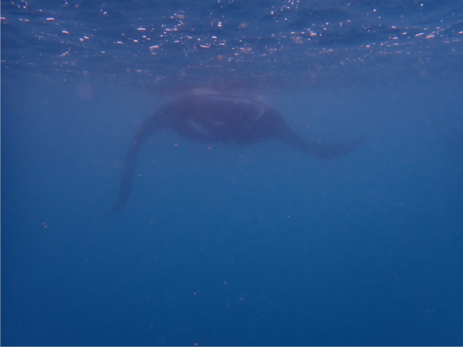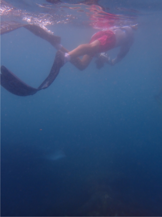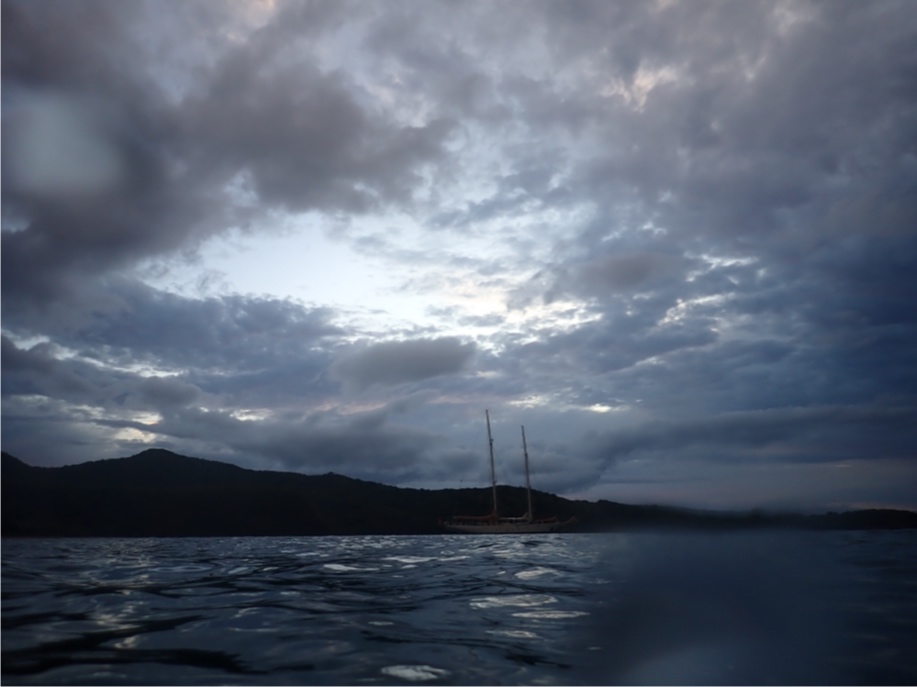 This morning, I woke up to a beautiful sunrise, as always, on this beautiful boat. My job as skipper for the day required me to wake up early (at around 6:30 AM) and wake the rest of the crew up at around seven, but luckily for me, there were already a bunch of people awake. Breakfast today was breakfast burritos, which were absolutely delicious, prepared by our head chef, Elanore, and sous chefs, Iain and Addy. What’s after breakfast, you may ask? MANTA RAYS! It all started with me and maybe two other people sitting on the deck after breakfast cleanup, and then we heard a big splash. A manta ray had just jumped out of the water. Then it was on. We quickly lowered our lovely dinghies, Plaai and Nopadone, into the water. Everyone rushed onto the dinghies, and we motored over to where we saw the commotion and hopped in. Boom, right underneath us, a massive melanistic manta ray started barrel feeding, which was super cool. The current was super intense, so it was quite the leg workout to swim against the current.