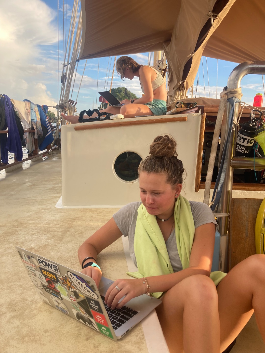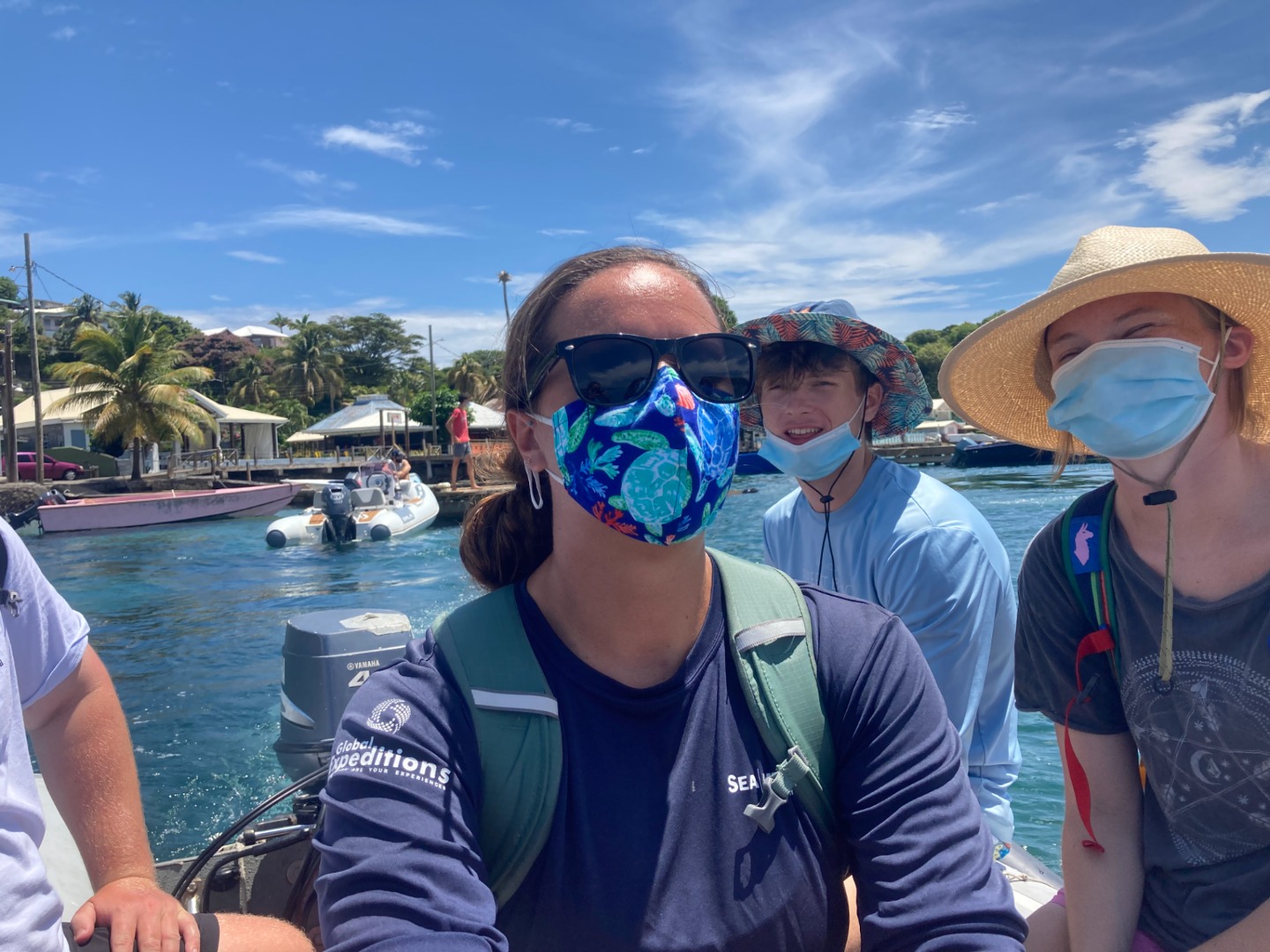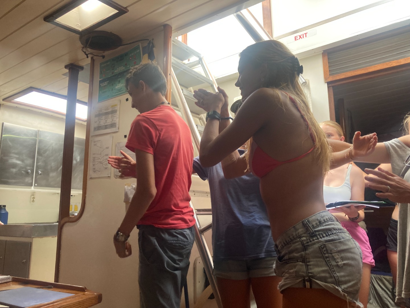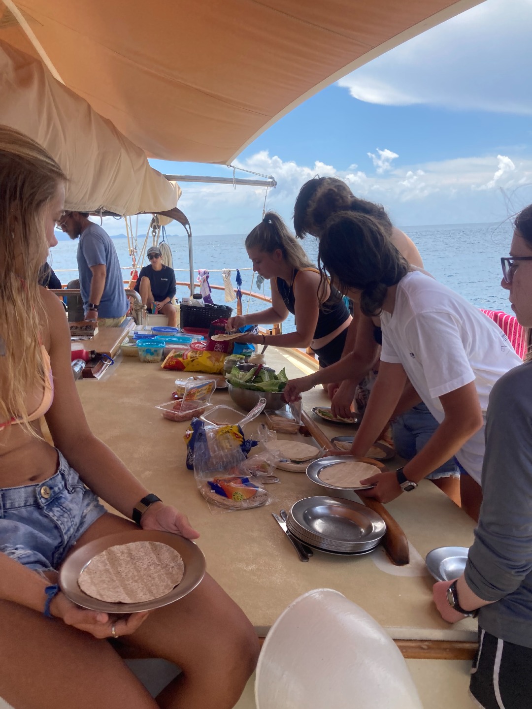 Then we had a Leadership class, during which we played everyone’s favorite songs and talked about our goals for the trip and the long-term. At the end of class, Ash said that the first Challenge Course assignment is to jump in the ocean right now with all your clothes on! I was glad to have a bathing suit on, but some people were not so lucky (RIP Stefi’s jean shorts). It was so much fun to jump in and swim after a long day. I attempted a dive off the boat but slipped and bellyflopped 🙁 Scuba Sam, Tate, and Eamon did some awesome backflips, though! After that, we went snorkeling around the boat and worked on our Leadership essays before dinner. Maxime (and his sous chefs) cooked a delicious lasagna. My squeeze question was “What’s your dream job?” and everyone had very cool answers. I look forward to trying Ash’s chocolate and touring Alaska on Lucy’s plane. Sam, Ash, Steph, Kris, Smash, and I had a little dance party in the chart house while I was writing the blog, complete with party lights. That is all for today–I am very excited for a full night of sleep with no anchor watch!! See you tomorrow!