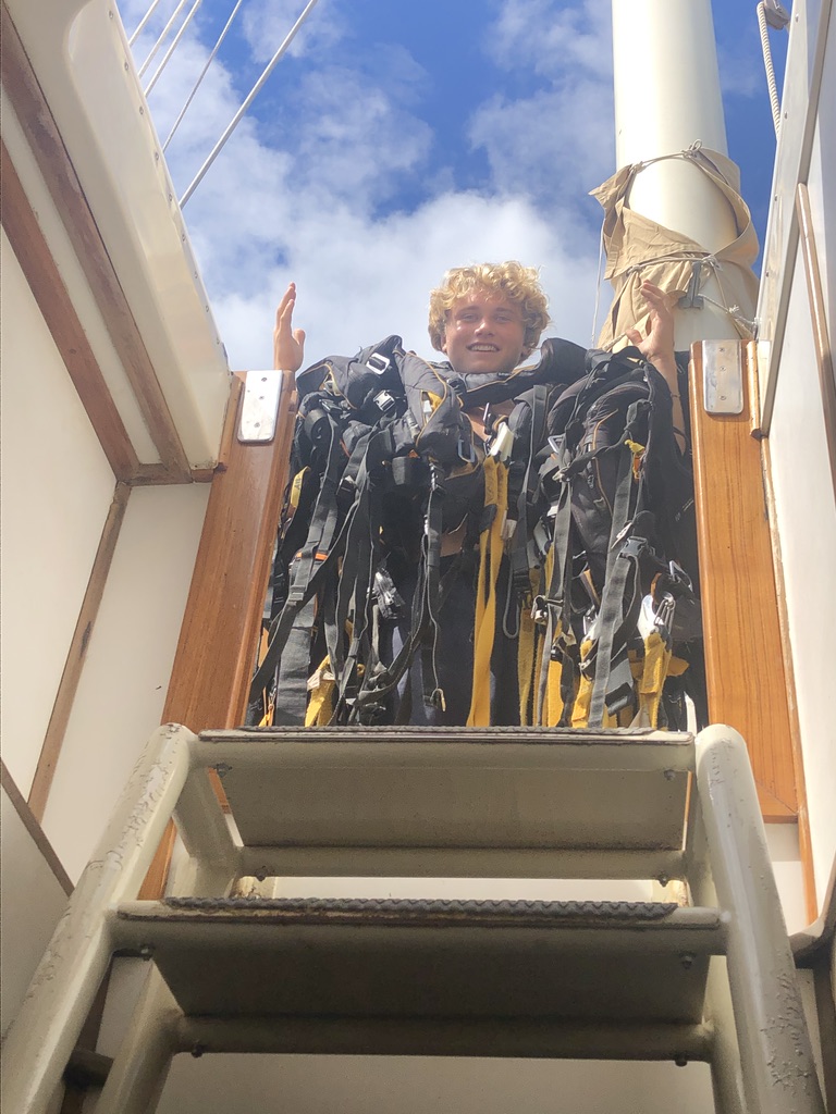 Today I woke up to the sound of Ethan, Seve, and Liam screaming at the top of their lungs in my bunk. They were heralding our arrival at our final destination: Antigua! Everyone woke up stoked and ready for the day, and we mustered in the cockpit as the day began to warm up. We did a baby BA in the morning to make us look like “clean and healthy people” for the health inspector. After he arrived and took all of our temperatures, we had the final boatmeal and got ready for the second, messier BA of the day… aptly titled the Messy BA. The Messy BA is the older sister of the regular, tamer BA and involved doing the once-a-program messy, dirty jobs like cleaning the bilges and the anchor locker. We had our work cut out for us, only stopping once for lunch and once again for dinner and another time for a snorkeling break; we toiled away in the pits and crevices of the ship, scrubbing. It was a lot of fun and very satisfying to squeeze myself into a tiny space in the bilge and scrub the grime from the corners of it. After our snorkel break, during which we saw a lot of squid and barracudas, we dried off and had delicious chicken curry, thanks to Sam. We also saw a medium size spotted eagle ray come right up to the surface beside the boat during squeeze, a good omen for what’s coming next. We are preparing to go on a night dive and hopefully see some cool things in the water and also hopefully get clean after this messy messy day.