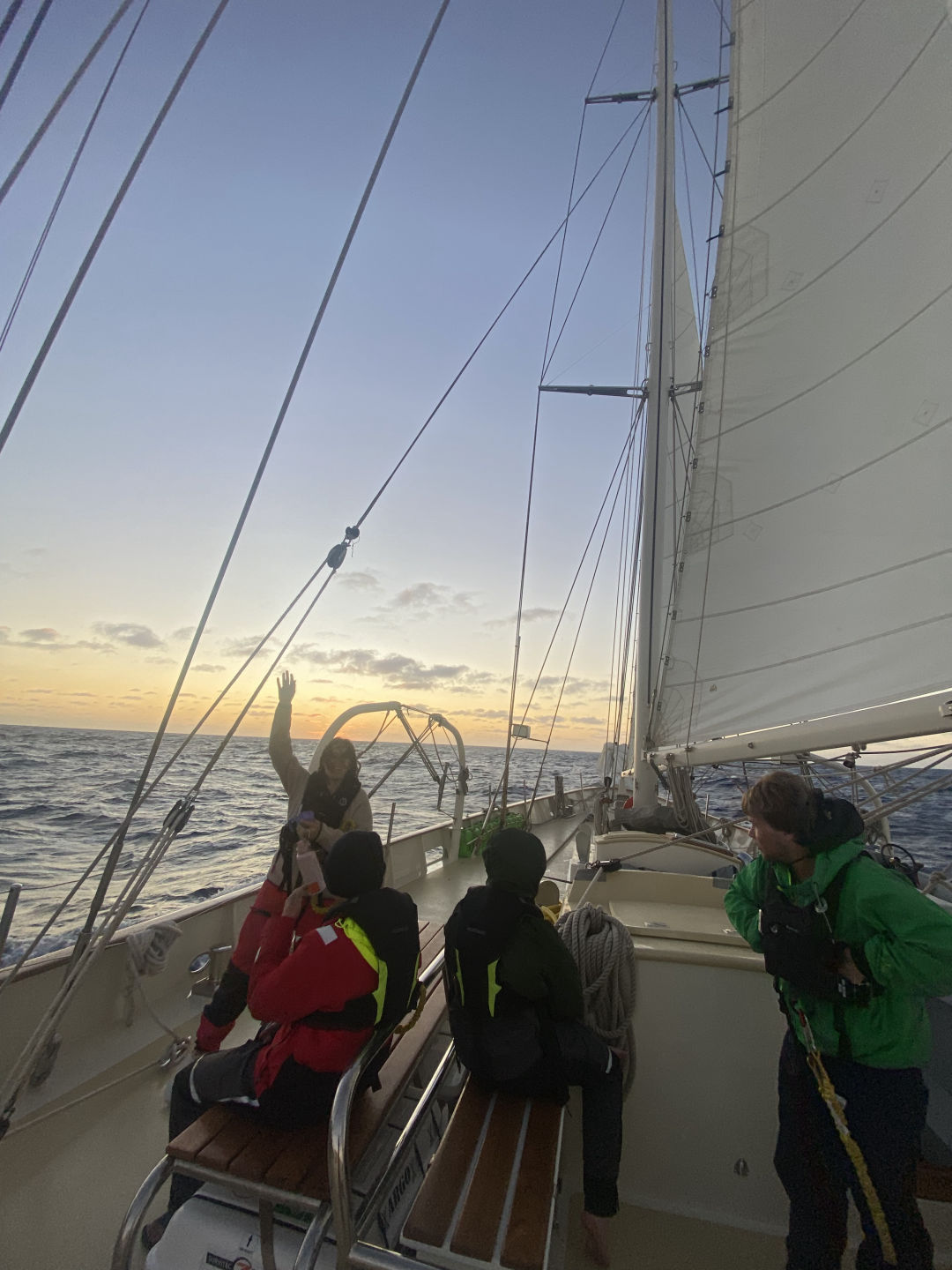 Following classes, I caught up on some of my work and then joined Audrey in the hunt for her missing computer charger. Dinner was prepared by our head chef Ben and our sous chefs, MG and David, and can I just say that they killed it? Chicken tenders, brussel sprouts, and mashed potatoes? Scrumptious. The endless horizon over here seems to be shaping up for a brilliant sunset which I will get the privilege of witnessing on my 6-8 dog watch. It’s been super cool to see everyone adjust to life on passage, and it truly seems like we’ve started to get our routine down, which has been so cool to see. Still crossing my fingers that we’ll be able to see whale sharks in St. Helena. Excited to wish the endless ocean goodnight before going to bed in prep for my 4 am watch tomorrow morning.