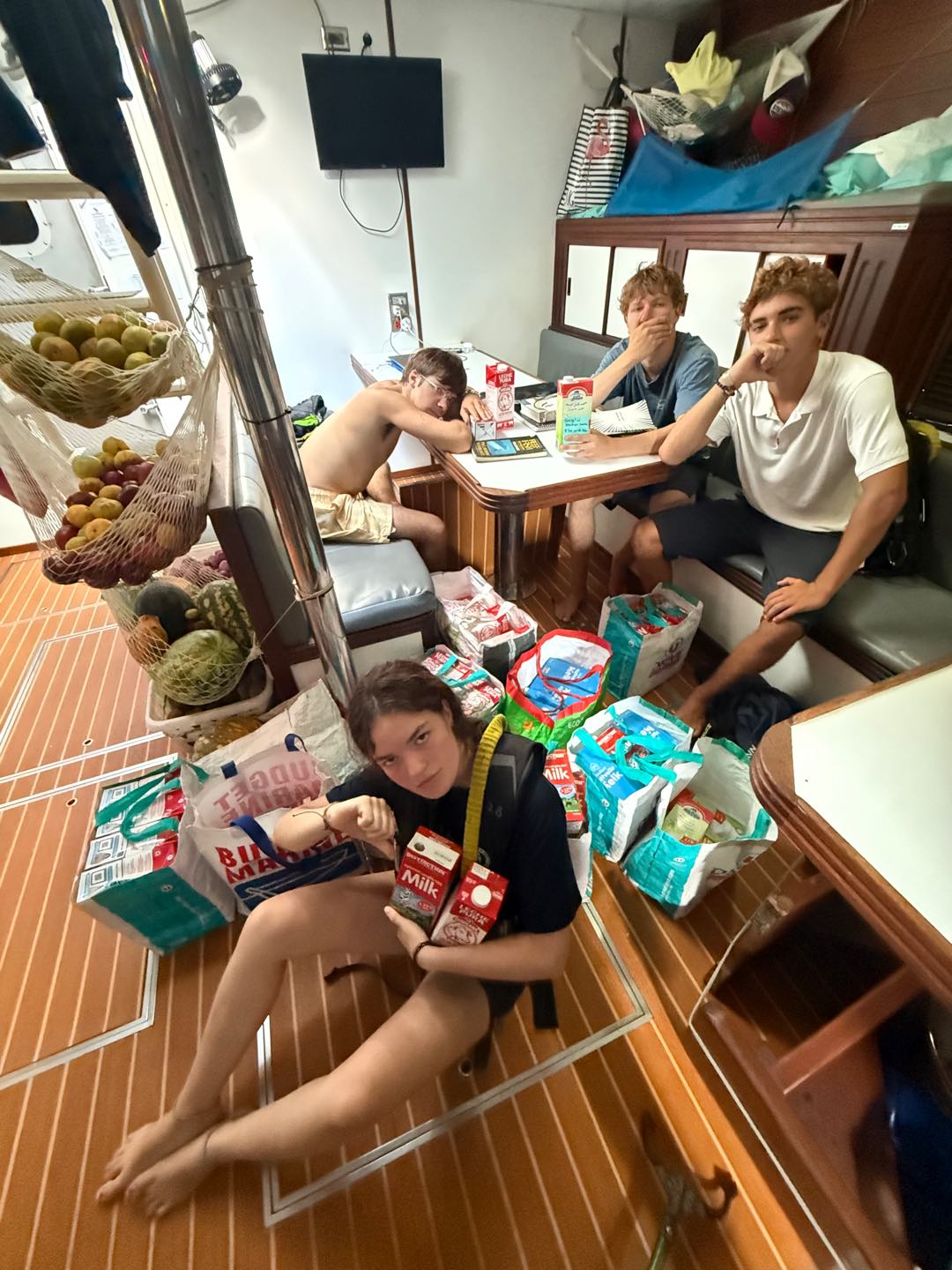Today was just another average day sailing across the Pacific Ocean, from eventful watch team shenanigans, mystery solving, class, and crafts with Nick, today was definitely a fun day! During watch last night watch team 1 (my watch team) came to the conclusion we need to stop the milk moochers, these people have become a serious problem here on Argo, to the point were we only had 28 cartons left in the milge (milk bilge) which originally held 80. If we did not go to extreme lengths to make sure we would have enough milk for this passage the consequences would have been detrimental for all of us, especially Arthur after a great 7.5 hours of sleep it was time to start a new day, hanging out in the cockpit, listening to music, and drinking coffee was an amazing way to start the day. During the 8-12, we were tasked with finding the extra milk provisions located in the dark depths of Phil’s bed in the folks’ hole. And I know you are all on the edge of your seats, so I am pleased to tell you that we located another 100 cartons of milk!!! After a delicious lunch, we were all ready to lock in for class, in marine bio with Meg, we learned about the continental shelf and open ocean, and after a quick 15-minute nap between classes, we were all ready (for the most part) to take on our final lesson in nav master: course to steer. The rest of the day, some of us watched a movie in the salon, worked on homework, or learned how to splice a rope with Nick. Today, the squeeze question was: what is one snack that reminds you of your childhood? (thanks Stella) And it definitely made us all crave a sweet treat after dinner (I am currently eating Oreos, and Ruby has a spoonful of Nutella). So after all the events of the day it’s pretty hard to complain about the little things, becoming closer with 29 people who use to be strangers (not that we could get any closer) it is pretty incredible what we can accomplish!