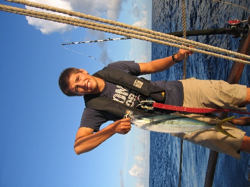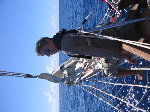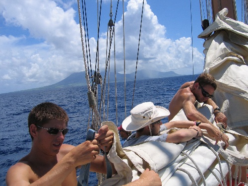 Watch team two started at 04:00, to Ocean Star sailing well in the dark sea. I had my first experience at the helm of a large schooner, and it took me a while to get in the groove and keep her on course. She is a giant beauty! Theo, Mark, and I greeted a flying fish on the bow and threw the bright blue visitor back into the water. The sun rose on the port bow over the island of Saba, and our watch was relieved at 07:00. Mark caught a beautiful 16-inch rainbow runner but released it as it wouldn’t have been good eats for the crew. We were woken again at 12:30 and relieved Captain Simons’s watch to bring the boat to anchor in Nevis. While Simon and Boomer cleared immigration, the crew set about “boat appreciation,” which is a thorough cleaning and scrubbing of Ocean Star after our first passage in her. As she took great care of us, we made sure to keep her clean and happy. We then ate dinner and had our first scheduling meeting. Theo accidentally swallowed some of Dan’s crazy hot sauce and was practically crying as she drank milk and ate bread. There were no mutinies as the crew agreed on the schedule of upcoming classes for the next week. We had some gusty wind just before bed, around 45 knots, so rolled the tarps before going to bed after the wind dropped.