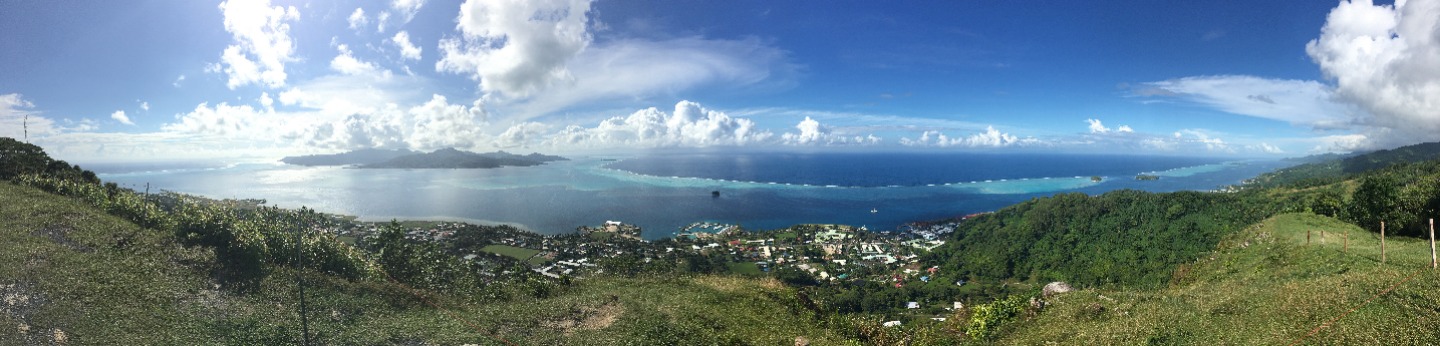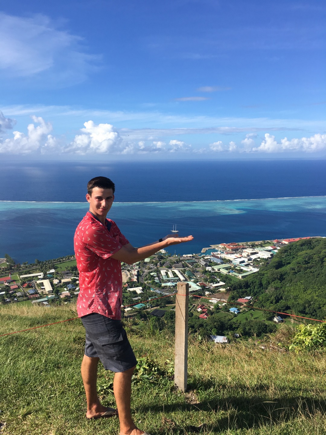 I was watching the sunrise on the bowsprit when a stingray launched itself out of the ocean right in front of me. We woke up on the beautiful Island of Tahaa, where we had dived the day before. Our chefs for the day prepared us breakfast polenta, and afterward, we prepped the boat to leave for Raiatea. While underway, we had our 3rd marine biology lesson today, where we learned about the different types of seaweed that we have seen along our journey. When we arrived at Raiatea, we were excited to spend the day in the 2nd largest town in Tahiti, Uturoa, where we were set loose and searched for the elusive WI-FI so that we could reconnect with the outside world. We had lunch at a small restaurant on the coast, where we ate Poisson cru (raw fish in coconut), pizza, and cheeseburgers with vanilla milkshakes. After I left with my friend Griffin, we took off to climb to the highest point of the island, Tapioi Mountain. After a few detours, interactions with French-speaking locals, and a few cows later, we reached the top and witnessed the incredible lagoon northeast of the island, where we snapped a few pictures. After the hike, we returned to town and reconnected with the rest of the crew to buy snacks at a local convenience store and explored the town some more. We returned to the boat at 4:30, where we took our daily jump-in showers and prepared for dinner. A picturesque sunset ended this incredible day down here in the middle of the Pacific.