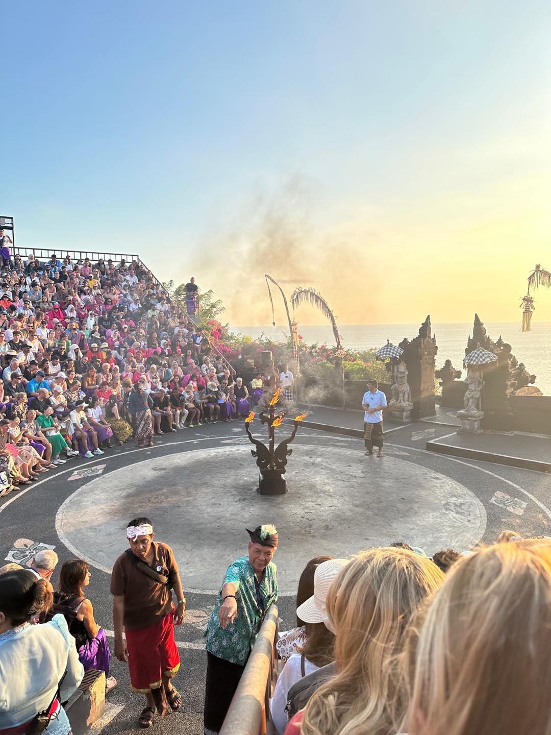 At 6 pm, we headed to the main stage for the infamous Bali Kecak Dance, which was composed of about thirty male dancers sitting in a circle chanting the words cha cha, rhythmically creating a hypotonic sound, representing an army of monkeys communicating with the gods. The dance was performed at sunset, with the backdrop of the oceans azure contrasting nicely with the vibrant colors of the fabric the actors wore and the mounts of heaping fire at the end of the show. The woman dancers moved their fingers very unnaturally. This was the story I got from the performance: a good guy monkey king (white) helps rescue the princes wife from a demon king (red), and the good guy monkey king saves the day. There was also a red money king, but god knows how hes involved. The white monkey king employed many hijinks by scurrying around the platform and messing with peoples hair and clothing. Some were more pissed off than others, although I was just glad he came to where we were sitting.
