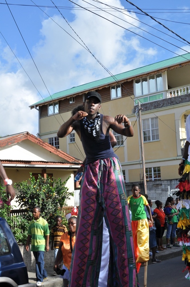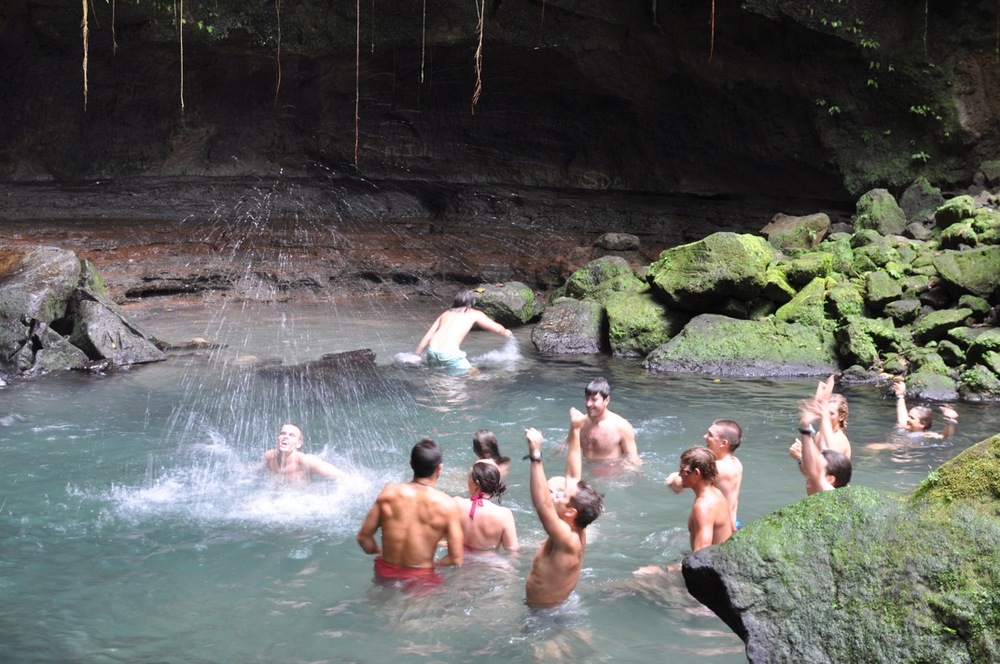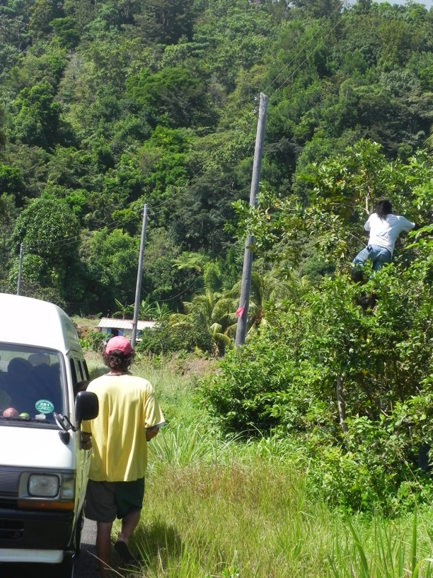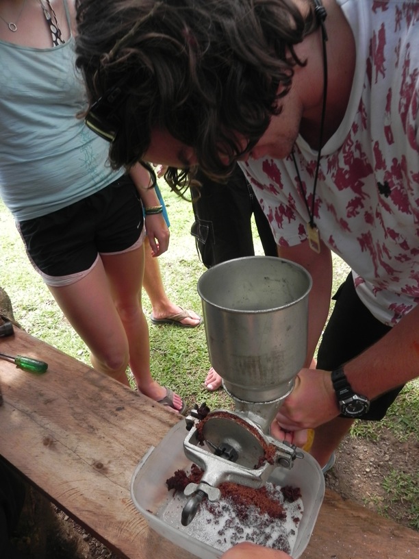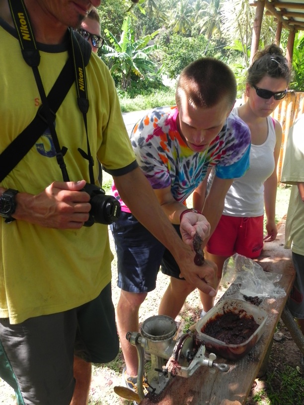 This morning was an early one. With a quick breakfast at 7 am, the group was onshore and ready for the Sea Cat tour around the island. Everyone piled in the vans and began a tour of the island, learning about its history and agriculture, all the while eating mass quantities of fruit: sugarcane, grapefruit, bananas, mangoes, passion fruit, the works. Included was clearly making chocolate from cocoa beans. We have rough lives. We visited Emerald Falls, an absolutely beautiful waterfall, and went to enjoy the opening parade of Carnival, where street performers were as colorful as the scenery around us. Still sore from the hike yesterday, everyone breathed a silent, small sigh of relief at getting to ride in a car. But with Sea Cat zooming around the island, honking at everyone he knows, the group’s most amusing point was watching him scurry into the jungles and up the trees to cut down mass quantities of fruit for everyone to enjoy. The resulting sugar high and piqued interest turned everyone into monkey-like tree climbers, turning below decks on Argo into a fruit container ship. It was a fantastic, delicious-food-filled day.