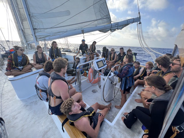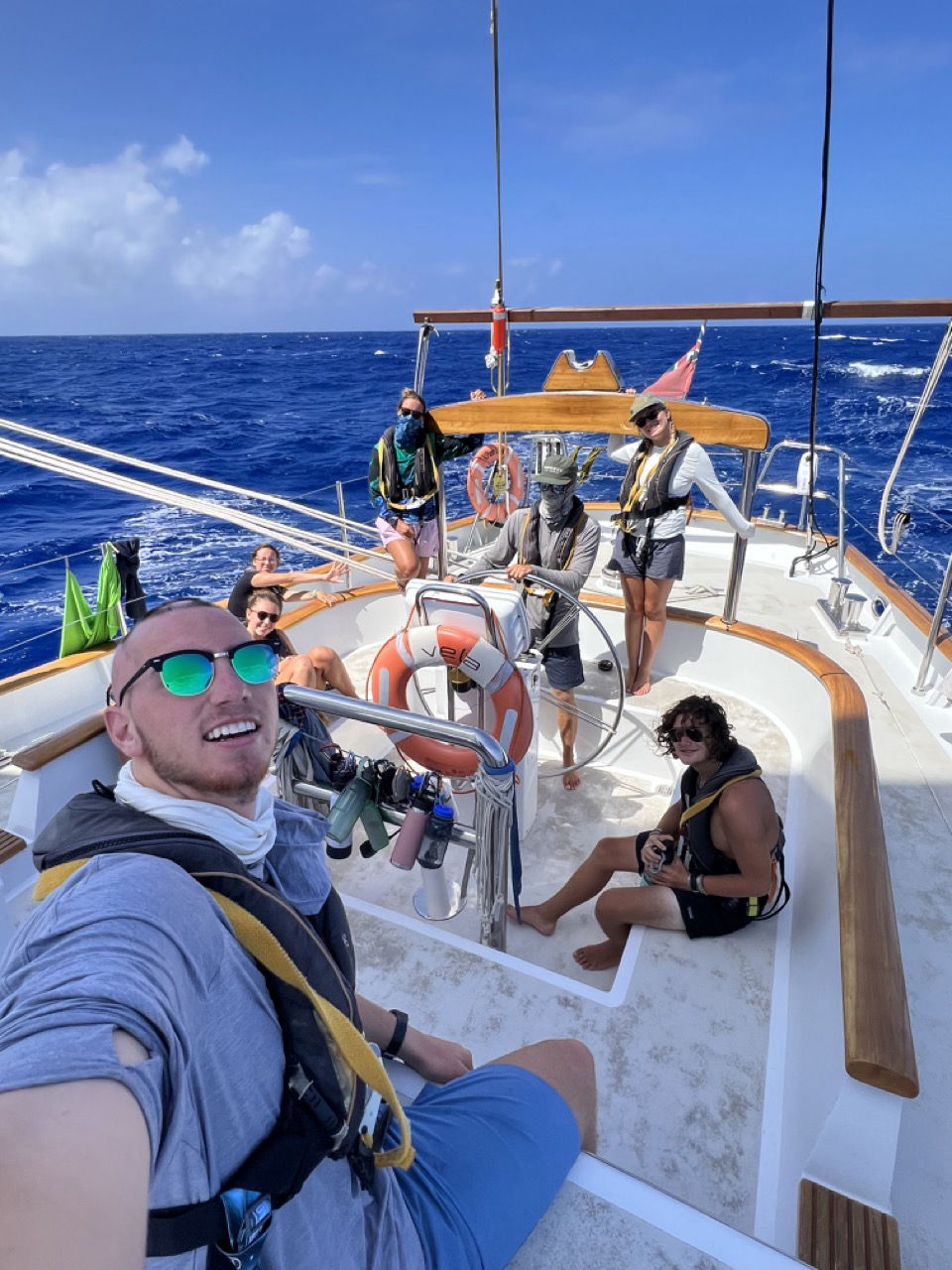 This Friday marked our first full week into passage and the end of a series of daunting due dates, which we were all relieved to get beyond. The rhythm of the passage has set in, and the constant chaos and noise have died off for the most part. We all have begun to enjoy the little things a bit more. Of course, there are still moments of great excitement, like big waves splashing over the deck and engulfing Daniel while he was trash master. However, buy in large, the sweetness is found in the smile you get after handing someone a tea or coffee you’ve made them on watch. Things have slowed down and given us a chance to find peace in the simple daily roles we have adopted. There was much excitement at lunch as well as dinner, which ended on a high note with all of us screaming at the top of our lungs in harmony. It’s nice knowing all the art and genuinely funny moments that we get to revel in each day are a product of our journey into the ocean and away from the distractions of the world back home. There’s been a shift from the goal of getting to Mauritius to the opportunity of getting the most out of each moment of passage. Each day, we find ourselves resonating more out of the compassion of the heart as the long hours drifting through the sea are no longer something that we do as individuals but as a unified self. Heading forward toward Tom’s circumnavigation, everyone seems to be excited to pitch in for the upcoming celebration with drawings, delicious baked goods, and lots of congratulations. Although our captain has been sailing for many years beyond us, we get to share the joy that is being in the middle of the Indian Ocean together.