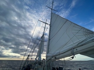 If you ever find yourself taking a keelboat sailing class, you will be taught to use an engine. You will use an engine to motor into the wind to put up the mainsail, you will use an engine while you put in a reef, and you will use an engine while dropping an anchor. Engines and propellors have become a required part of sailing in the 21st century. Sailors of yore would think us weak. You dont need an engine to put up the main, to reef a sail, or to drop an anchor. People had been doing those things just fine for thousands of years before anyone had ever heard of a Caterpillar C7. On the night after Halloween, following a ceremony to appease the wizards of the Lemurian Diamond, our propellor shaft angrily severed itself from the rest of the boat. It sank down into the depths where only the Kraken and ghost of Clayson may be found. Now, we cant use an engine, and its fine. We now raise, lower, and reef our sails in the same way that they would have done in the 18th century when schooners first became fashionable, and in many ways, it works better. We have been lying to ourselves this whole time: engines are not essential. An update on helmsonas: Kackie: Helms Angels Ainsley: Chris Helmsworth Gabe: Helm or High Water Will: A Little Helm From My Friends Juliette: Helman of Troy Philip: Helmlich Manuever Amanda M: Helmnable Lector Charlie: Duke Helmington We are currently doing our best to slow down, so that we arrive to the anchorage in the morning. As such, we have dropped all sails apart from the jib and the triple-reefed main. We look absurd. Tonight, for the Squeeze, I asked everyone to pick an item owned by another person that they would like to trade for. Everyone had fun haggling for each others stickers, t-shirts, and water bottles. Travis and Will traded headphones for a hard drive. Allie and Kackie failed to reach a deal to trade pajamas. Tomer said he had no worldly desires for material possessions and abstained from the question. At long last, Mauritius came into sight this morning. Alas, no cell service yet. I guess the 18th century is going to last a little bit longer.