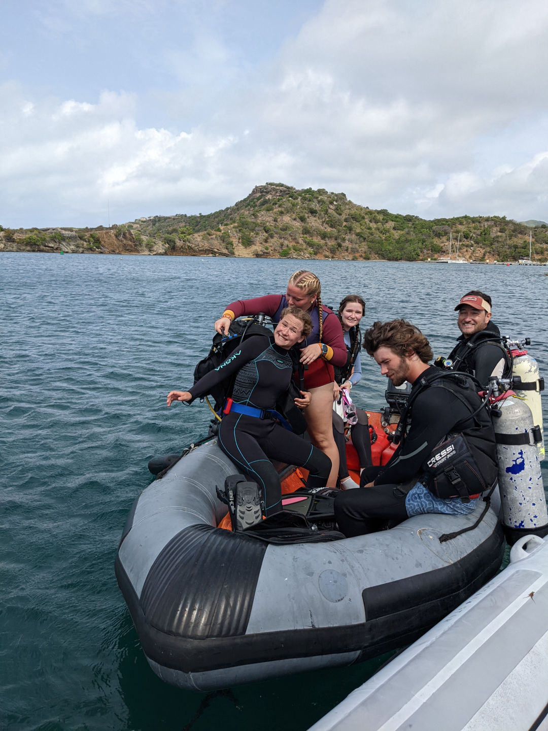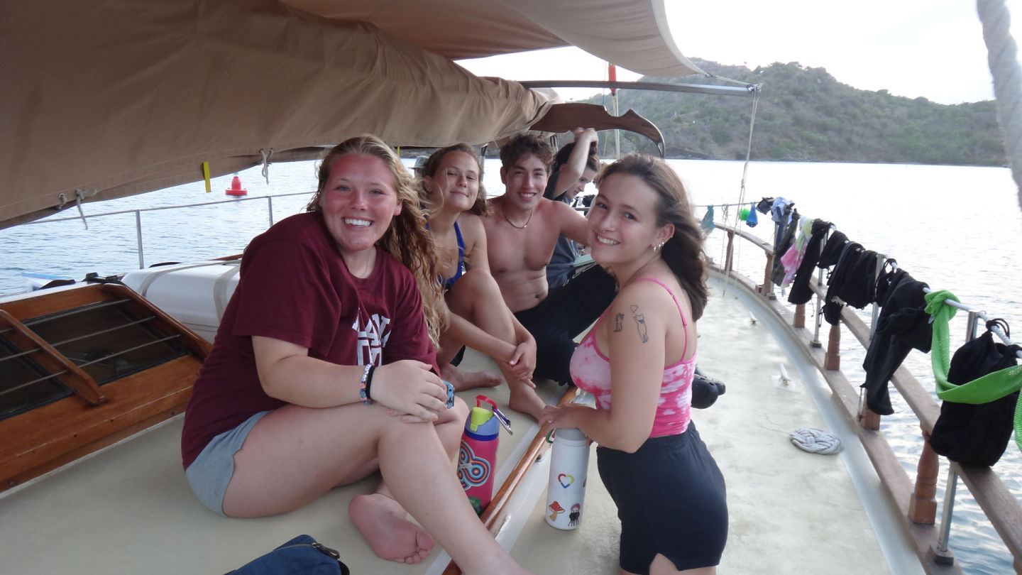 Another day at anchor in Antigua and another day of diving. Last night we had our very first seamanship class with Nick, which helped us get our bearings straight and learn more about our home for the next six weeks. For some individuals, this class was followed by an anchor watch. My shift was from 2-3 am, a very exciting time to be awake. As skipper, I planned to wake the crew at 7 am by banging pots and pans together. However, I decided a gentle pat might be better this early on in the trip. After a very yummy breakfast with yogurt and fruit, we started the morning strong with the students working on their open water certifications and working on their confined water skills! While one group hit the water, the rest were on the boat, working on their knot-tying skills and dive theory. Although there is often not much to see in the 7ft of confined water, we spotted a baby octopus which was very exciting! After lunch and cleanup, more groups went to practice their dive skills. The rest of the crew learned about dive tables and had to take a test. All I can say is I am glad I was with the divers:)