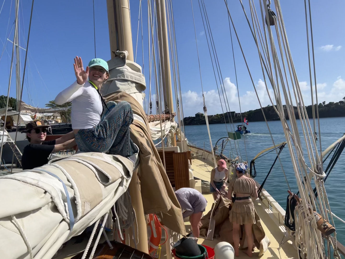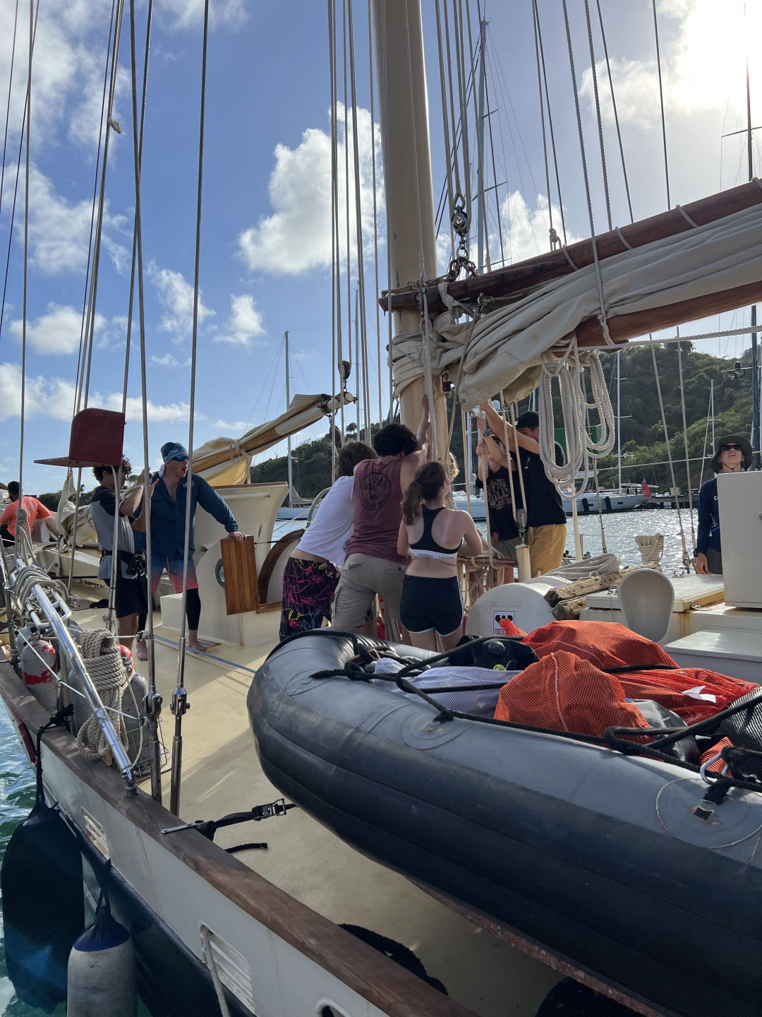 Another beautiful morning on the Ocean Star! Today we moved from our anchorage back to the fuel dock in preparation for our upcoming sail to Nevis. Head chef Griffin made us some delicious banana bread and risotto balls for breakfast. Then, as we began our journey back to English Harbour, we began marine biology class and learned about the first video footage of the giant squid, as well as some of the history behind the field. However, most of us had to climb back on deck to listen to class through the stairwell as we battled seasickness (sorry, Heather!). After recovering, we danced around for a bit and almost lost someone through the gopher hole. When we arrived at the dock, to our surprise, we got to watch one of the team’s row to the finish line of the Atlantic Challenge! For lunch, we had quinoa bowls and hurried to finish clean up in record time. Then, after lunch, we had a leadership class. Ash talked us through an informative quiz where we learned about our leadership styles and discussed our different thought processes. The Greens turned on everyone after learning that they were cast as the peacemakers of the group. I am excited to see how we grow throughout the trip because we will be doing the quiz again, except answering for each other. Next, we successfully completed passage prep. We finally looked like real sailors sweating the lines together. Thanks to Eva for climbing on top of the boom, because I was afraid to do that! After securing the boat for our upcoming sail, we had a safety meeting in preparation for our first onshore excursion at Nelson’s Dockyard. We picked up some extra trinkets, including a giant fly swatter which has already been used to destroy 17 mosquitoes below deck. While some of the girls went for a dress shopping trip, Casey informed me that the rest of the group sought out some jerked chicken wings as a snack. After our shore time, we had our first sign-out and enjoyed dinner together at a French restaurant.