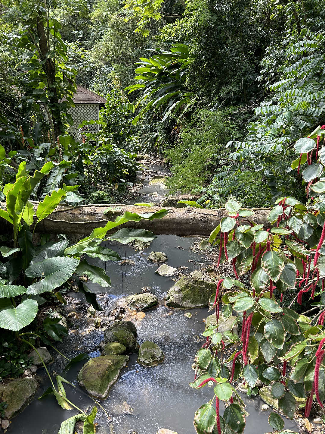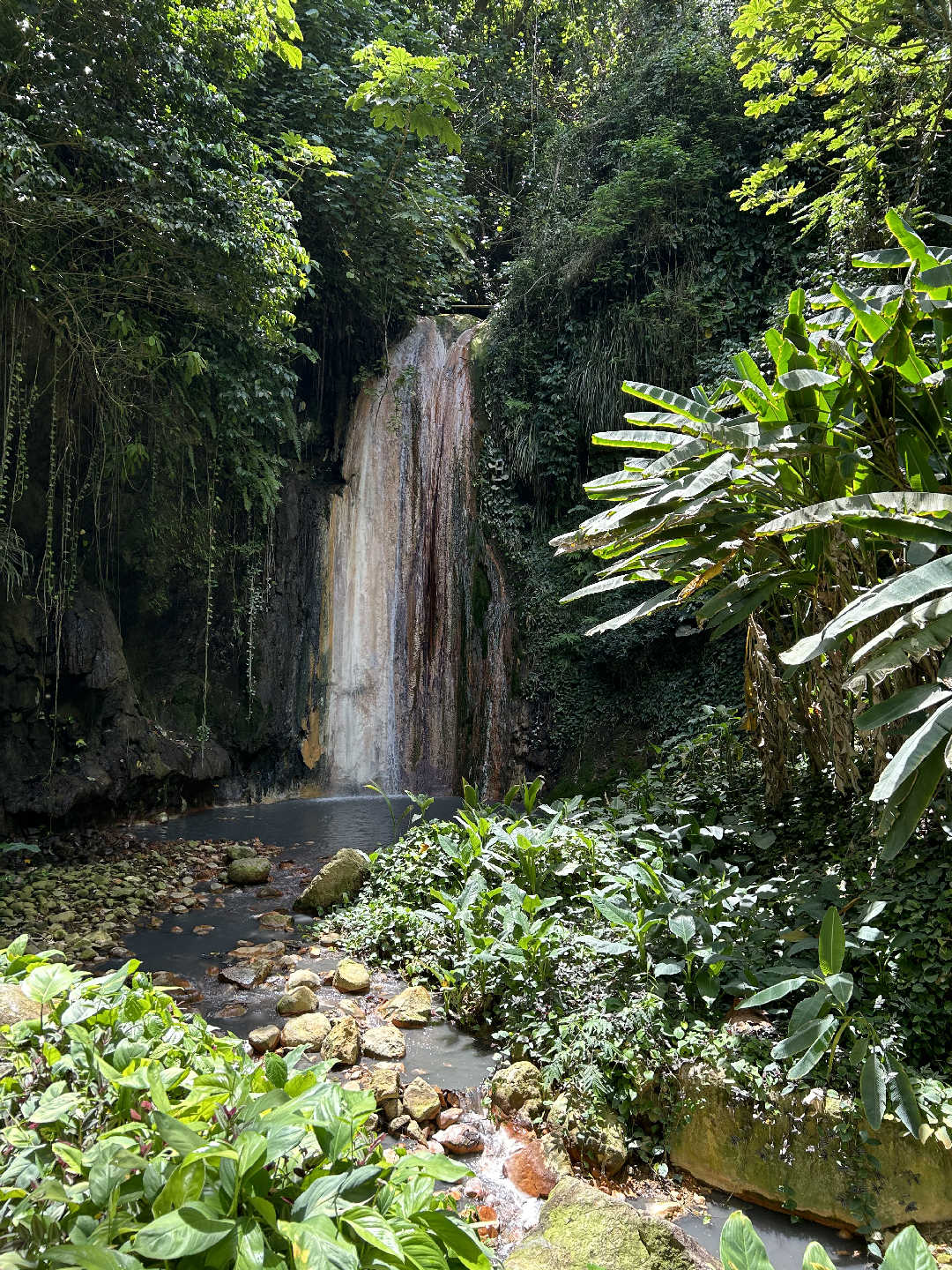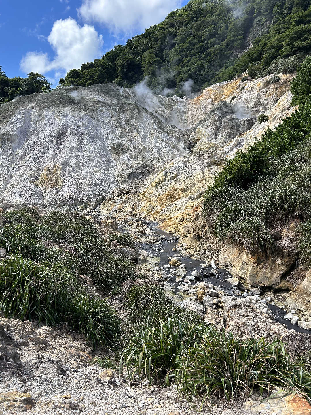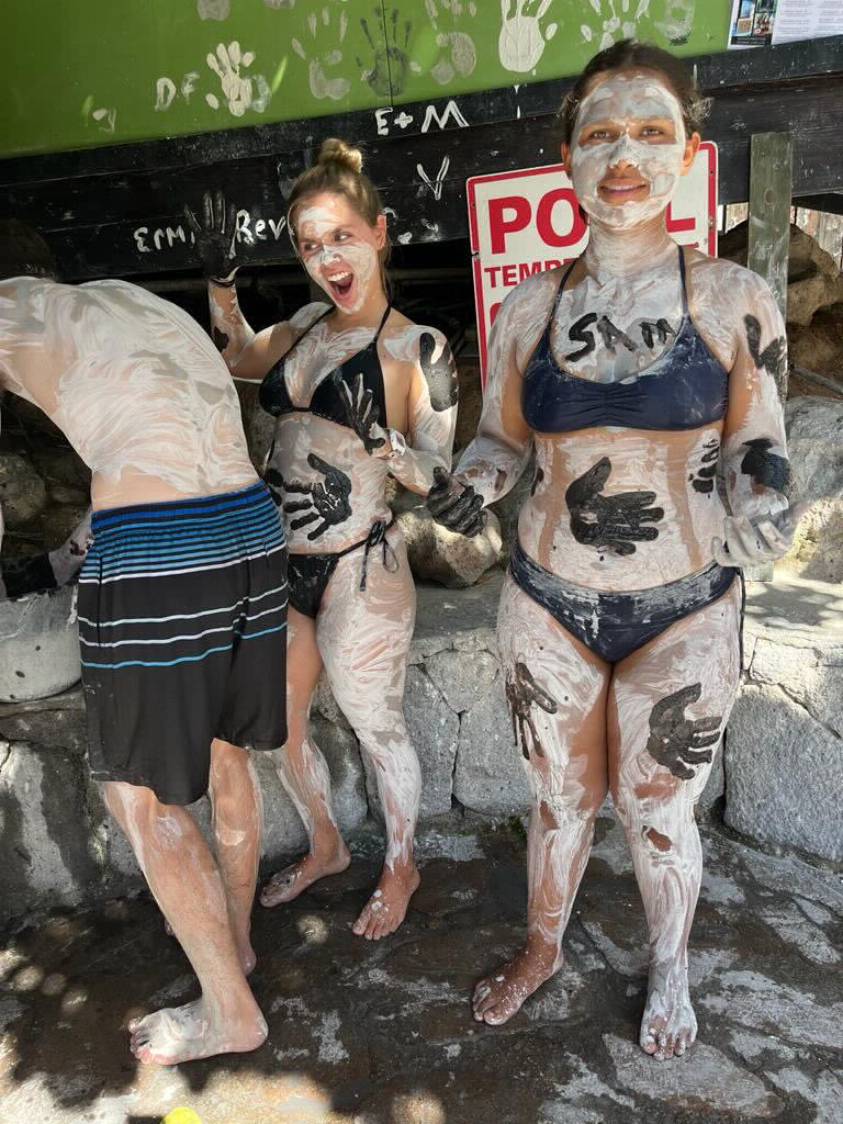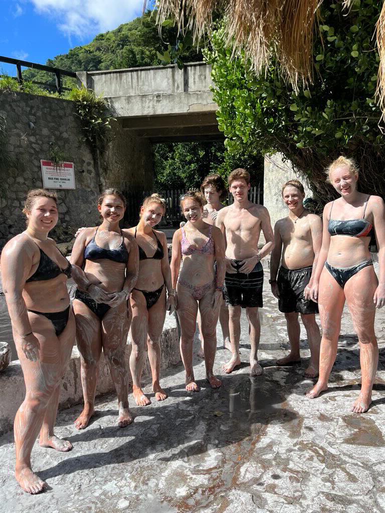 Today was a wonderful adventure. We had a yummy breakfast and packed our lunches for our excursion. We started our day at the mud baths near the drive-through volcano. We sat in the hot springs and then covered our bodies with grayish mud that was filled with minerals. The mud also exfoliated our skin. The mud dried, and then we painted designs on ourselves and others with darker mud. After, we washed the mud off in the hot springs and took a freshwater shower to rinse off the rest. It was a fun experience, and my skin felt so soft afterward. Then we ventured to the volcano, which was really neat. It smelled of sulfur, and there was water boiling and spurting. Our guide gave us information about the volcano as we walked, and it was interesting to learn about it. We left the volcano and went to the botanical gardens which were beautiful. For lunch, we stopped by a local restaurant, where we ate amazing food. Then, we went to another hot spring on our way back to the boat. There was a waterfall, and it was amazing and serene. We chilled on the beach for a little while and then headed back to the boat. Our day was pretty wonderful.