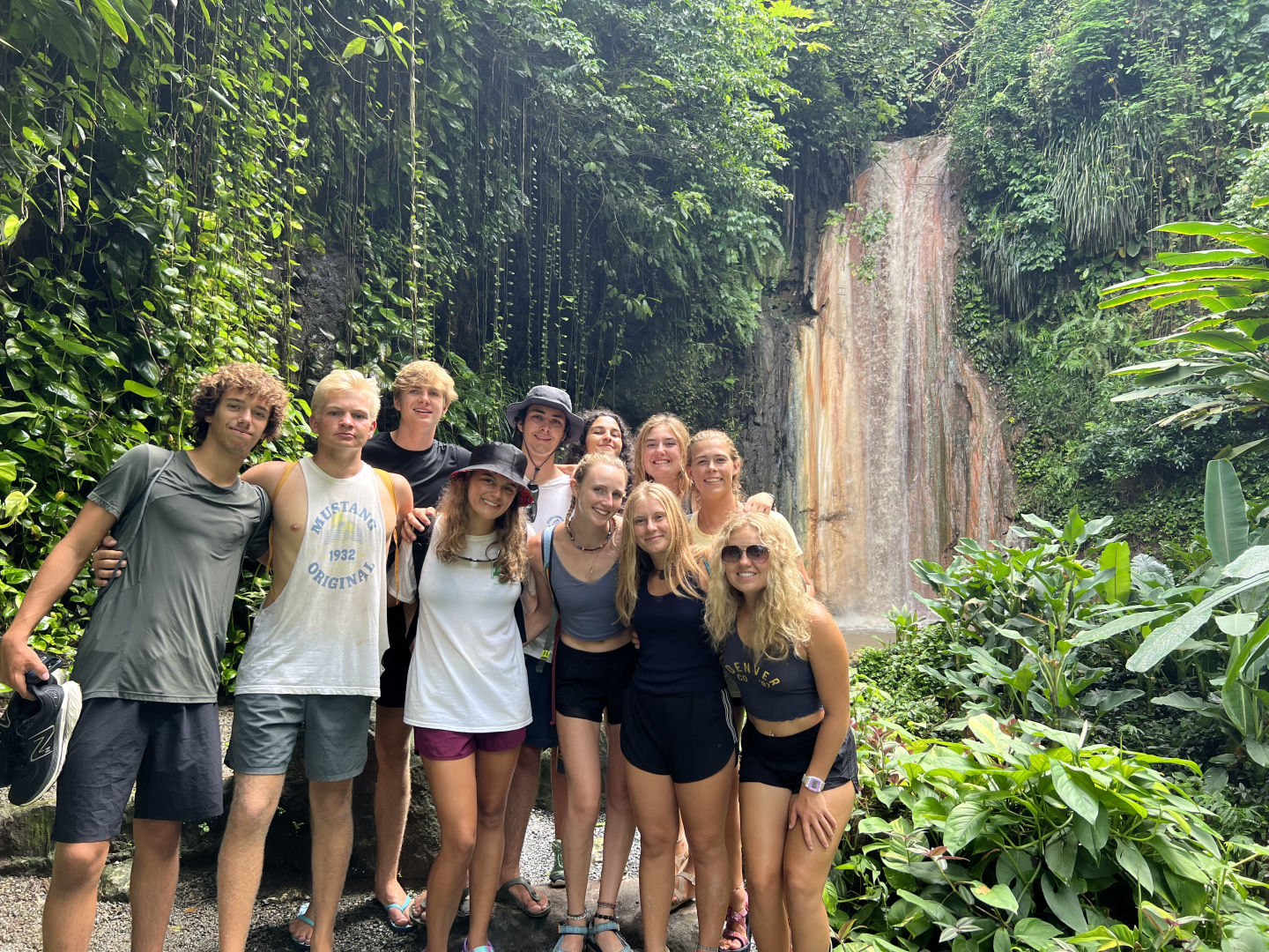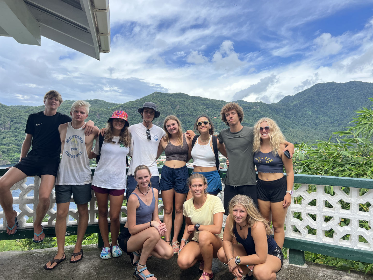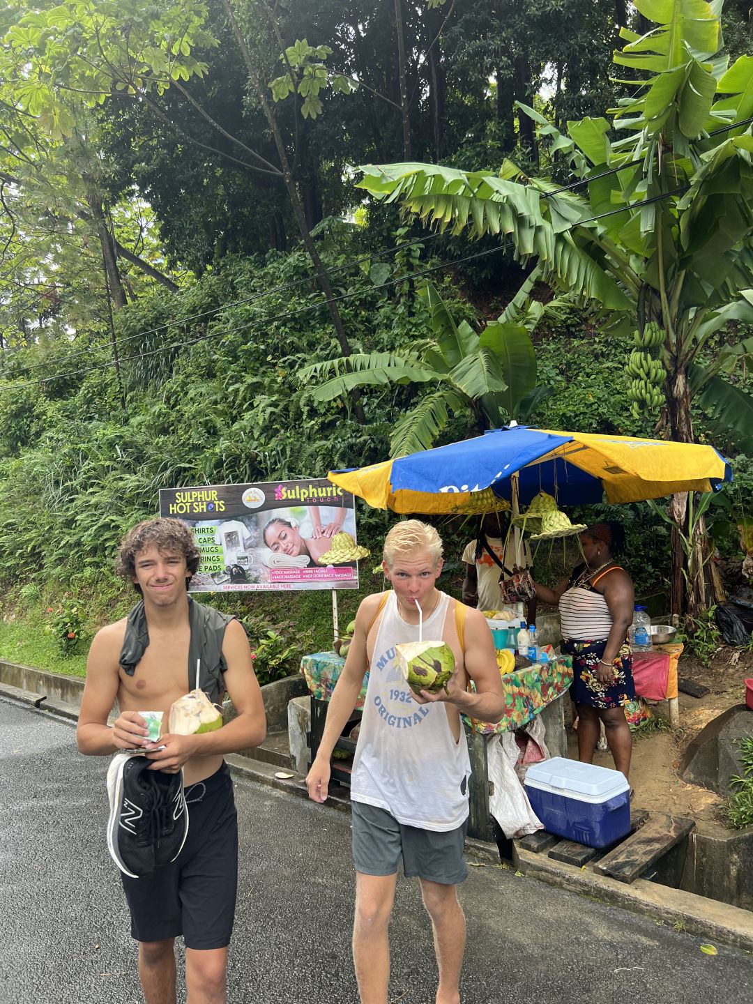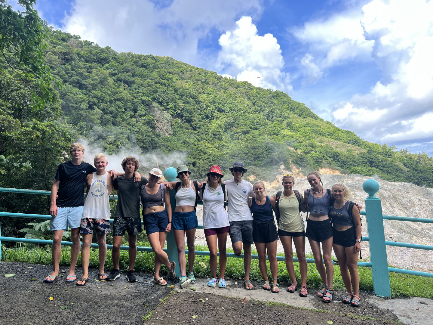 What another amazing day with Seamester! Today, we got to explore Saint Lucia and all the amazing things it has to offer. The morning started with oatmeal and fruit, then we all got ready to head ashore. After meeting up with our taxi driver, we headed to our first destination, volcano and mud baths. We went inside the crater of the volcano, which was really a caldera because the land had sunk in. This caldera, very similar to Yellowstone, had boiling pits of sulfur, iron, and other minerals. The smell of sulfur was intense, and our clothes would definitely be smelling for a while. We had a guided tour of the volcano to learn a bit more about its properties and history before taking a dip in the hot river and getting a mud bath. We scrubbed our entire bodies with the mud that is said to have exfoliating and healing properties. The mud was grainy and felt very nice, and there was also a darker black mud that was very smooth. Once we were all sufficiently dirty and scrubbed, we washed off in the river that was heated by the caldera. Once finished, we rinsed off and got some souvenirs from the locals nearby. Our taxi driver had decided to get some food in town while we were at the mud pits, so we had to wait for him a bit, but we were in no rush and ate our lunch and enjoyed the scenery. Our next stop was a beautiful botanical garden. We were guided again through the gardens and admired the massive variety of tropical plants and all the beauty they provided while learning about their uses and, for some, their dangers. The botanical garden led to a stunning waterfall, adding to the views we were already taking in. After a quick stop to get ice cream, we continued on our way. Our third and final destination was a hot spring. This was a favorite location among the group as we got to stand under the steaming waterfalls and relax in the hot spring pools. Feeling refreshed, we headed back to the boat, where we had to center our minds and thoughts to take our oceanography midterm. We all feel much better having that over with, and we enjoyed our usual playful boat shower and a lovely sunset. We have a movie night planned to celebrate the midterms being over, and I think we will all enjoy our last night here at Saint Lucia!