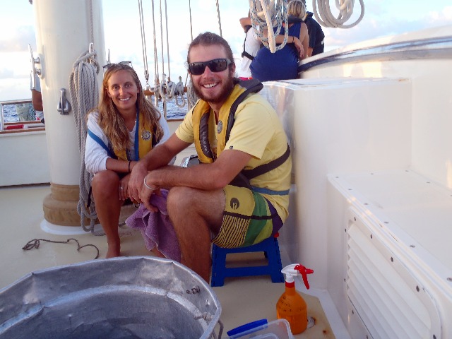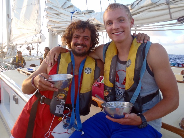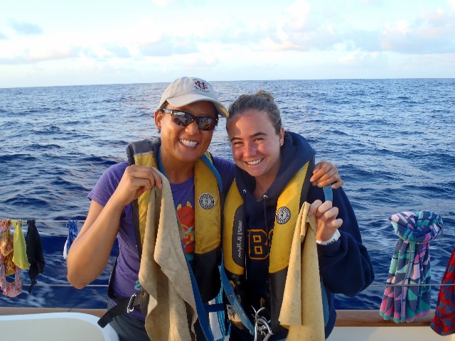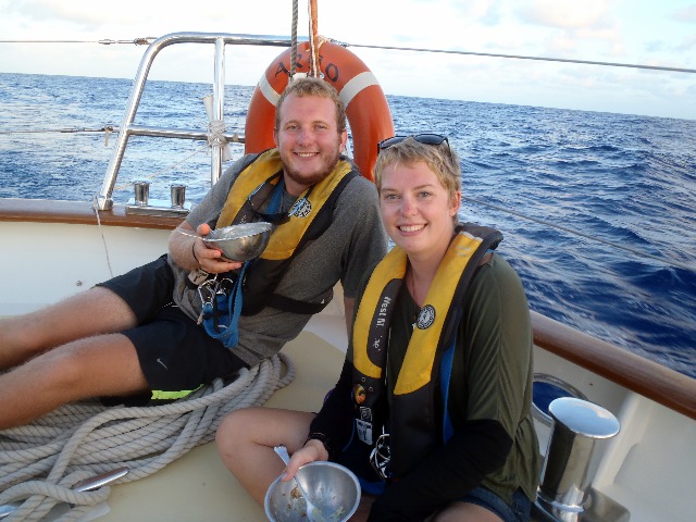We woke up this morning to clear skies and light wind (too light)! We had to turn on the engine last night for the first time in over a week! It’s also the warmest weather we have had since leaving Cocos. We had a delicious lunch of chicken and pasta with a choice of pesto or marinara, and after a record time, cleanup headed down below for classes. Before learning about marine birds and reptiles in today’s OCB class, we had a species ID quiz. As part of the class, everyone has to keep a log of species they identify during dives or from Argo (everything from reticulated damselfish and sea cucumbers to spinner dolphins and frigate birds) and also take a series of short species identification quizzes. As the OCB instructor, I was pretty pleased when I heard reports after the first dives of the semester that they had seen almost all of the species from their first quiz. I love it when class and experiences can complement each other! After OCB, it was time for MTE, during which they watched a documentary on the life of Irving Johnson, who was an amazing sailor and has been a huge influence on many of the people involved in Seamester. The afternoon concluded with deck showers (the cooler water much welcomed this time around with the toasty sun out today) and some free time before we all gathered back together for our evening squeeze, a dinner of shepherd’s pie, and a beautiful sunset. We are just over a day out from our arrival in Mauritius, and everyone is getting excited about the prospect of land. I think the first item on everyone’s list is ice cream, followed closely by either a walk or run to stretch our legs or the internet to catch up with loved ones. For many of us, it has been almost a month since any form of the internet was seen. I have to admit, it is actually pretty nice. Living on Argo, especially during long passages, is like living in a bubble. You come to really appreciate the company of the people around you, can concentrate on the tasks at hand, enjoy the scenery surrounding you, and really forget about the rest of the world for a little while. We have absolutely no idea what is going on in the rest of the world right now, and to be honest, until we actually reach land, it doesn’t really matter. Although I don’t always agree with the statement ignorance is bliss, it is somewhat true out here at sea, and there is something very blissful and relaxing about being out in the middle of the ocean, away from the rest of the world, in our lovely bubble known as Argo. That being said, I am very much looking forward to hopefully talking with my parents soon and updating them on all of the amazing things that have happened in the past month, including sailing a few thousand miles across the Indian Ocean, swimming with dolphins in one of the most beautiful places I have ever been (Cocos Keeling), and completing my PADI Rescue Diver certification. The ice cream and Skype time with my parents will come soon enough, but for the next 36 hours, I am going to just enjoy the expansive view of the big blue and the company of my shipmates in my bubble.