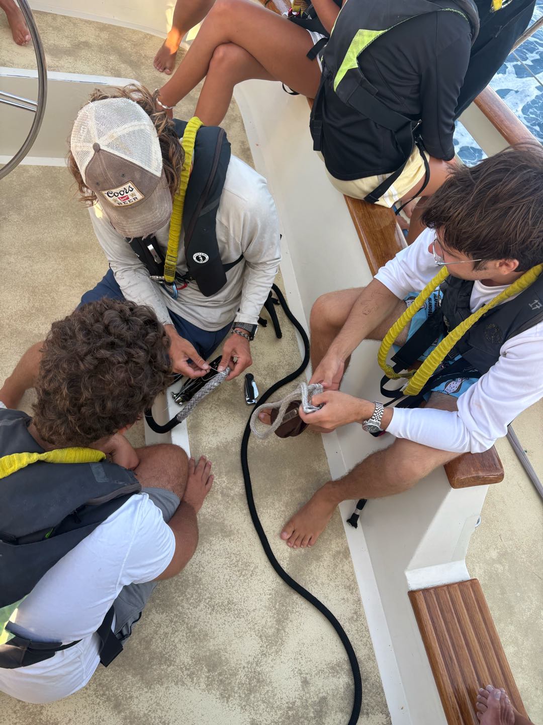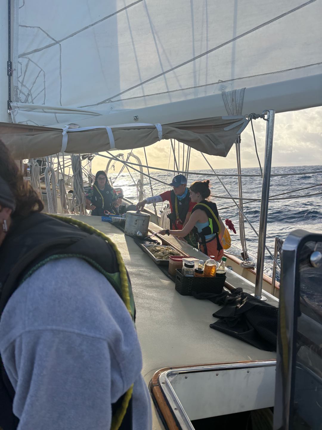Today was the first day of Nav Master Exams. The Nav master course is one of the harder segments of our seamanship classes aboard. We had 9 shipmates take the course today, and two of them were my Professional Skipper course students, Gavi and Martin. I hear they did well! For lunch, we had some lentil curry made by Nacho, and after the Nav Master exam, round 1 started. The shipmates taking the exam spread out in the saloon and Chart House in whatever space they could find to lay their charts. The exam lasted an hour and a half. After watch team 1 did some line splicing while on the afternoon watch, for a new fore staysl preventor. We have been sailing very deep with the wind off our port quarter for the past 8 days now, averaging about 8 knots. Im expecting the wind to die out tonight into tomorrow morning, unfortunately, leaving us with less wind than needed to sail, at which point we will turn on the engine and motor the final week to Nuku Hiva. Im expecting to arrive there on the 5th of April, maybe earlier. With this reduction in wind, we will also be seeing the wave height subside a little bit; currently, they are around 7ft with the occasional 9-footer. I am very happy we were able to sail for this long on this passage, and our students are too! For dinner, we had pumpkin soup and naan, which was delicious!