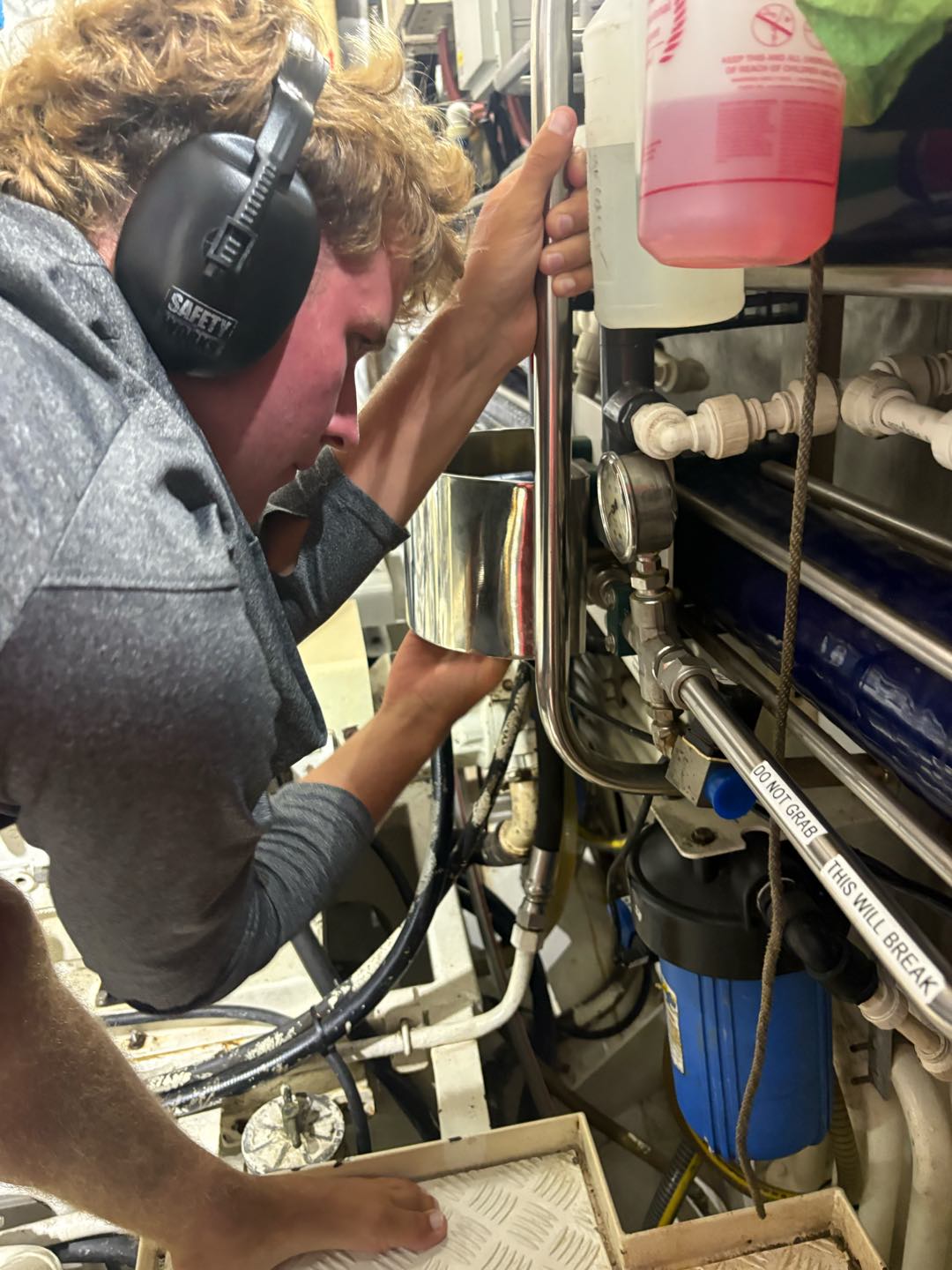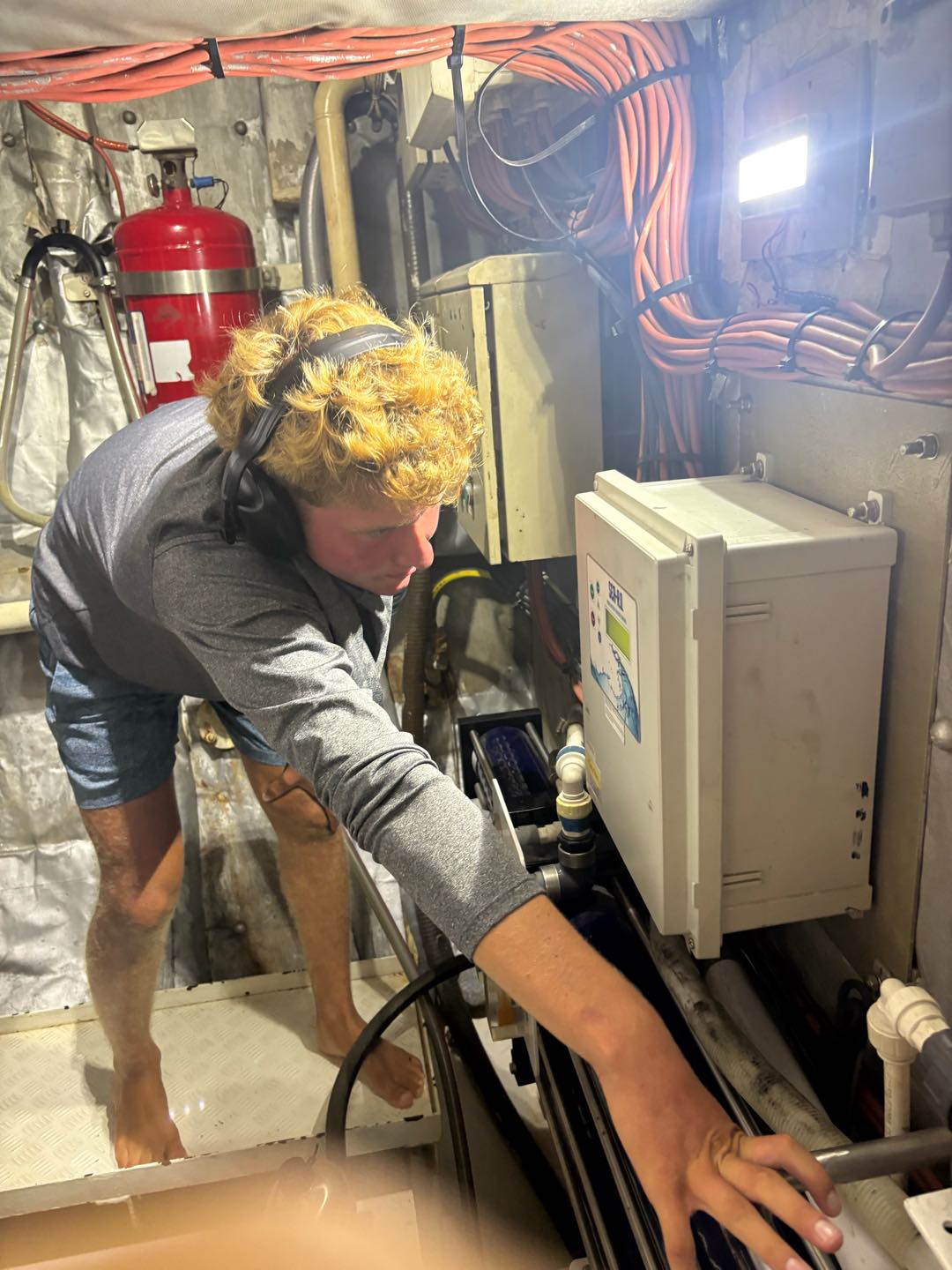 After, Avery and I went into the engine room to turn on the generator and watermaker. We have a pretty sweet watermaker onboard, it makes about 15lpm of drinkable fresh water from seawater. It works by pushing seawater into two tubes that contain semi-permeable membranes, which will only let water through, but not salt. The seawater is pressed into these membranes at 800psi, and on the other side, fresh drinkable water comes out. The salt is then discharged overboard in a highly concentrated seawater mixture called Brine. After we turned on the water maker, I checked the weather for the next few days (still no wind). And with that, I call it a day.
