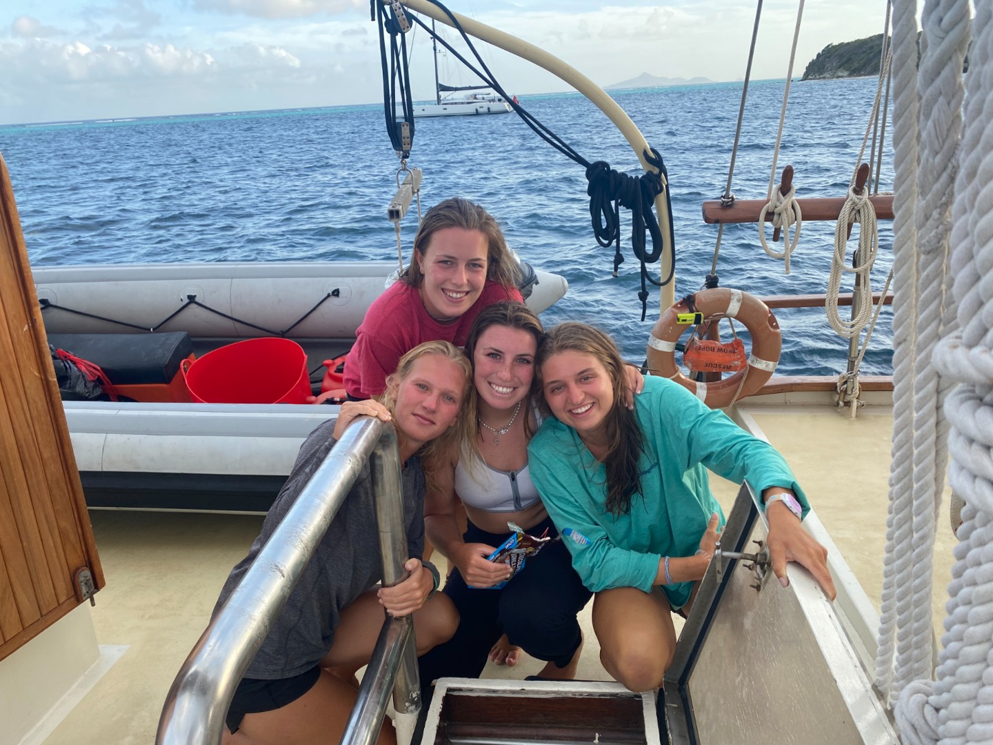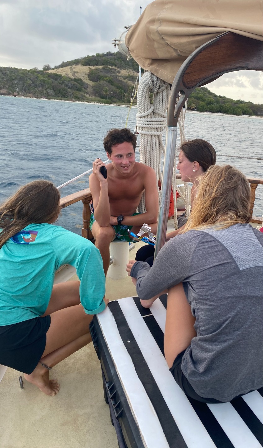 Our marvelous day started off with a delicious breakfast consisting of blueberry bagels and an assortment of delightful jams. After breakfast, we cleaned up our plates and had our first class of the day while we motored down to Tobago Cays. Our Oceanography class consisted of a wonderful presentation by Chris about Hurricanes and how climate change is impacting their frequency and volume. The other part of Sam’s class consisted of something so interesting; it’s best not to go into too much detail! After Oceanography, we had some free time which a majority of us spent taking a well-deserved nap. After getting some extra sleep, we had burgers and fries for lunch which turned out great! Thanks, Head Chef Addisen! After lunch, we had our first class for our nav-master unit that we will be focusing on for the remainder of the trip. In this class, we discussed how to read charts properly and did our best to chart locations on some maps, which went as well as you’d expect. Then, we went snorkeling with the hope of seeing some sea turtles and maybe a shark. We didn’t see the shark today, but we did happen to find a few turtles having a good time. After snorkeling, we had some downtime which some of us used to have some quality time with Chris’s Mom as well as rinse off and relax. Ann Newton, if you’re reading this, Meg and Keaton said to say Hi! We then had an amazing mac and cheese dinner, which was the first mac and cheese I’ve ever thoroughly enjoyed. After this, I came up with an amazing question on the spot on what everyone’s favorite island on our voyage had been so far. Now, I’m currently writing this blog, so I can’t tell you what happens next! That’s going to be Steve’s job, so I wish him the best of luck! This has been your faithful skipper, signing off!