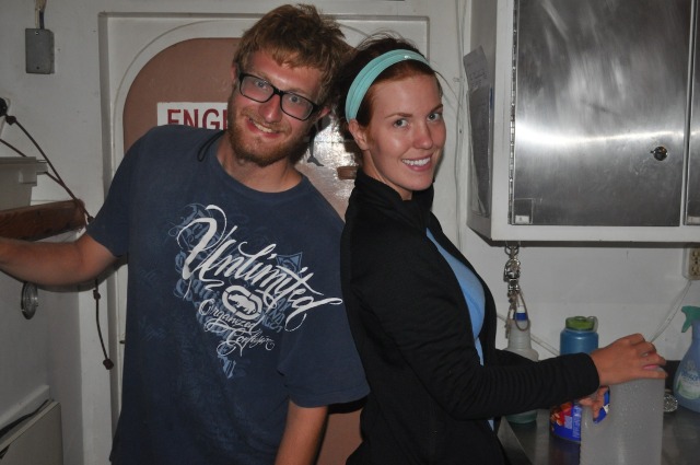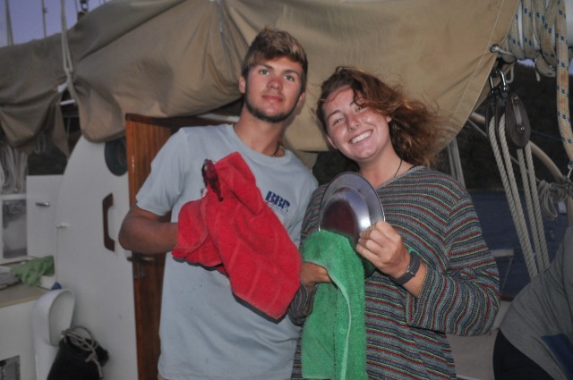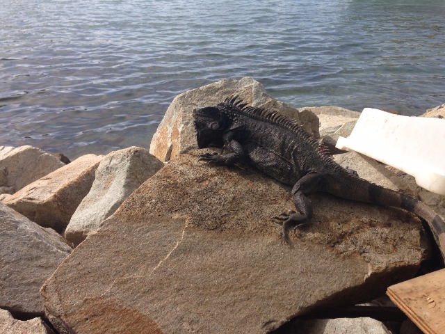 The main thing on the agenda today was our Navigation Master exam – the culmination of the second half of MTE this semester and our final exam. We have spent the past month learning how to do everything from plot positions to determining the course to steer when taking into account the effects of tides and currents. We took the exams in shifts as we needed a lot of space to do the chartwork, so when we weren’t taking the exam, we spent the day studying or just relaxing up on deck, with the exception of Alaina and Carolyn, who decided to do a hike around Peter Island. They reported that it was pretty hot, but there were beautiful views and a guest appearance by an iguana! After everyone completed exams, we went to the nearby restaurant to just relax off the boat (and maybe have some calamari), then were greeted back on the boat with dinner and some celebratory banana-oatmeal-chocolate chip cookies. We are excited to be done with academics for the semester and are looking forward to a few days of just sailing, diving, and enjoying each other’s company before we leave!