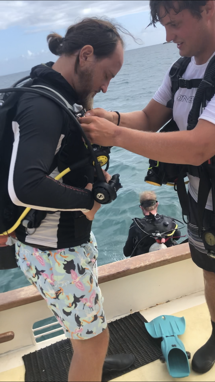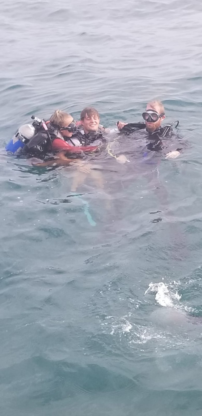 Caleb remained back at the boat to do some of his divemaster training. Everyone has been waiting for today as he had to lead “new” divers through a discovery dive. Ash (aka Ashley), Steve (Aka Sid), and Sydnei (Aka Stevie) acted as new divers, and we were anxiously waiting to see how they would act. They did not let us down as we returned to the boat, and they were successfully making Caleb work hard to control the novice divers. As we climbed back on the boat, all we see is Caleb trying to keep Ash from jumping in the water without his BCD on properly and Steve and Sydnei in the water, having jumped in before they were supposed to. Everyone lined up along the deck, watching Caleb try to lead a group of uncooperative divers and getting a good laugh at the creativeness of our instructors.