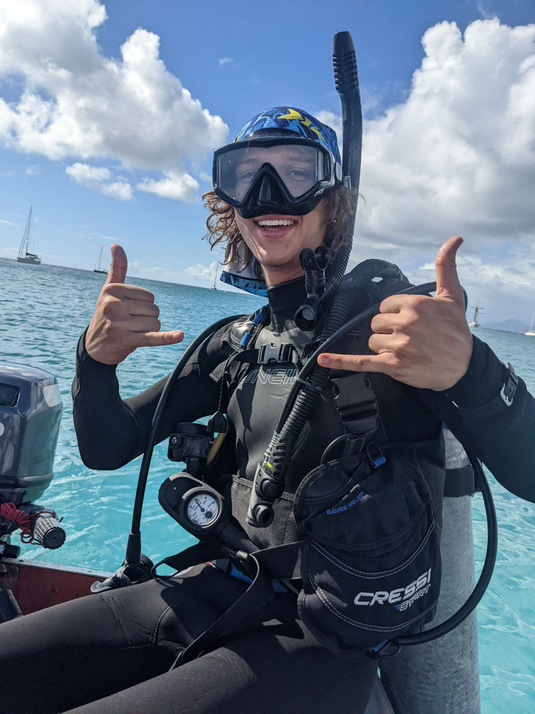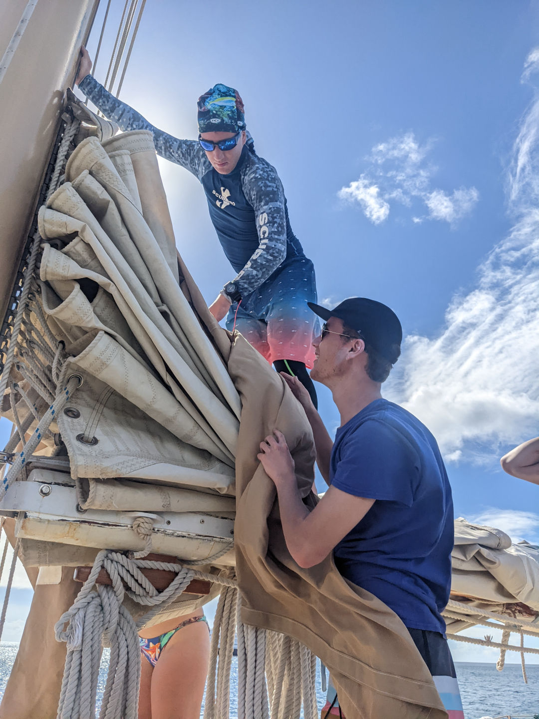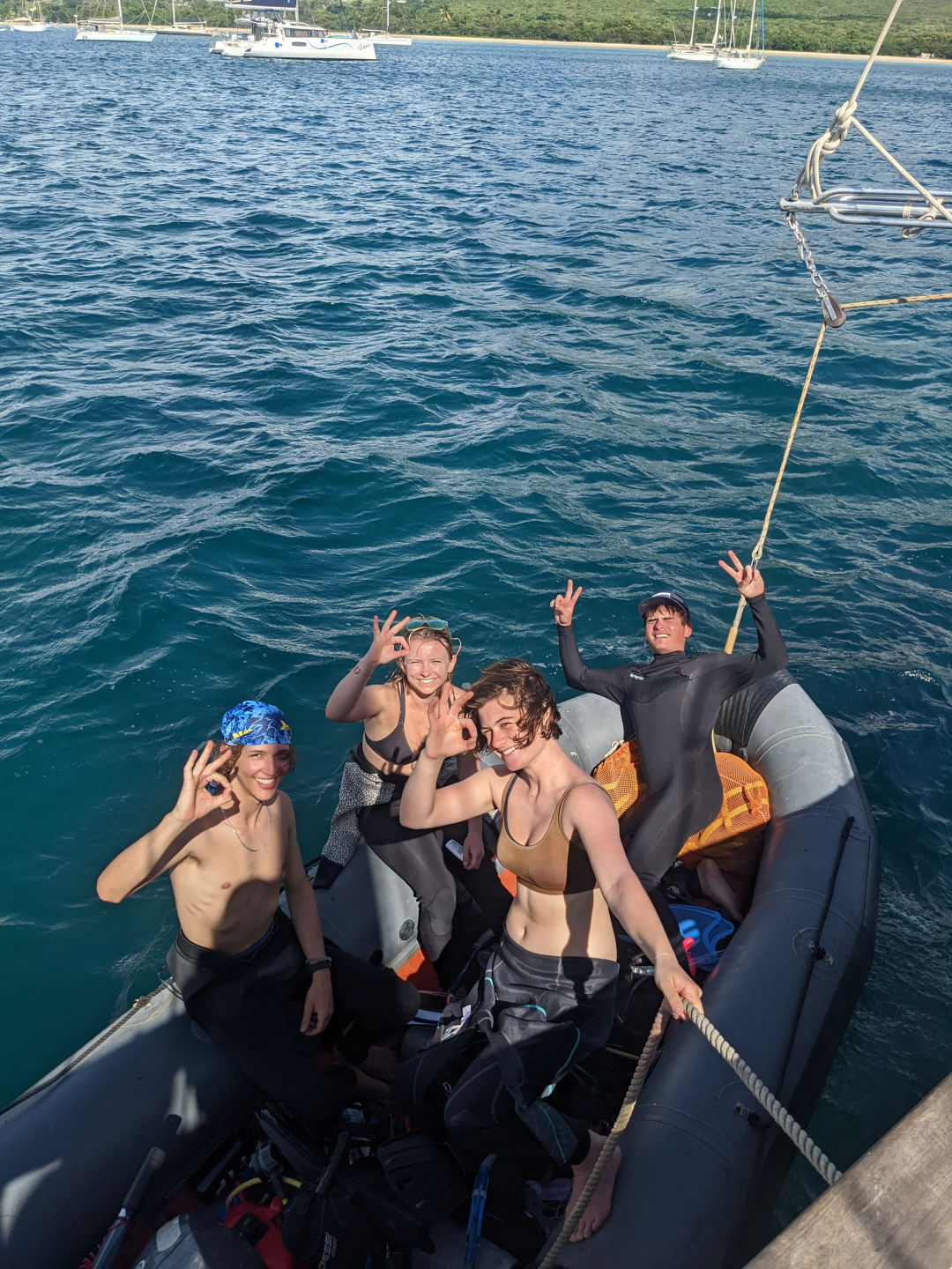 For those of us that aren’t certified yet, we put the boat to bed. At 10 in the morning, kinda weird, in my opinion, to put someone to sleep that early. Basically, what “boat to bed ” means is when we’re done sailing, we have to put all the sails away in their covers and clean up all the things that were necessary for our sail. When we were all done and the certified divers were back, we had lunch. Today for lunch was homemade bread and our choice of toppings for a sandwich. It was my favorite lunch so far. The bread was amazing, so shoutout to Ash, Eva, and Julia for making that. Then half of us, that aren’t certified scuba divers yet took our first dive into the warm ocean. It was such an interesting experience and a good challenge for me personally. We then ended our day with pasta, which was great after a long first dive. And well, that’s kinda all that I can remember from this long day. Until my next skipper shift, goodbye. Also, hi, Mom, Tonka, Aunt Jill, and whoever else reads this; much love.
