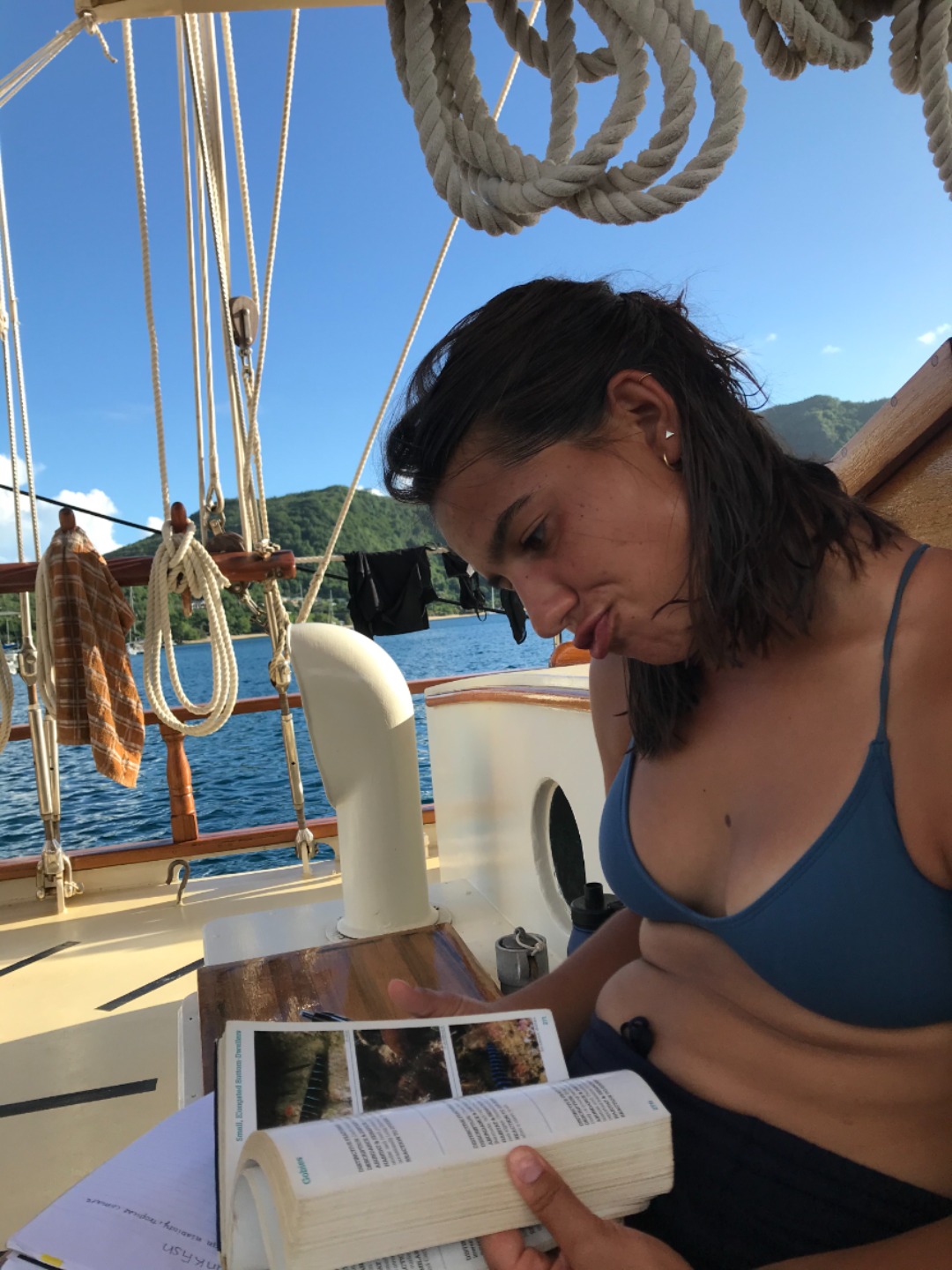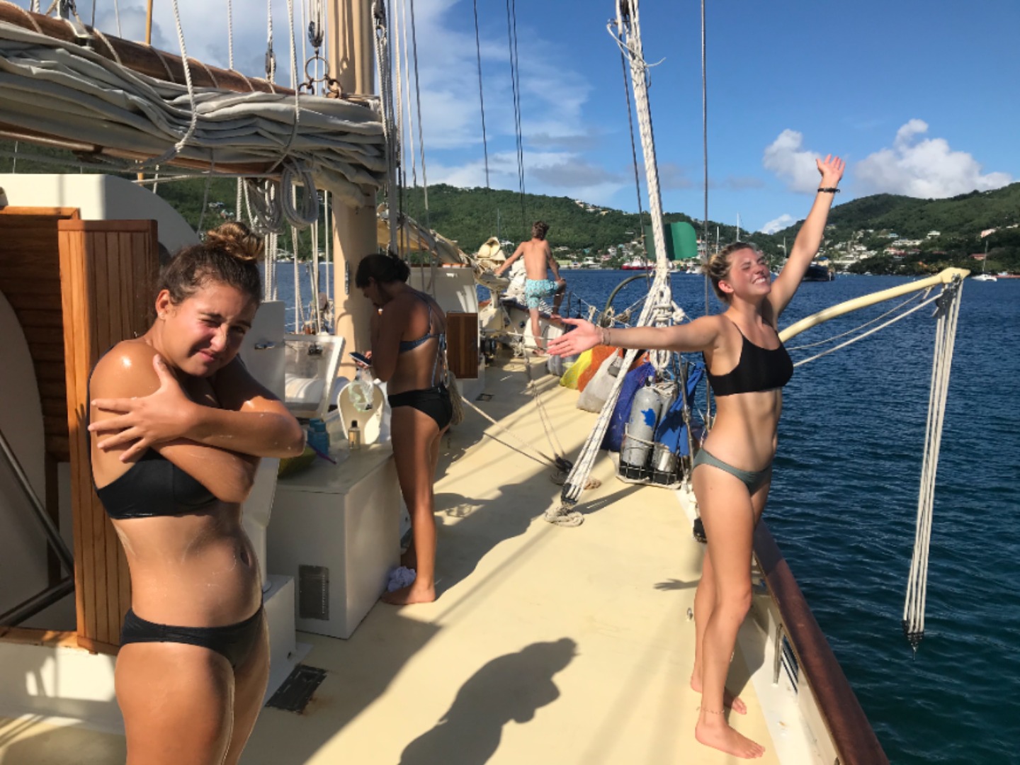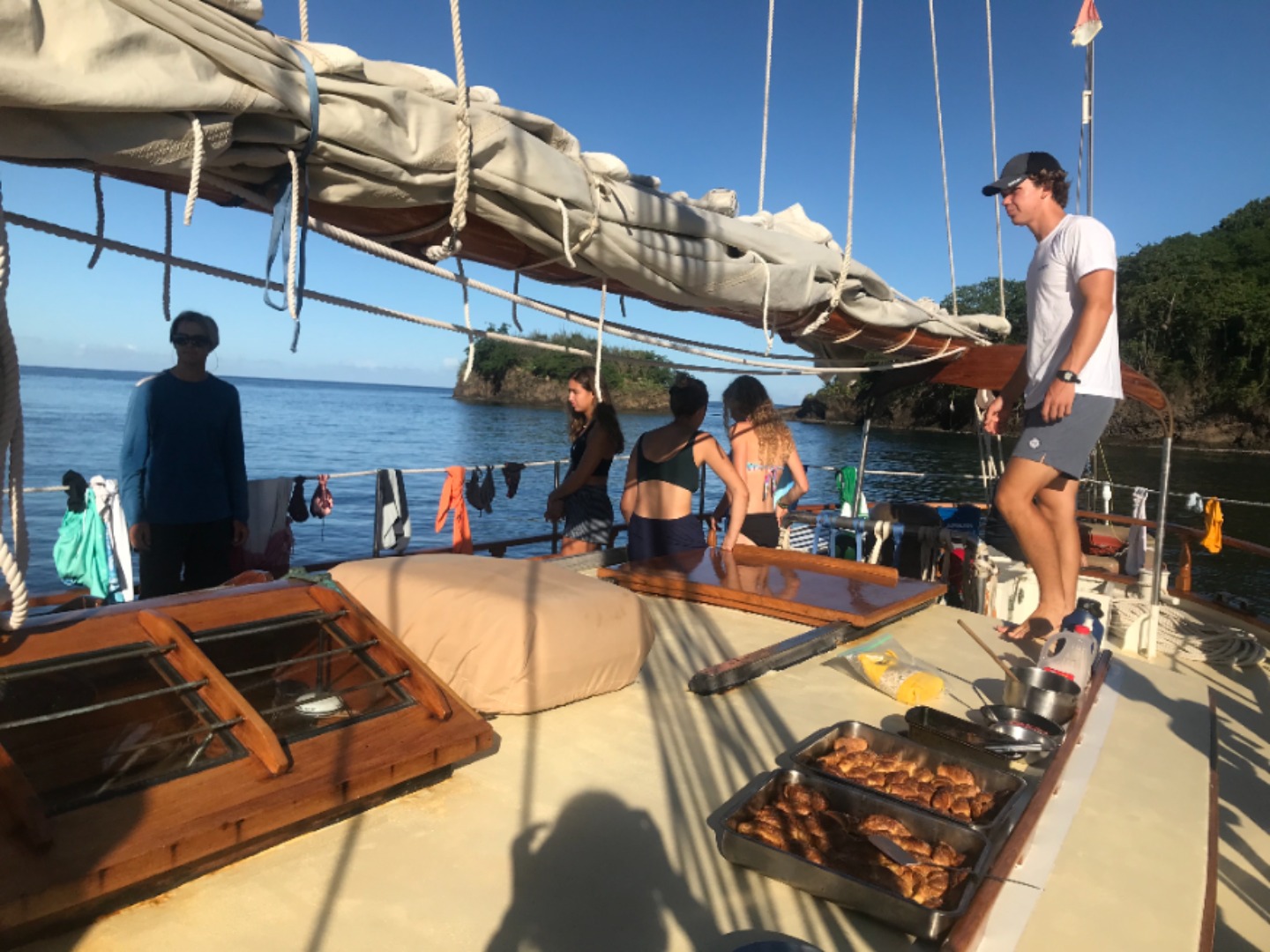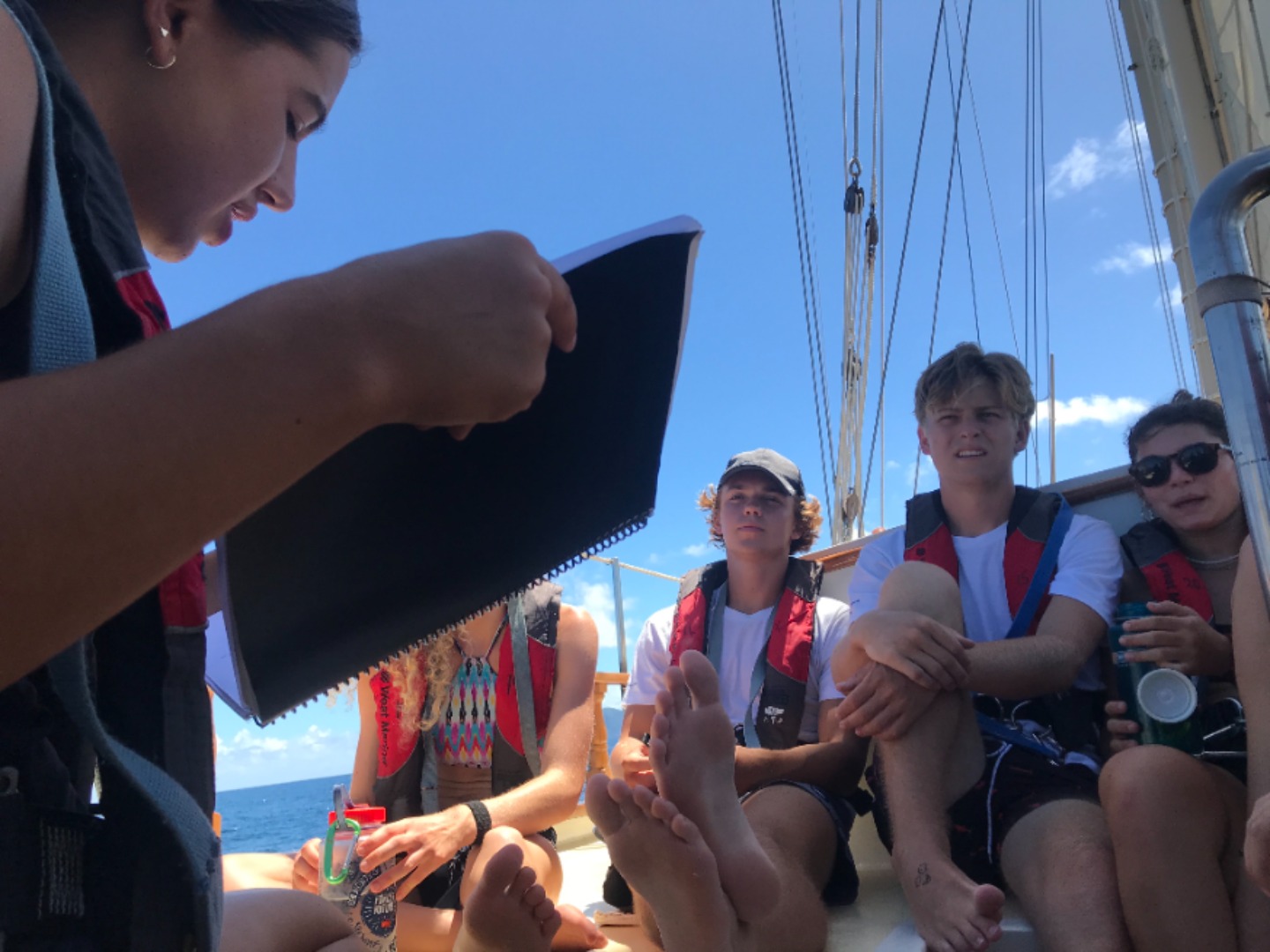 Once the sails were up, and the course was set, we headed down below for Seamanship class. In this class, we received back our dreaded sailing pop-quizzes, which I believe was a learning experience for all. Next time everyone will definitely remember what type of sailboat we are on… Seamanship class was interrupted by the extremely loud fire alarm, so we all sprung into action. I grabbed my big orange lifejacket, Riley got the fire extinguishers, Luke and Mike brought their pillows to block ventilation, and we all headed up on deck to fight the (drill) fire in the Foxhole (Fo’c’sle). While we did a good job getting the fire hose out and ready for action, the fire got so bad that we had to abandon ship (once again, a drill). We talked through how to launch the precious life rafts and which supplies needed to be grabbed from down below. Once we were relieved from the drill, we all relaxed in the cockpit for the rest of the sail. I studied for Oceanography with Julia, Chief, Xonel, Kiara, and Ben while others chowed down on snacks at the bow. We made it to Bequia around 1 and enjoyed a delicious late lunch of Caprese sandwiches. After cleanup, we had Steve’s marine biology class in which we learned about marine reptiles and birds (well, mostly marine reptiles because Steve doesn’t enjoy talking about birds, one thing I completely understand). We had the rest of the afternoon off to study for our upcoming midterms, but the crew did not miss out on the opportunity to go for a quick swim and have a self-care moment. Isa opened an eyebrow, plucking salon while Riley cut her and Mike’s hair. After some more group studying, we all enjoyed Will’s delicious Steak au Poive with Bechamel potatoes and Brussel sprouts. We are all a little tired after many late nights of studying, but spirits are high, and we are excited to explore the rest of the Grenadines!