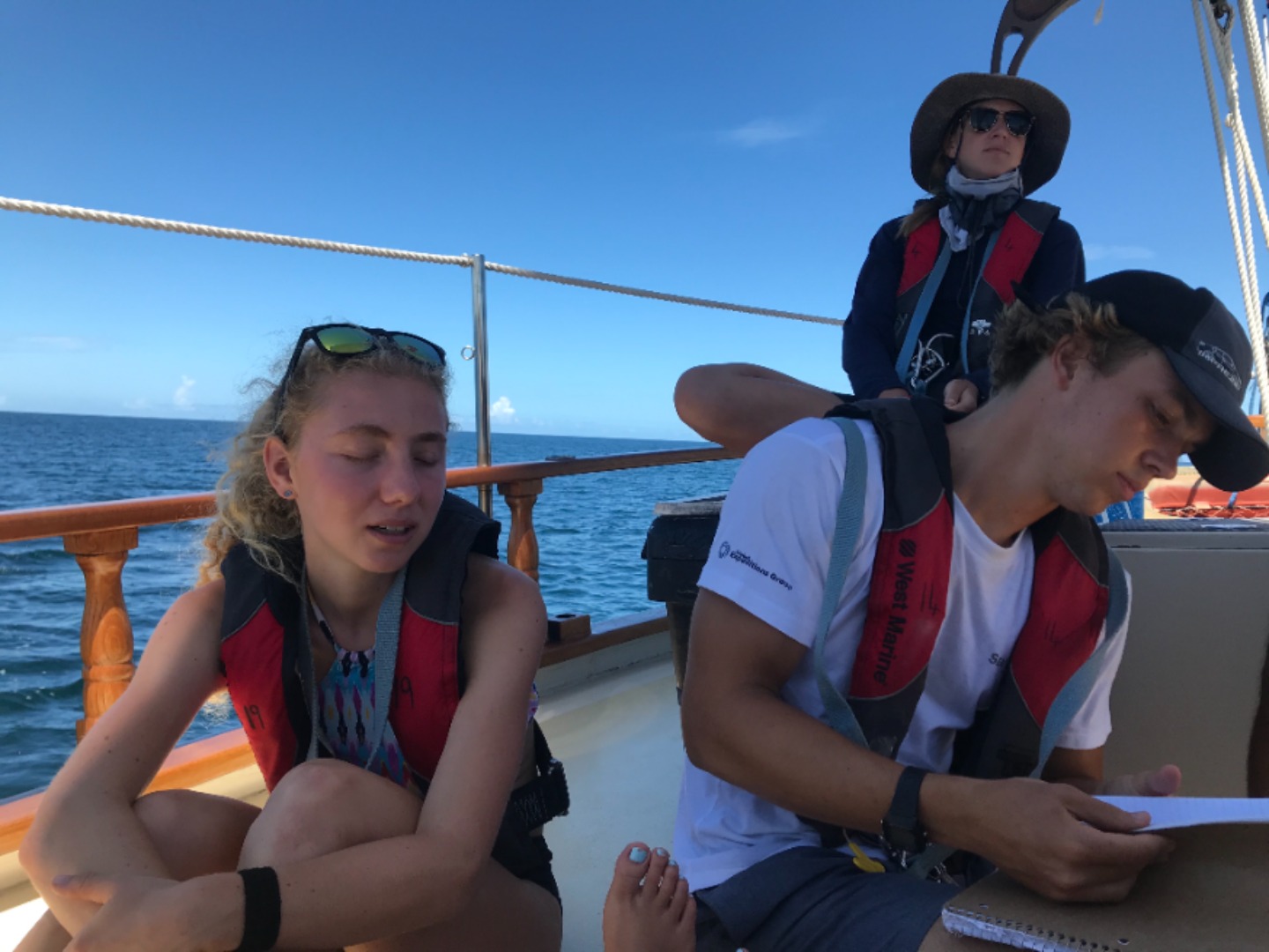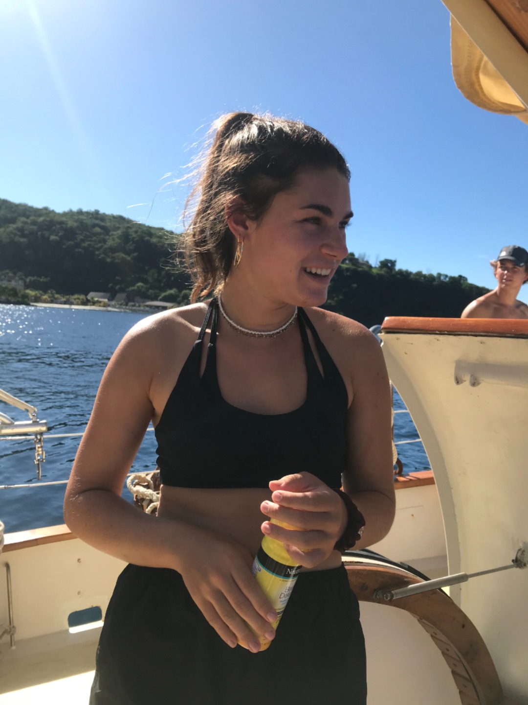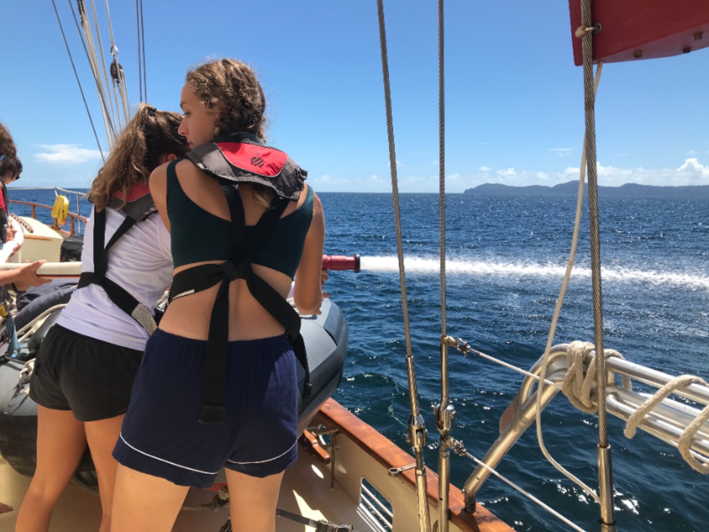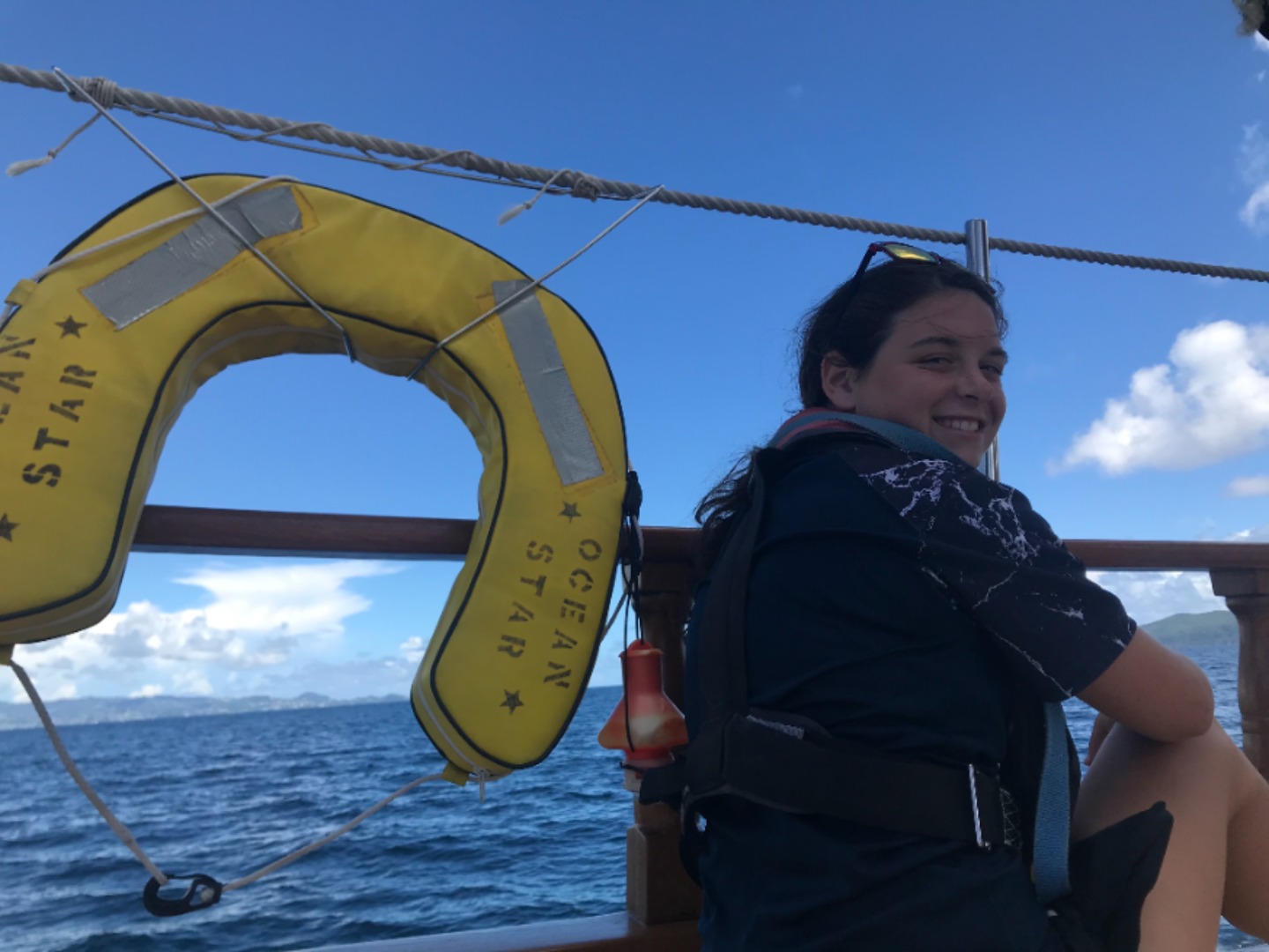 Once the sails were up, and the course was set, we headed down below for Seamanship class. In this class, we received back our dreaded sailing pop-quizzes, which I believe was a learning experience for all. Next time everyone will definitely remember what type of sailboat we are on… Seamanship class was interrupted by the extremely loud fire alarm, so we all sprung into action. I grabbed my big orange lifejacket, Riley got the fire extinguishers, Luke and Mike brought their pillows to block ventilation, and we all headed up on deck to fight the (drill) fire in the Foxhole (Fo’c’sle). While we did a good job getting the fire hose out and ready for action, the fire got so bad that we had to abandon ship (once again, a drill). We talked through how to launch the precious life rafts and which supplies needed to be grabbed from down below. Once we were relieved from the drill, we all relaxed in the cockpit for the rest of the sail. I studied for Oceanography with Julia, Chief, Xonel, Kiara, and Ben while others chowed down on snacks at the bow. We made it to Bequia around 1 and enjoyed a delicious late lunch of Caprese sandwiches. After cleanup, we had Steve’s marine biology class in which we learned about marine reptiles and birds (well, mostly marine reptiles because Steve doesn’t enjoy talking about birds, one thing I completely understand). We had the rest of the afternoon off to study for our upcoming midterms, but the crew did not miss out on the opportunity to go for a quick swim and have a self-care moment. Isa opened an eyebrow, plucking salon while Riley cut her and Mike’s hair. After some more group studying, we all enjoyed Will’s delicious Steak au Poive with Bechamel potatoes and Brussel sprouts. We are all a little tired after many late nights of studying, but spirits are high, and we are excited to explore the rest of the Grenadines!