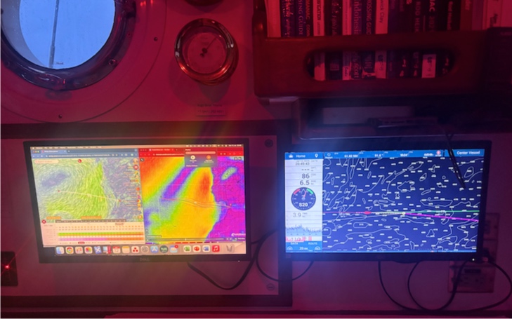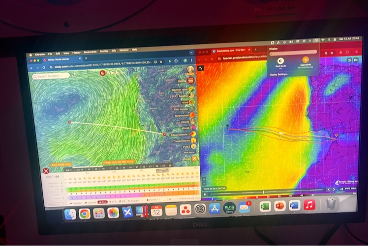 Hello, this is Nick now. My day was average. It started around 9:30 in the morning. I went down to the engine room to check the oil level in the main engine, which has been pushing us along reliably for a few weeks now. Then I went to check the weather. For those of you wondering what weather forecasts to look at to tell what your son or daughter is currently experiencing. I usually look at the ECMWF and GFS models on a site called Windy. You can take the coordinates of the vessel off the “vessel tracker” on the semester page, and plug those into Windy, and choose between a litany of weather overlays including wind, primary and secondary swell, currents, pressure, temp, etc, and see what’s currently happening in our part of the world. I also use Predict Wind weather routing, and NOAA Hurricane Center, who provide a lot of useful graphics for the northern Atlantic for those who know how to read them. If anyone is wondering “why is the boat zigzagging over the past few days” or “why did the boat head North towards Bermuda for 5 days when the Azores are over there?” If you follow along with a weather app, you will kind of see how I try to avoid areas with unfavourable conditions and head towards areas with more favourable conditions. Currently, im expecting a high-pressure system from the North West to bring us Northerly winds by tomorrow morning-ish. So I positioned the boat more to the North to hopefully take advantage of that system earlier and for longer, which is why I had the boat heading to Portugal for a day instead of Gibraltar. Thus, the zig-zag on the Vessel Tracker. With the previous passage from BVI to Bermuda, that’s a tougher one. SO basically, you have a high-pressure system that sits right in the middle of the Atlantic, called the mid-Atlantic high. And a characteristic of high pressure is usually in the centre of them; there is little to no wind. So typically you have to sail around them, thus a typical route from the Caribbean brings you up North of Bermuda, then you turn there towards the Azores and approach from the NE. See the wind and current move around the North Atlantic Clockwise. North with the Gulf-stream on the East coast of the US, then it turns East up by the Coast of Nova Scotia, then turns South off the UK and Europe, to finally turn back West off the coast of Africa with the trade winds, North of the Equator. This motion of the Atlantic Gyre is generated by the rotation of the Earth called the Coriolis Effect, which is responsible for all the weather patterns on Earth, and the reason why toilets flush clockwise in the Northern Hemisphere and counter-clockwise in the Southern Hemisphere. The North and South Atlantic Gyres also do this. But this year, about 2 days out from Bermuda, the plan changed. ~right around day 9ish, a tropical depression formed about 300nm ENE of Bermuda. This system was moving NE at about 10kn, so not a danger at all to us. What it did do is take all the wind with it.. So the first few days we sailed out of BVI, we had the trades on our Starboard beam, then as we got North, the wind went behind us and weakened substantially, as we were in the E quadrant of the gyre. Then, when that system sucked all the wind out from North of us, I made the decision to turn and go straight for the Azores. Because there was no point in spending more time going motoring North just to motor East, when I can just turn the boat and start motoring East now. Thus, the 14 days of straight motoring we had from the BVI to the Azores. I’m more optimistic about this passage; however, I think we will be sailing by tomorrow morning (July 13th). You should always take the forecasts with a grain of salt when doing stuff like this, because the weather forecasts are exactly that, a forecast. Humanity’s understanding of weather forecasting, after all these years of study, is boiled down to a (often incorrect) educated guess, assisted by iffy computer-generated models and satellite imagery. Anywho, the rest of my day was spent adjusting a watertight door, transferring fuel between tanks, and watching SpongeBob. After that, we had dinner, which was a pork chop stir fry thing, which was delicious. I usually do this squeeze thing where at the end of the squeeze I say “rock paper scissors tournament, and to the winner I’ll take your cleanup job,” which sounds like a nice skipper of the day thing to do when you are skipper of the day. But really, it’s my ploy to do anything except write the blog because im not a fan of writing, and I’ll usually take whoever won and make them come write the blog, while I go do their cleanup job. Which is why you had Lanie for the first part of this blog. But Meg (the program manager) wasn’t having any of my shenanigans, as per usual, thus you got me typing in run-on sentences about the weather for the second half. I took some cool pictures of the chart house and all the navigation instruments, for those of you who are nerds like me, enjoy. The End.