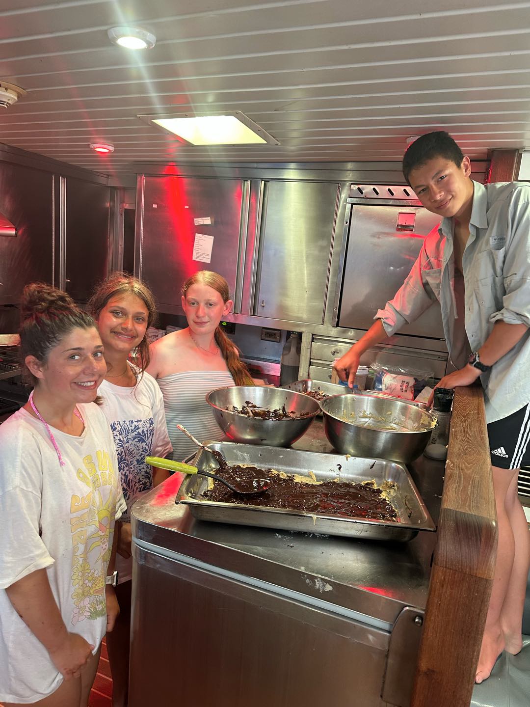 Right now, it’s Lanie writing the blog, but Nick should be back shortly. Today started early with watch team 2 of the 12-4 am shift. Watch team three, then proceed after them from 4-8 am. Charlie, one of our watch team leaders, was feeling a little under the weather, so we were very nice to him, most of us. Henry and Greyson skipped his entire queue of songs, but other than that, we were very sweet to him. Brady helmed and kept the boat very straight so that hopefully we will be able to get to Gibraltar faster. Our king Zac started bright and early fixing ALL of the heads. He slayed it up in the head bilge all the way up until dinner time. Alex, Macie, and I may (or may not) have caught him taking a short little break to watch TV in the bilge. When I woke up this morning to do laundry, all of the heads except for the port forward were not able to be used, which was rather scary. Thankfully, Zac always fixes up the heads without complaint because there’s NO way any of us could do that. Anyways, Watch team 1 had the 8-12 shift where they cleaned the stern of the boat. For lunch today, we had chickpea ceaser salad wraps, which were to die for. I don’t even like chickpeas, but those things were amazing. Mimi, Logan, and Lizzy were our superb chefs for the day. Unfortunately for the rest of the boat, Brig, Alex, and I have to chef up tomorrow, and I do not see that going too well