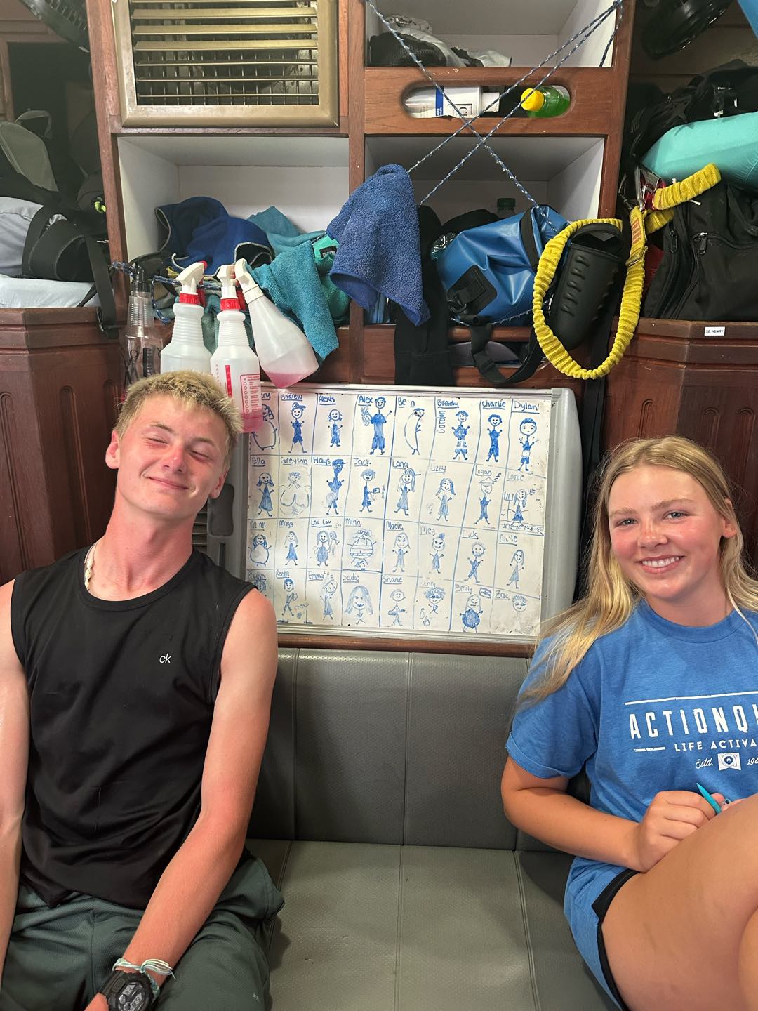 After lunch, we had seamanship class, which we started off by taking our VHF exam. They were multiple choice, so they weren’t very hard, thankfully. That took about 20 minutes, AND THEN we made a TikTok. There’s this boat TikTok dance that we had a competition for. We narrowed it down to Jack, Hayes, and Brady. Eventually, we chose Brady, who then got on the bow sprit of the boat, and Shane got out the drone. All of the rest of us got some sort of rowing appliance to row in the background of the video while Brady danced. It took a few takes, but we eventually got it down, and it’s supposed to look really good.