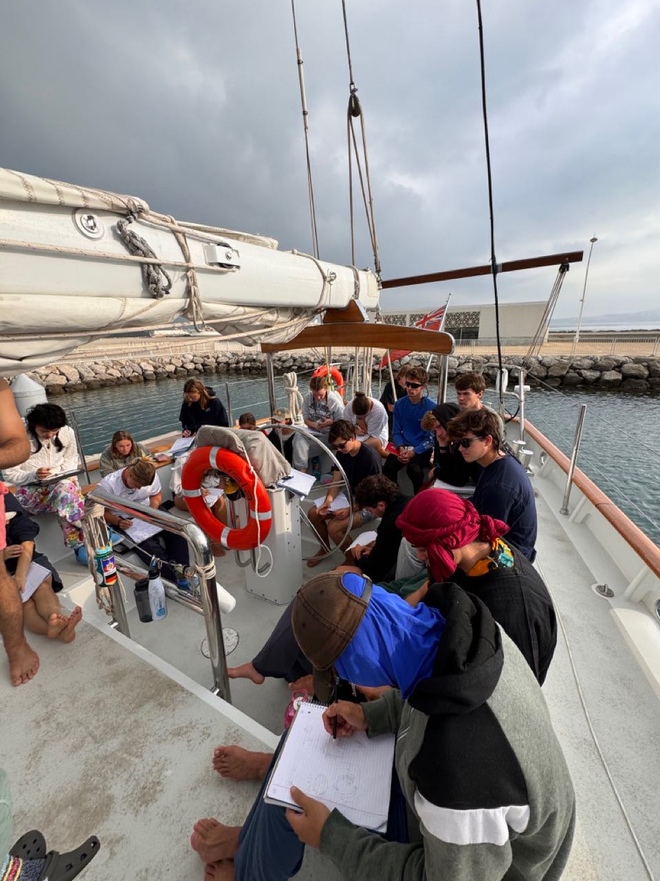After breakfast and clean-up, we did passage prep for an hour, which tested our sail-raising skills. We dogged hatches, topped booms, and put in storm boards for our two-day passage ahead. After passage prep, we had oceanography with Mich up on deck. We learned about the different layers of the Atmosphere, and then, towards the end of the class, we experienced the different layers as rain landed on our papers and smeared our ink.