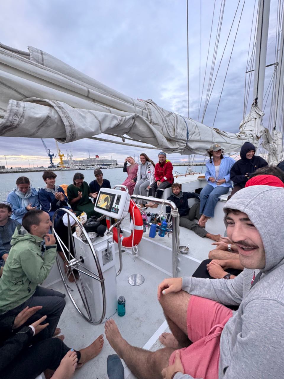 Hey y’all! For those of you who need a refresher, we are still in Tangier. However, we will be leaving on a passage in the next hourgiven that Moroccan customs let us goheaded to Essaouira. Let’s talk about other news today! This morning started with a full-volume display of Creedence Clearwater Revival’s Fortunate Son paired with electronic gunshots and flashing lights from my toy gun. I thought wake-ups were going pretty well until Luke (a 270lb rugby prop) freaked out and launched me into the ceiling above his bed. It was a good battle, but in the end, I think the ceiling won. Afterward, we had a great apple-oatmeal breakfast provided by Audrey and her Sous Chefs, Dan & Claire.