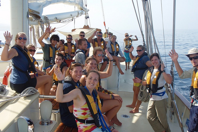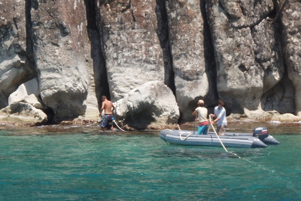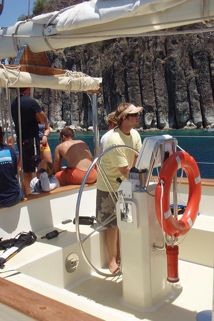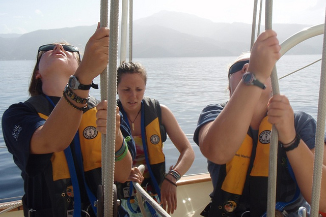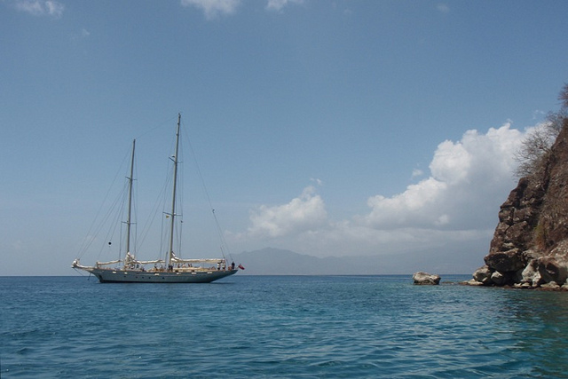 Today, we left the gorgeous island of Dominica and set sail for Pain de Sucre, an island in Les Saintes. Upon arrival, we navigated our way through two towering islands to where our new home would be (our anchorage). This new anchorage entitled us to a new type of anchoring style called Mediterranean-style docking/mooring, where we dropped the anchor off the boat and backed up to the shore, where we ran a stern line to the island and pulled tight. This would allow us to avoid going farther or closer from the island and would give us primo locations/safety spots for scuba diving. Once we were all secured, the crew went into a little Boat Appreciation and started scrubbing and polishing Argo. Let me just say she looks mighty FINE! This new location permitted us to do our first-night dive off of Argo, which was pretty epic. Most of the students have barely ever dived before, let alone diving at night. So, the experience was very new and exciting for most of us. Half the students went tonight, and the rest will continue to go tomorrow night due to the number of flashlights and safety protocols. One of the coolest creatures that were spotted on the dive was an Octopus, which excited shipmate Spike Stone due to the fact that he has a sick (cool) tattoo of an Octopus on his torso. Well, it’s time for bed since everyone is so tired from a full day of excitement.