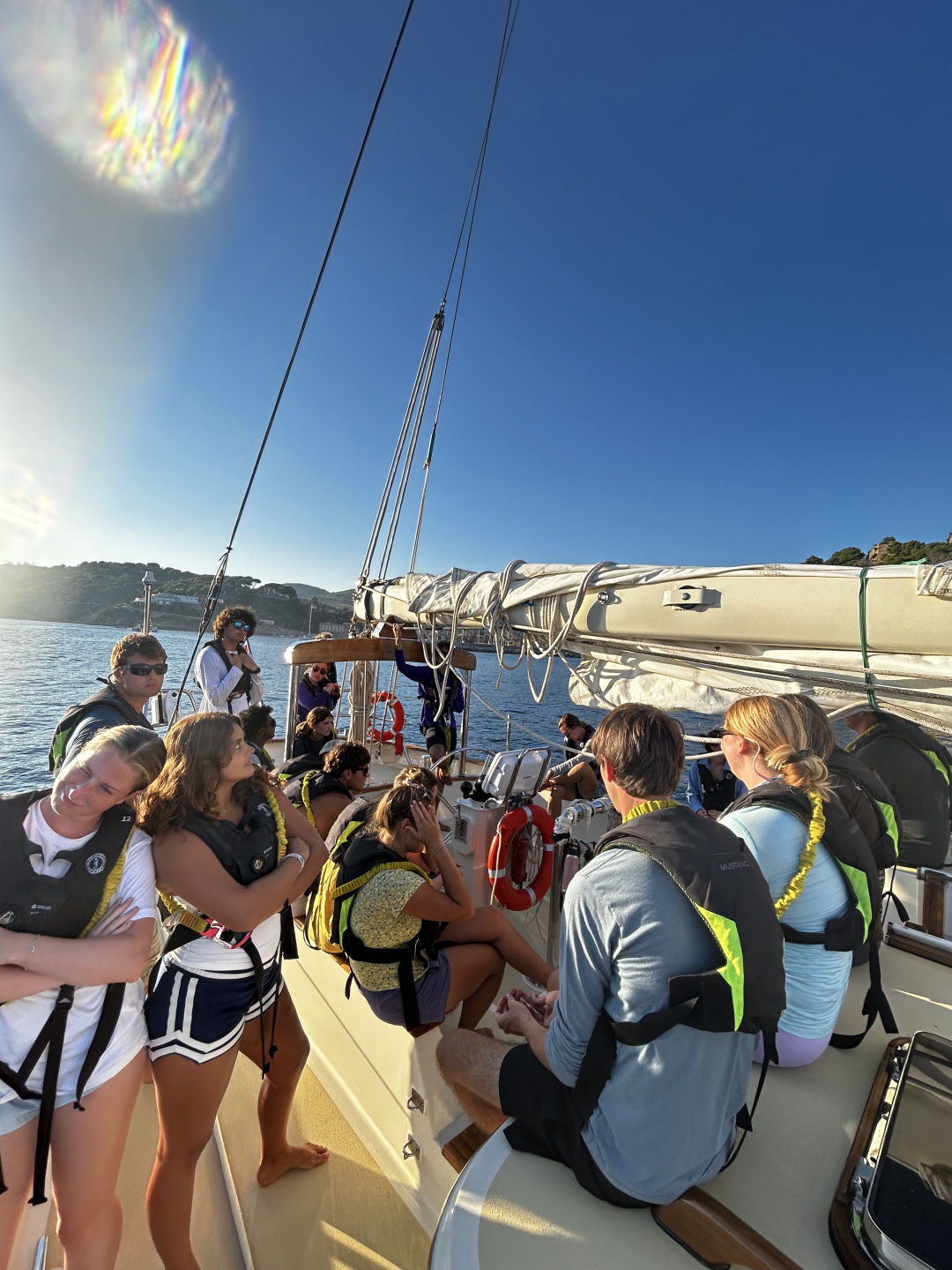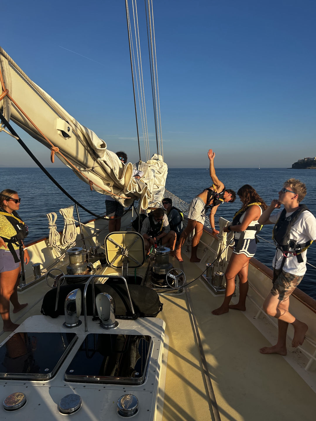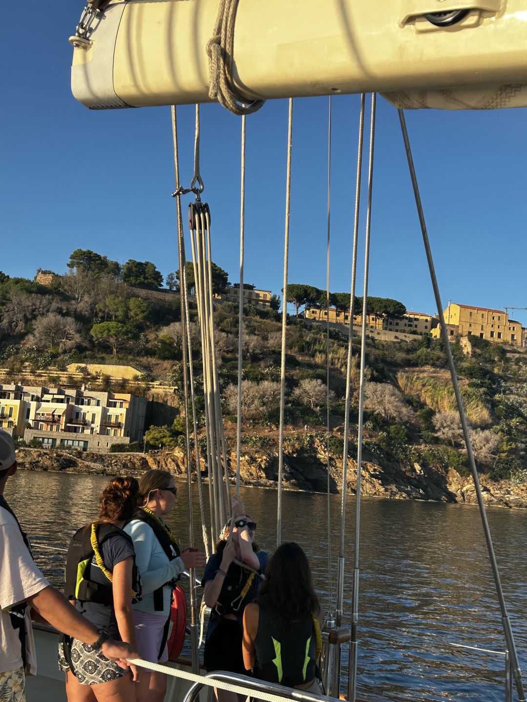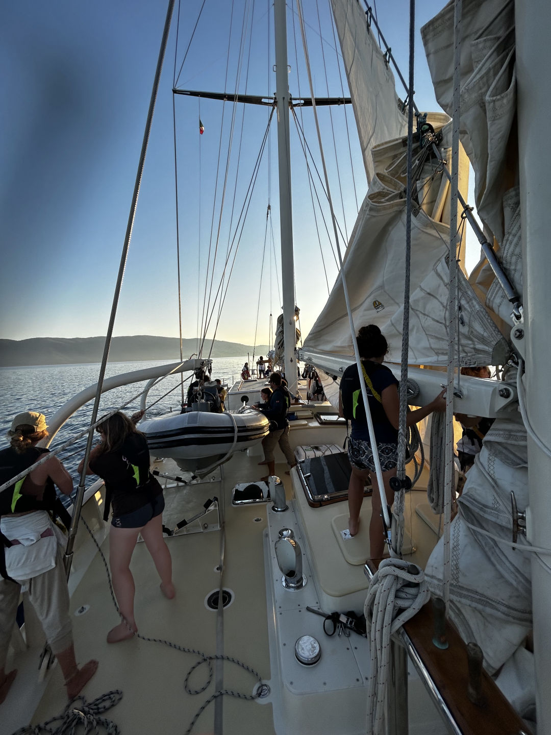 Today, I had to wake everyone at 7 am for some early morning scuba diving-this was our last test before getting our certification, so we were all super excited to get in the water! After two hours in the water, we were all finally scuba-certified!!! When we got back to Argo, the already certified people had gotten Argo ready to get underway. This time, it was going to be a night sail under the beautiful night sky, which meant that after six long days in Elba, we finally got to raise the sails! We had At 5 pm, we were underway and sailing again, but out of nowhere, Stick threw a boat fender into the water, whose name apparently was Cedric. So now we had a man overboard situation, so we had to drop all the sails back down, launch Nopadone in the water, and get Cedric before he drowned; I won’t lie to you, it was chaotic. We really did not know what to do. After about 10 – 15 minutes, we finally managed to get Cedric back on the boat. Once Cedric was nice and warm again, we raised the sails back up again and got back to sailing.